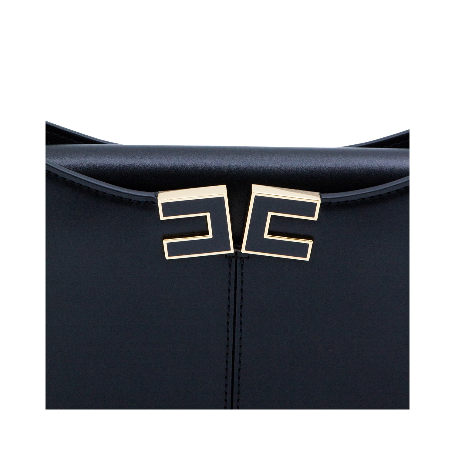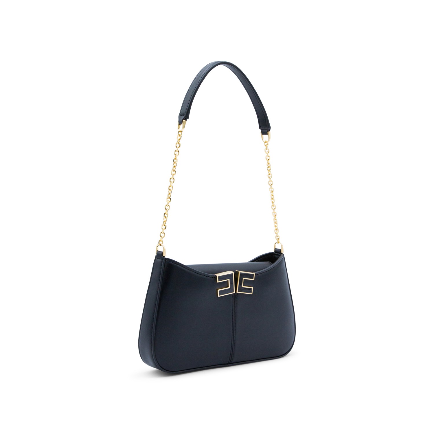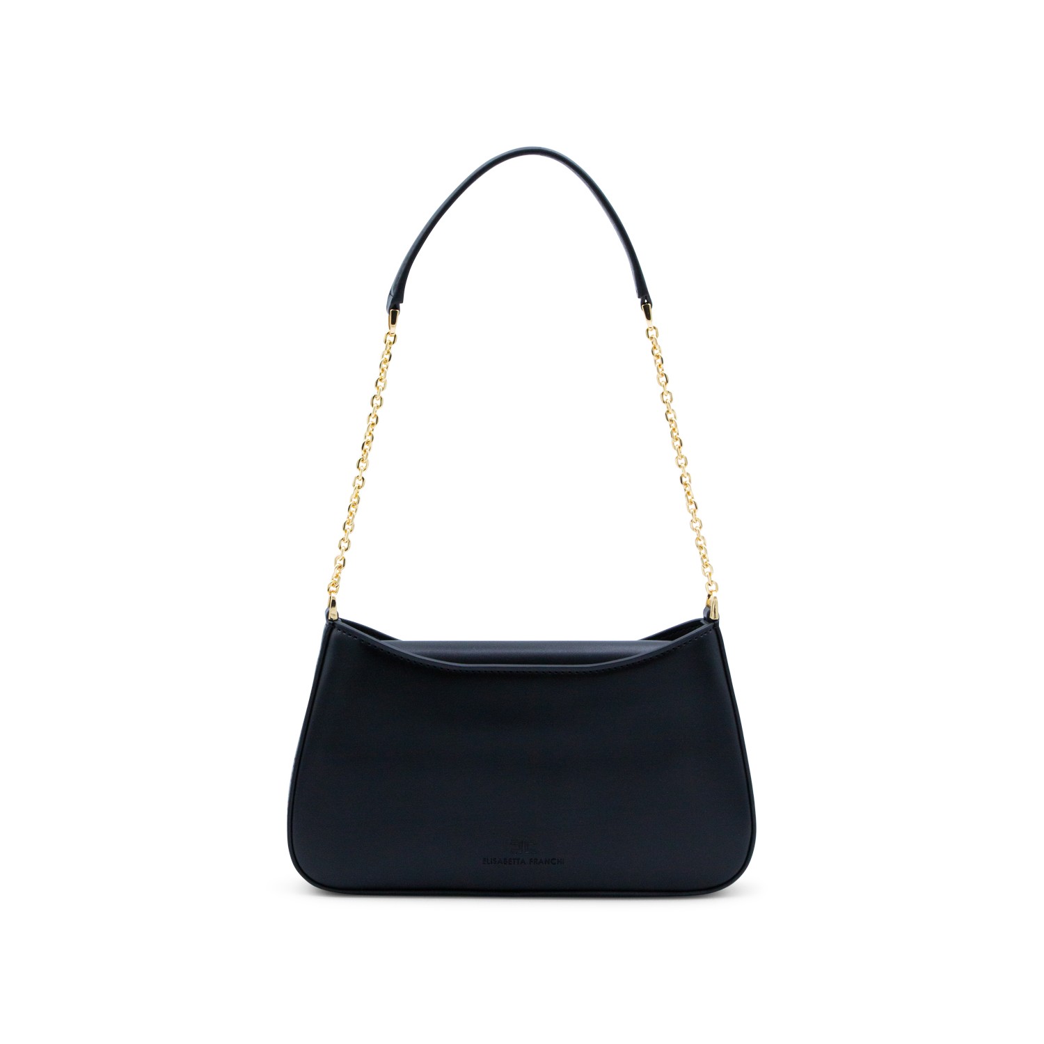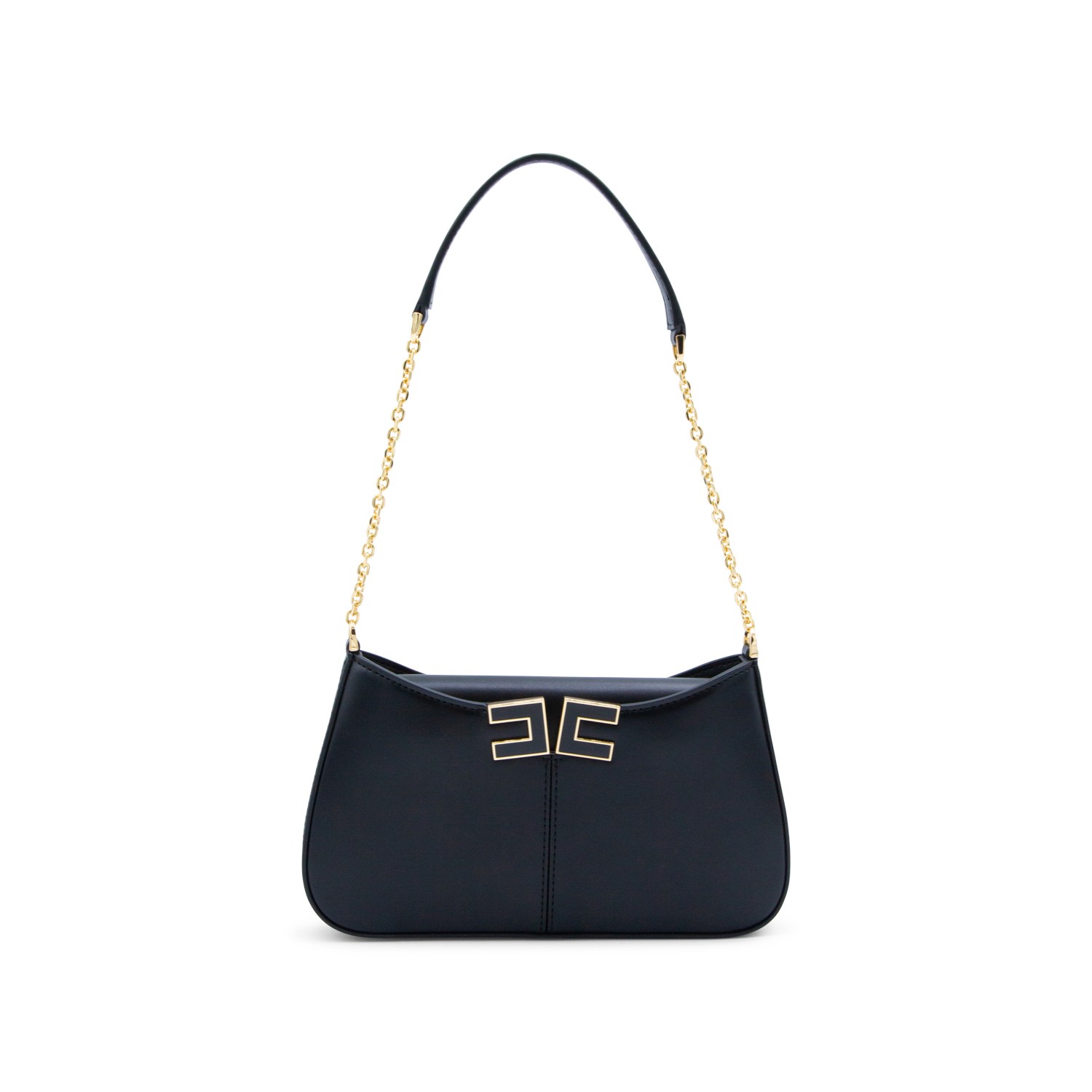 Black shoulder bag from Elisabetta Franchi featuring chain shoulder strap, zip fastening, gold tone hardware, frontal logo, main compartment and pocket.