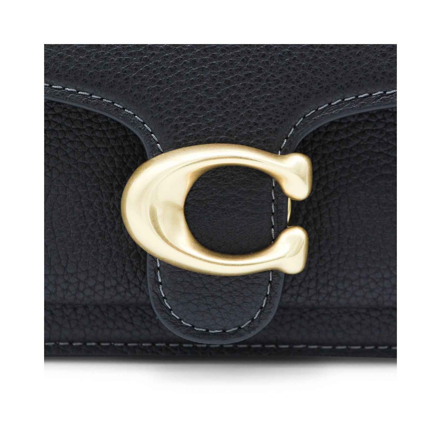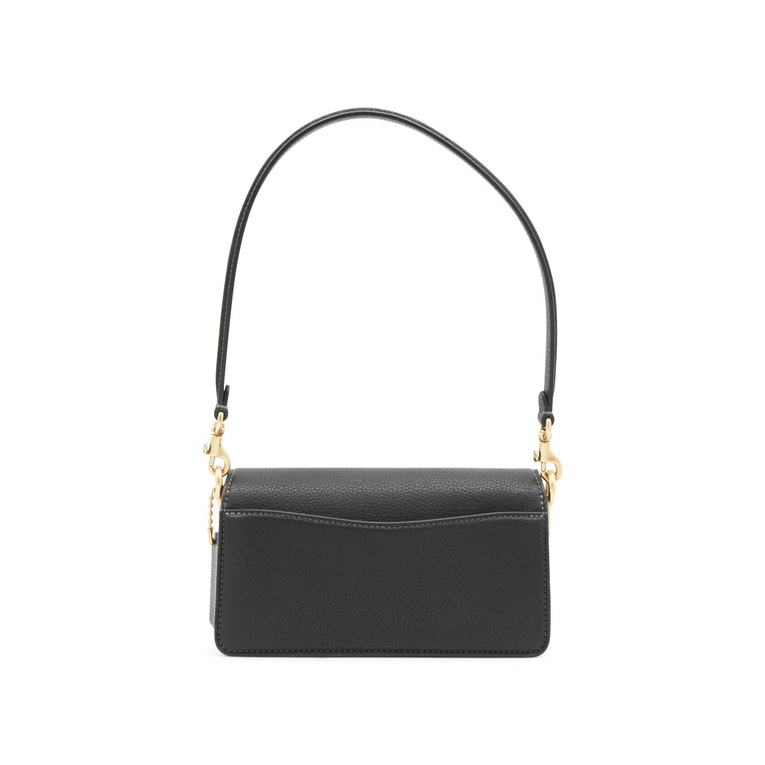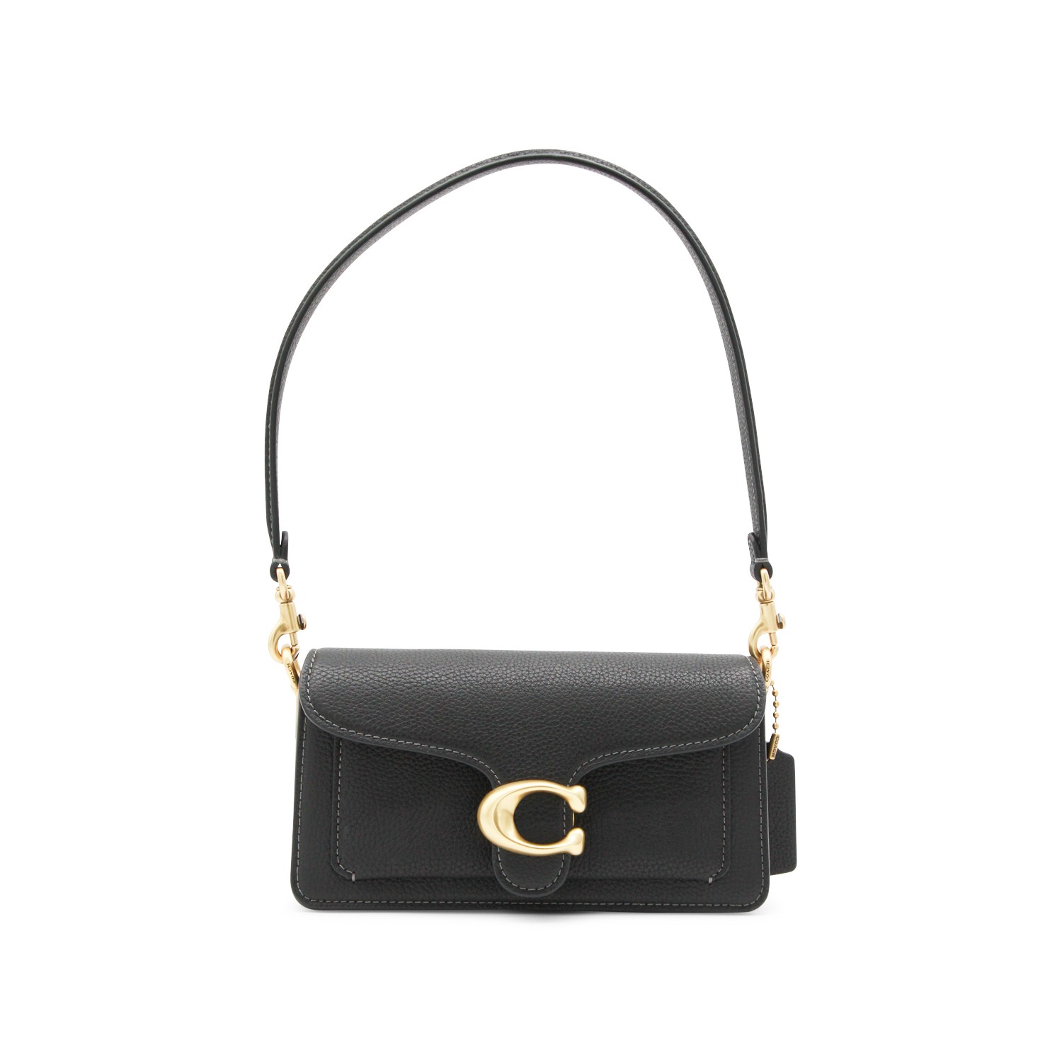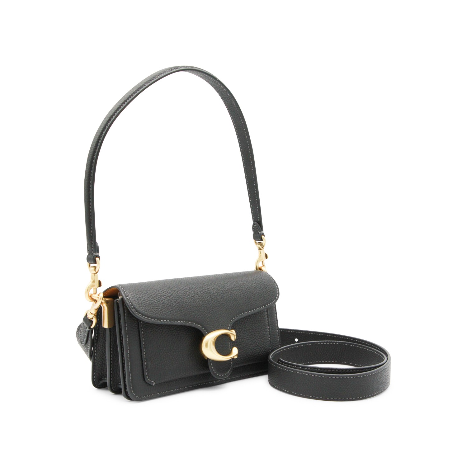Black leather Tabby shoulder bag from Coach featuring removable top handle, magnetic fastening, frontal logo, gold tone hardware and main compartment.