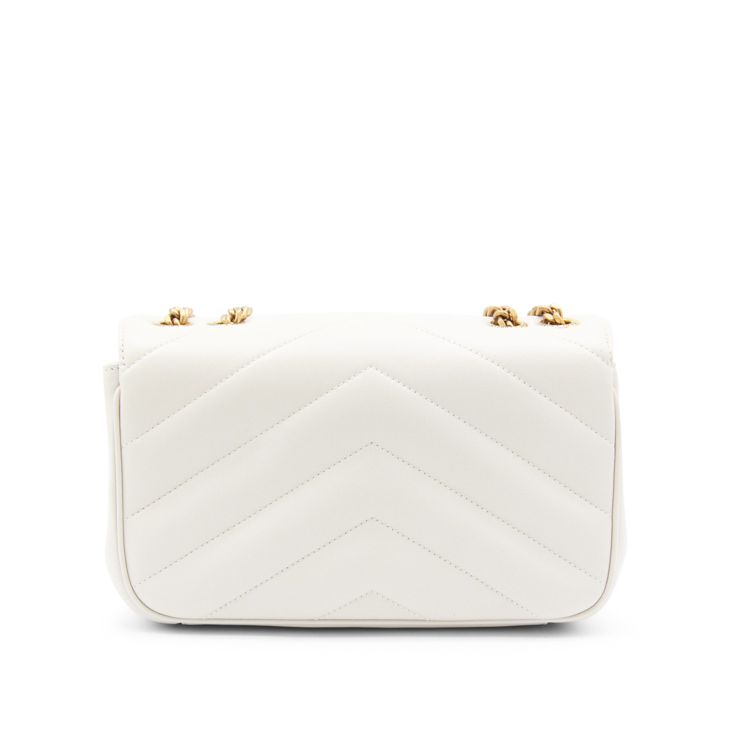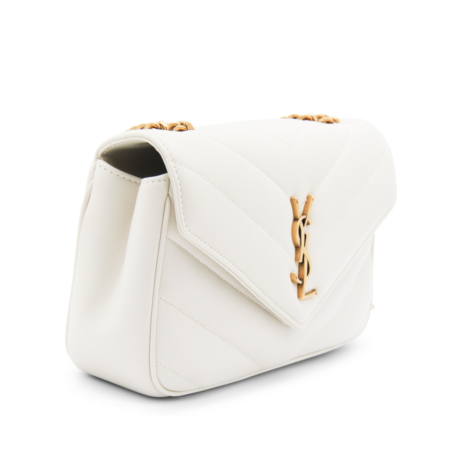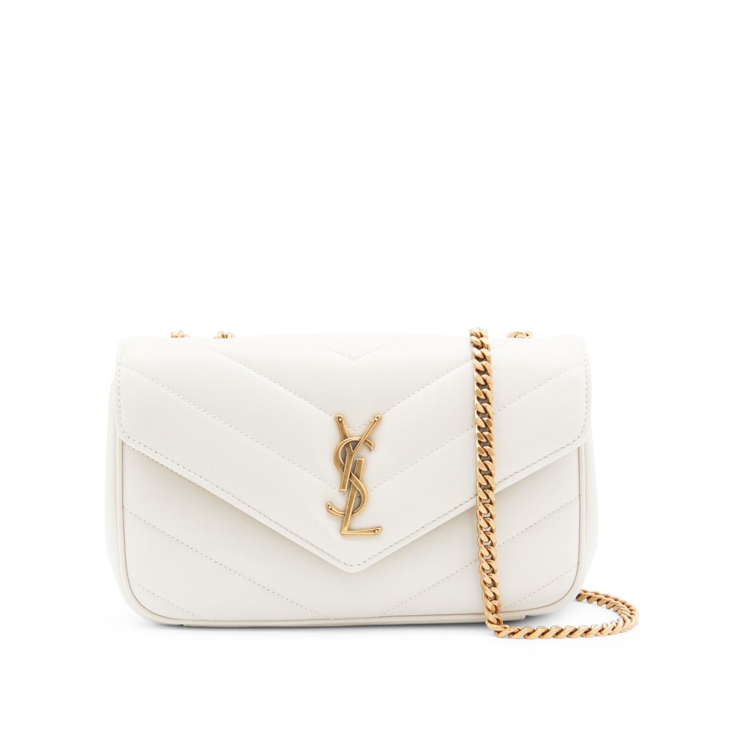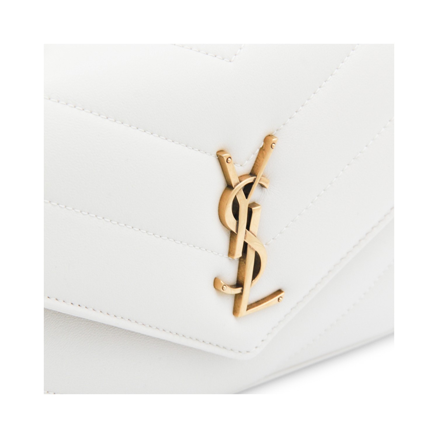 White leather LouLou shoulder bag from Saint Laurent featuring chevron motif, gold tone hardware, magnetic closure, sliding chain strap, main compartment and flat pocket.