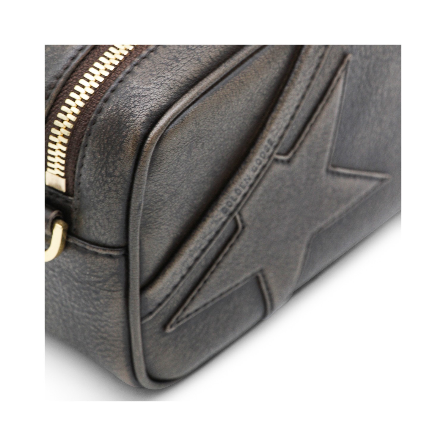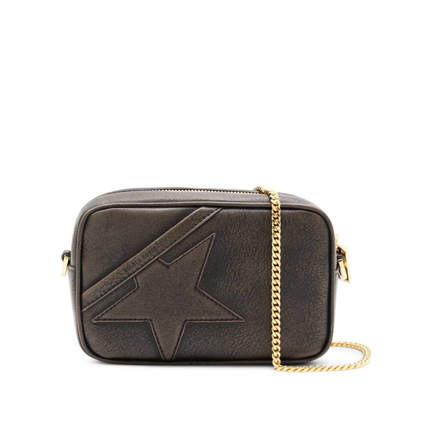 Dark brown leather crossbody bag from Golden Goose featuring removable chain, zip fastening, main compartment, frontal star patch and gold tone hardware.
