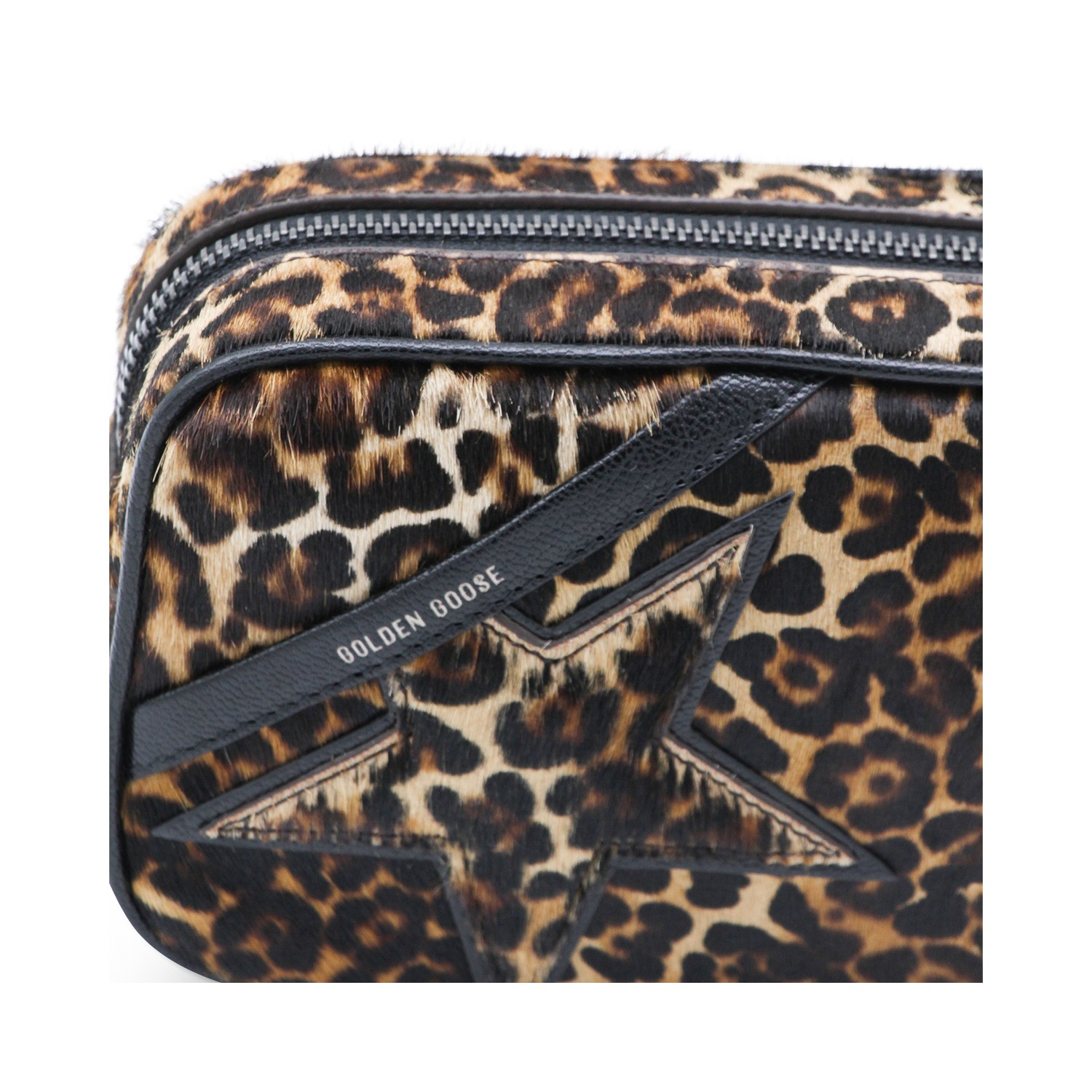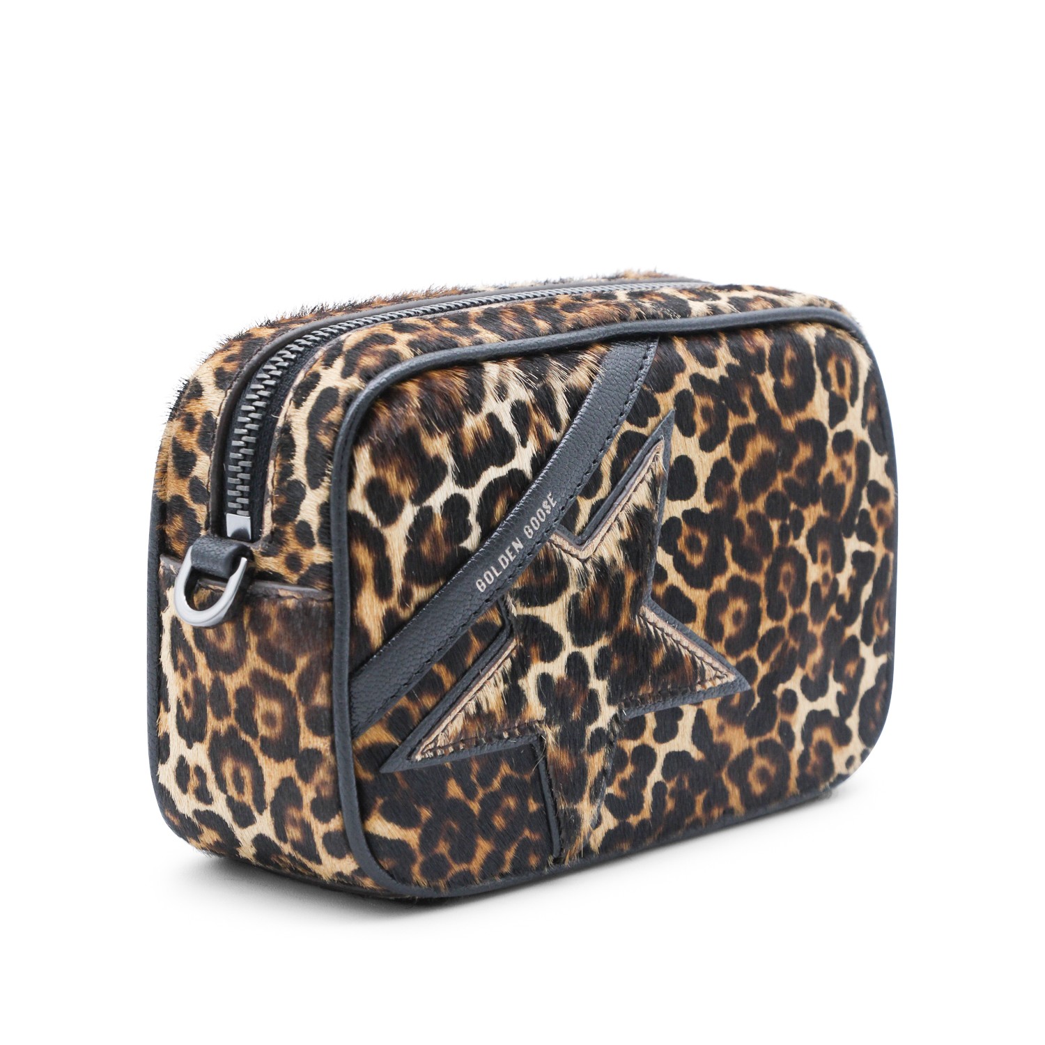 Leopard leather crossbody bag from Golden Goose featuring rectangular shape, chain link strao, leopard pattern, zip fastening and main compartment.