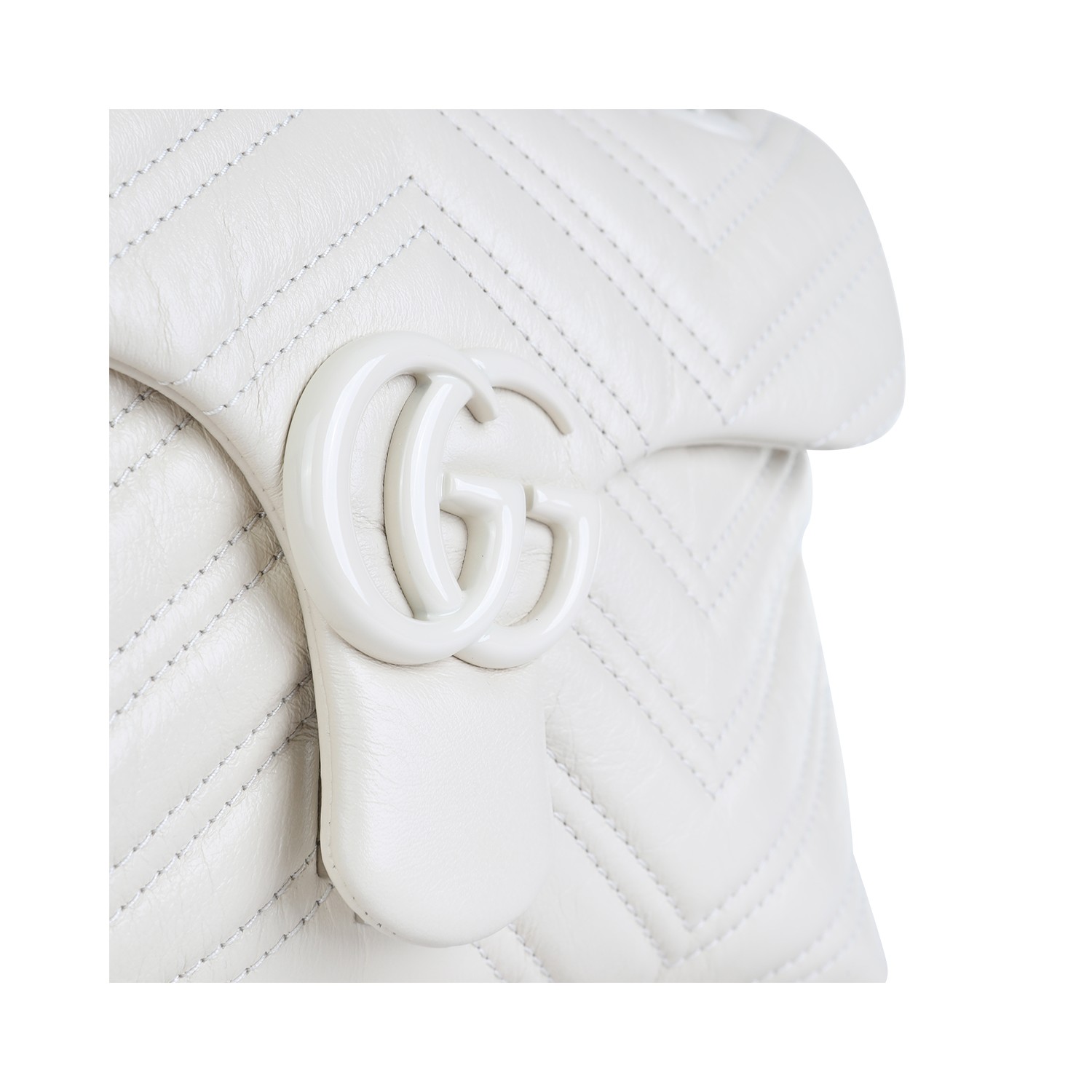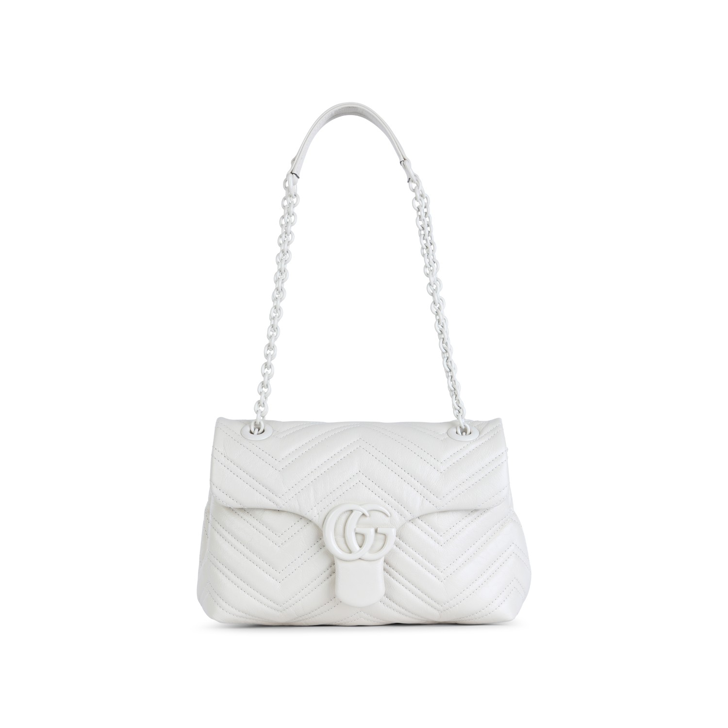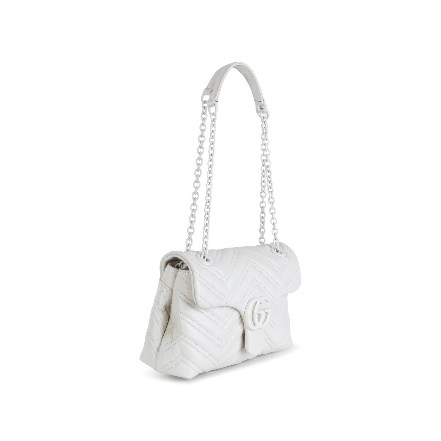 White leather Marmont shoulder bag from Gucci featuring white tone logo hardware, adjustable shoulder chain, main compartment and magnetic button closure.