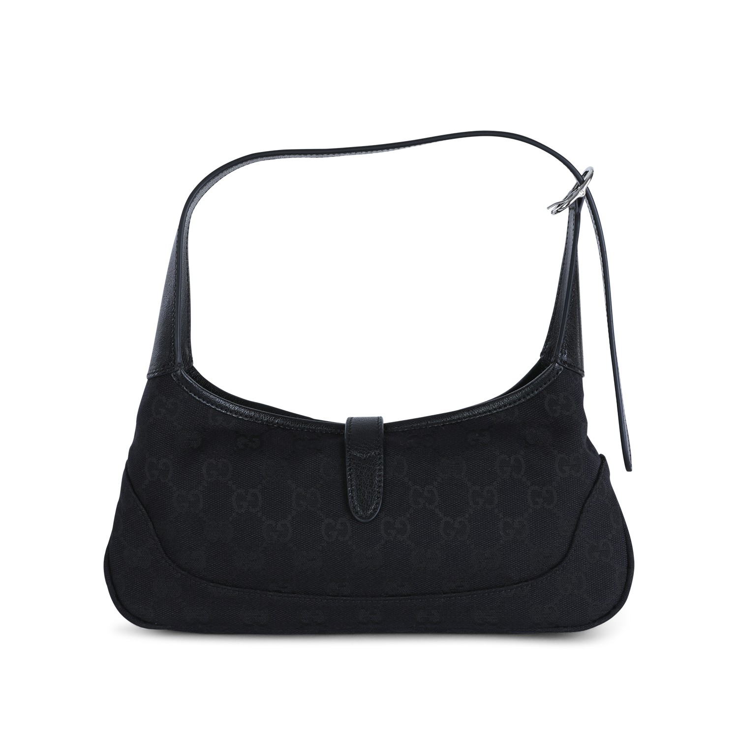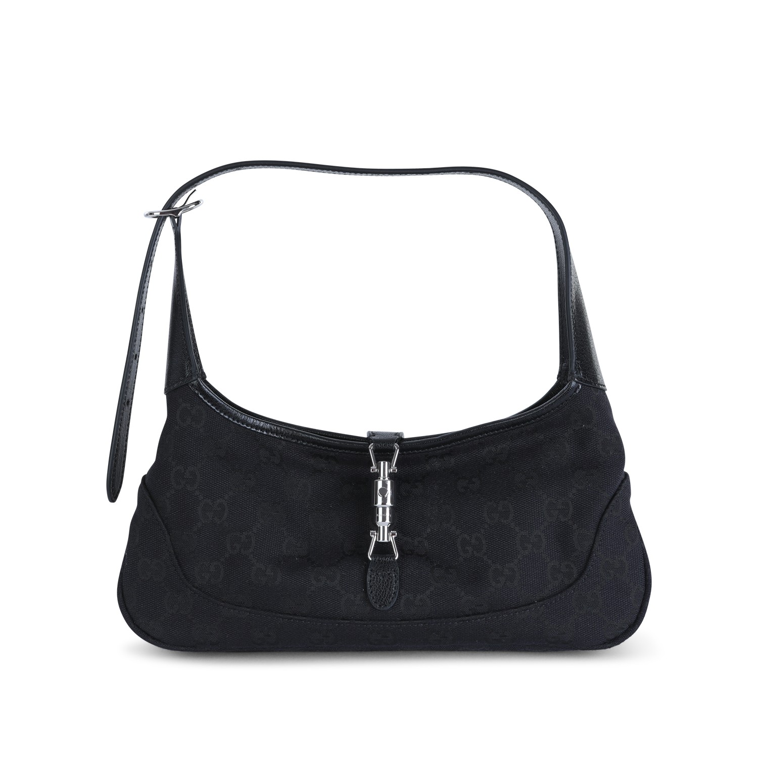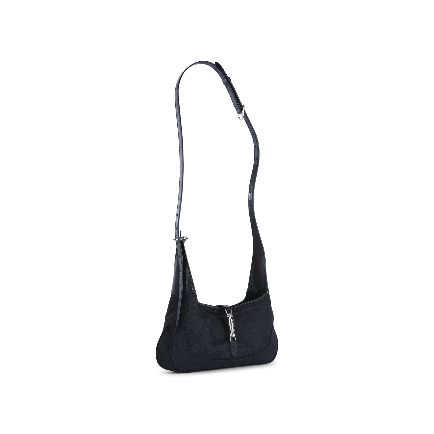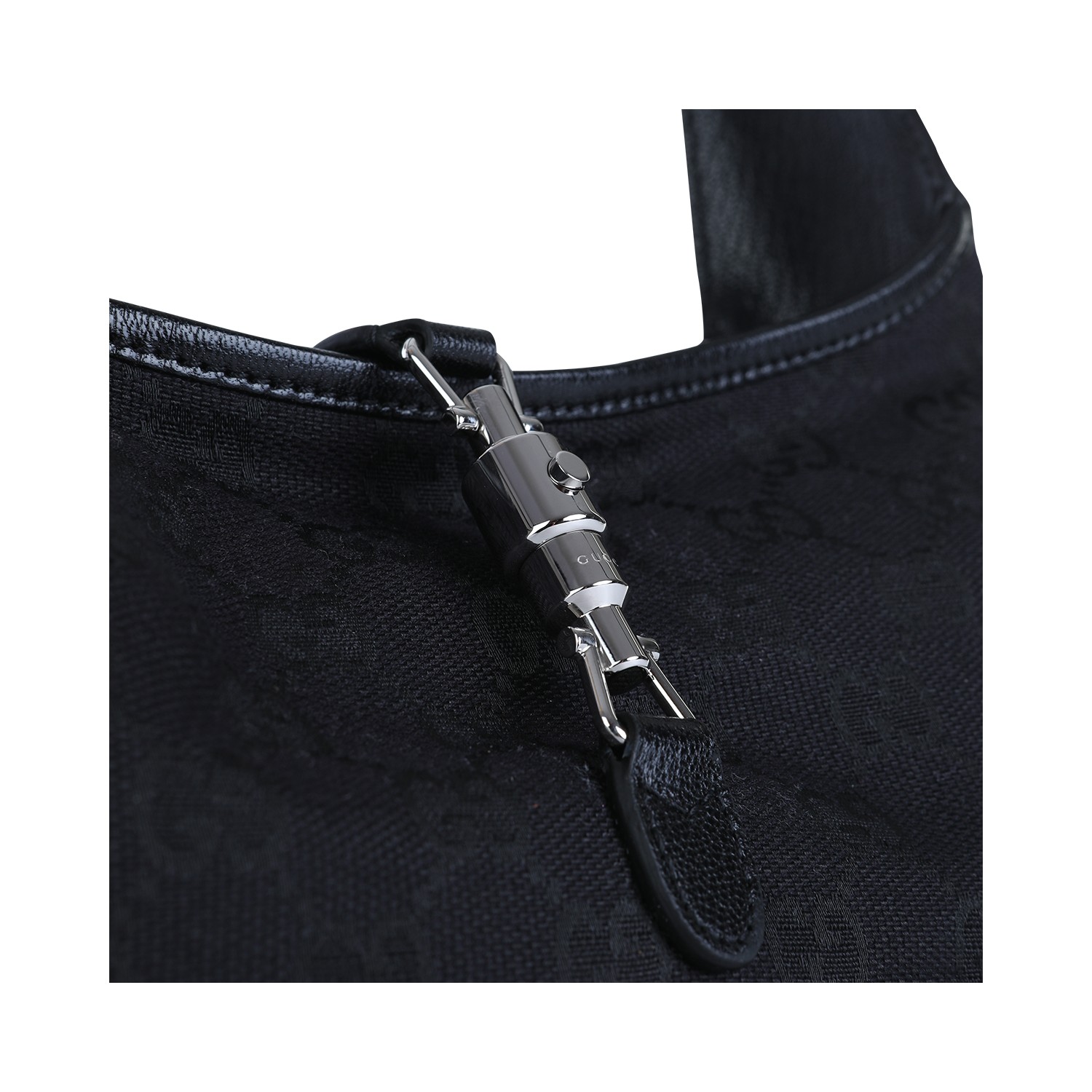 Black Jackie Hobo small shoulder bag from Gucci featuring adjustable handle, silver tone hardware, piston closure, GG logo texture and main compartment.