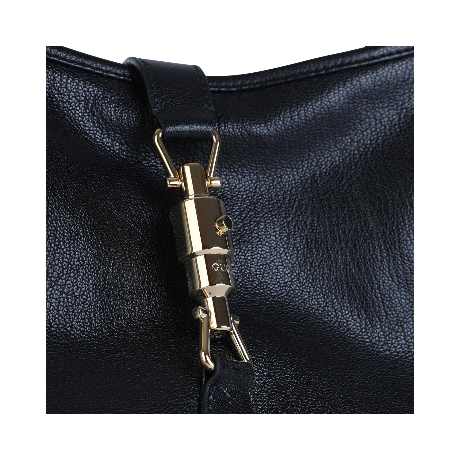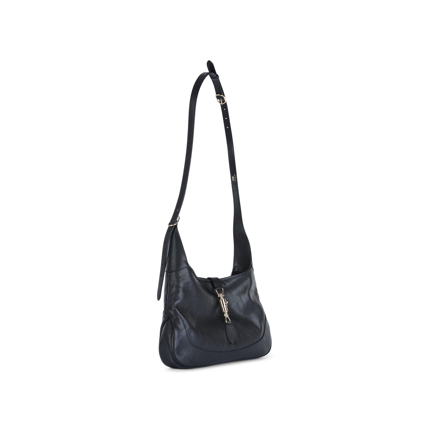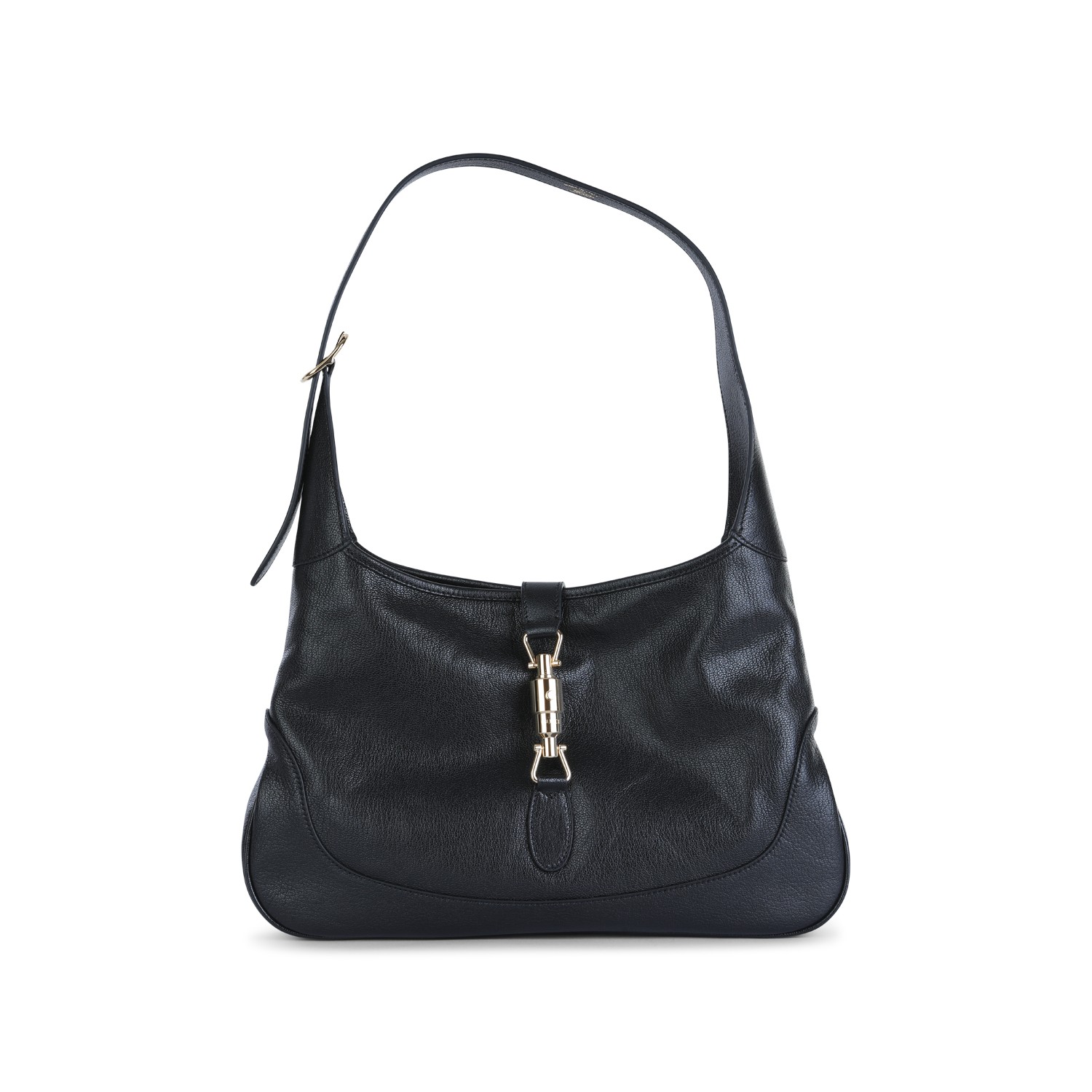 Black leather Jackie Hobo medium shoulder bag from Gucci featuring adjustable handle, gold tone hardware, vintage texture, piston closure and main compartment.