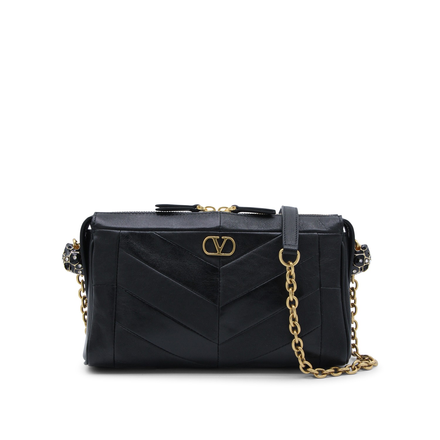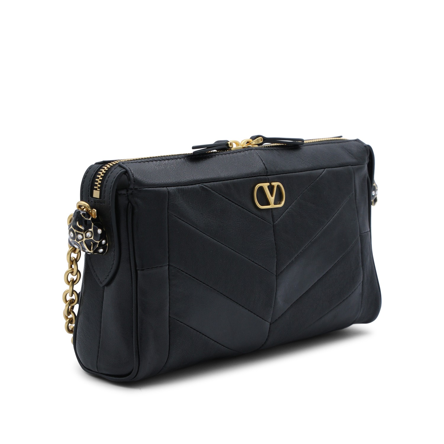 Black leather Panthea small shoulder bag from Valentino Garavani featuring double zip fastening, gold tone hardware, chain link shoulder strap, metal monogram logo and main compartment.