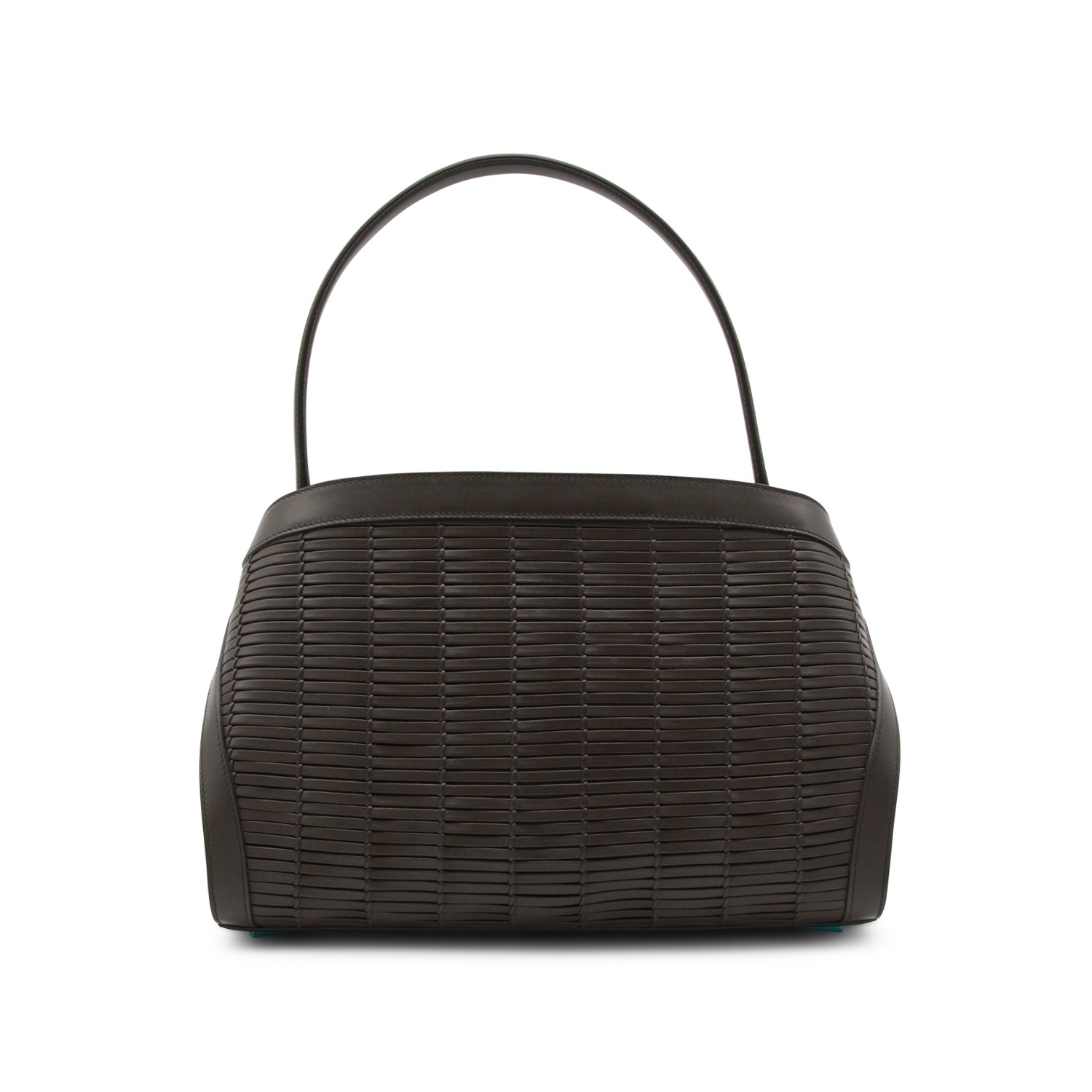 Brown leather Hug shoulder bag from Ferragamo featuring single top handle, logo, gold tone metal hardware, bukles, upper closure and main compartment.