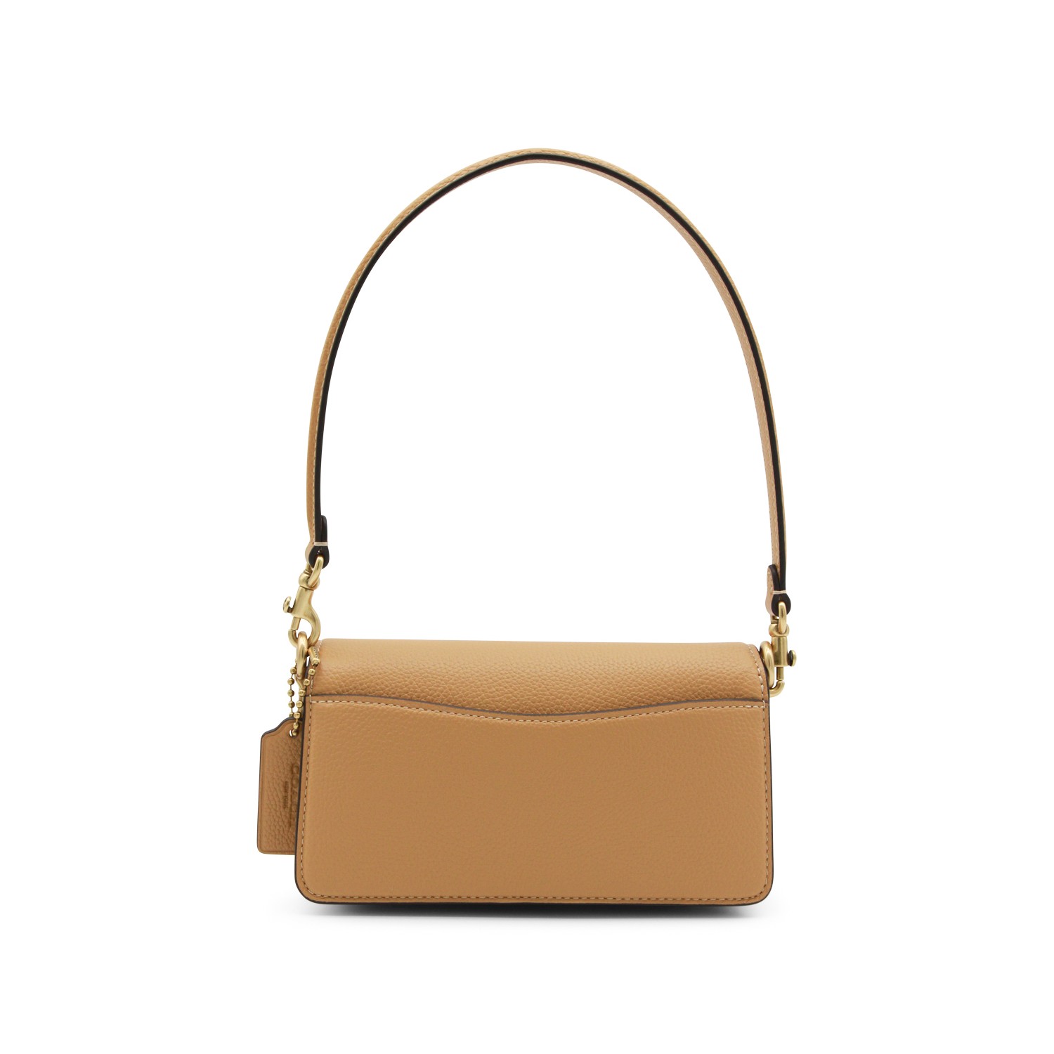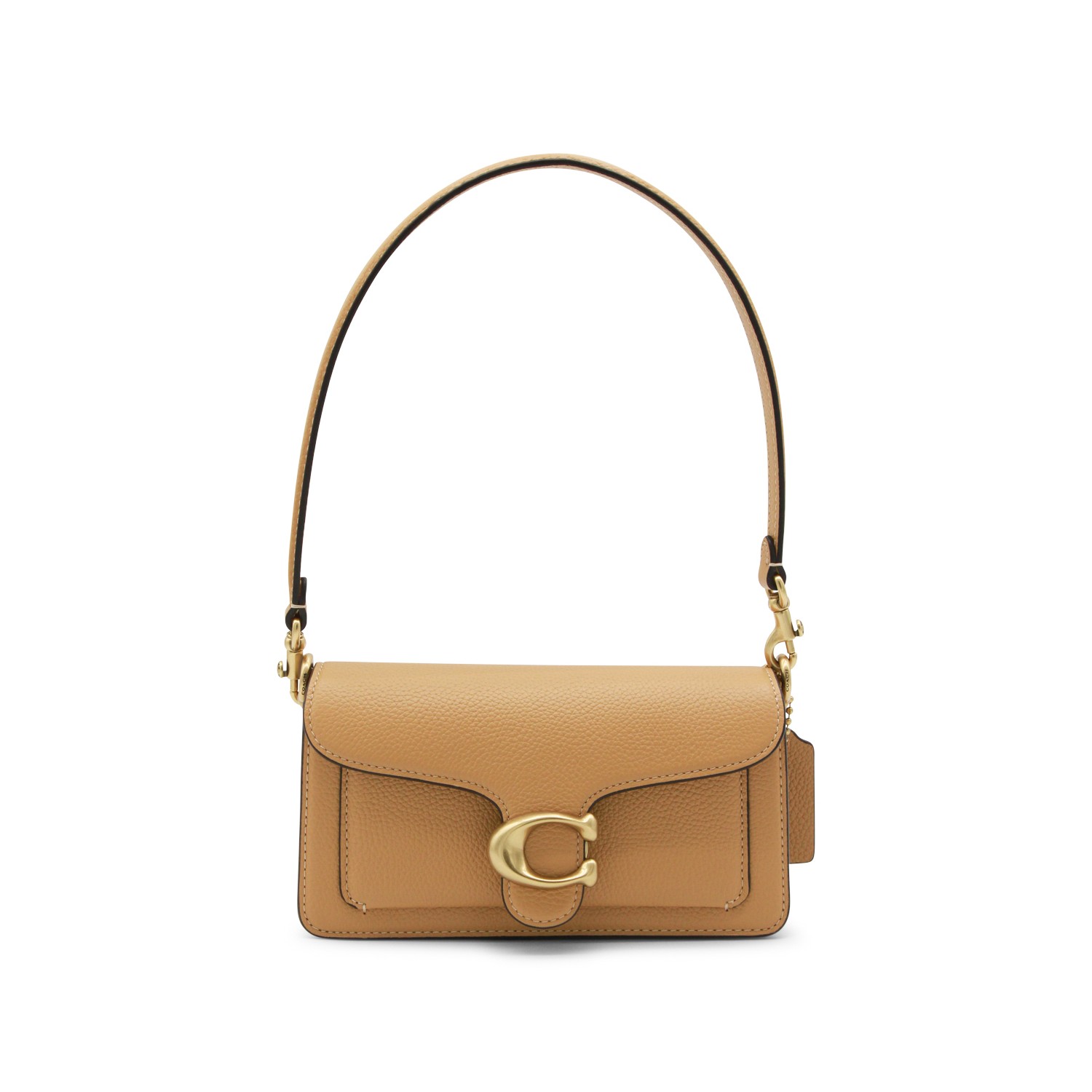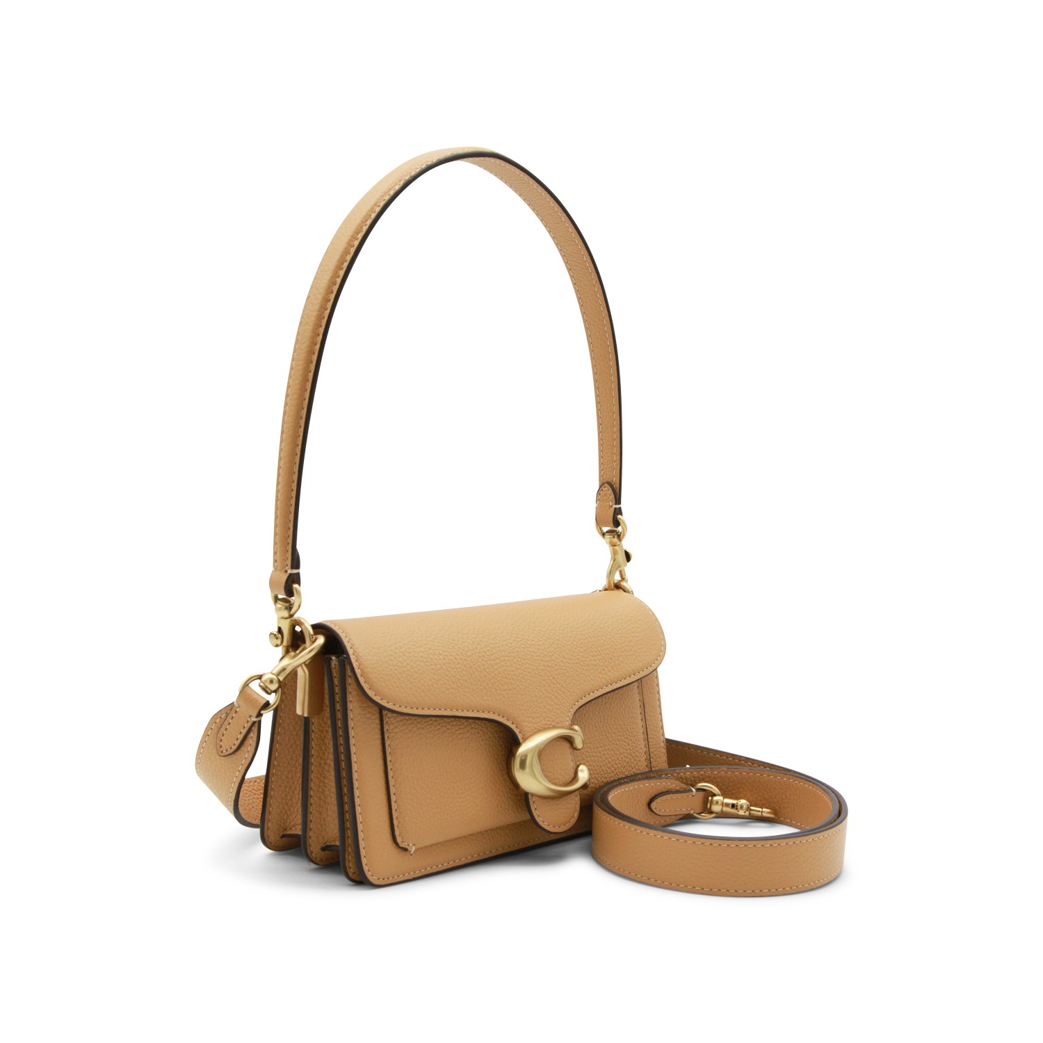 Beige leather Tabby shoulder bag from Coach featuring handle, flap with magnetic closure, gold tone hardware, branded tag, adjustable and removable shoulder strap, main compartment and pocket.