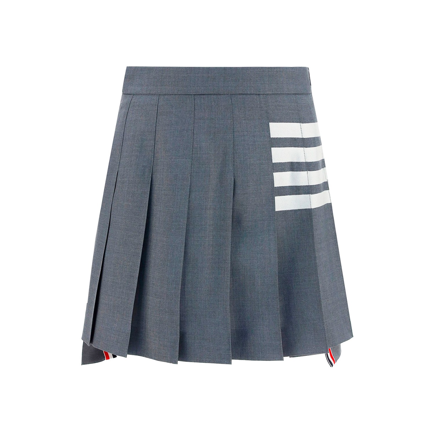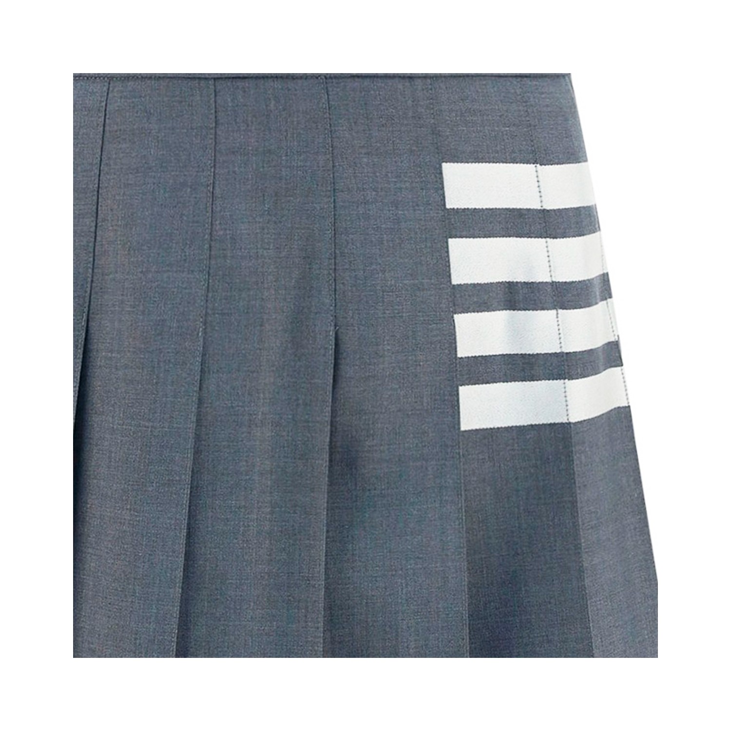 Grey and white wool skirt from Thom Browne featuring high waist, pleated details, mini length, 4-Bar stripe and details.