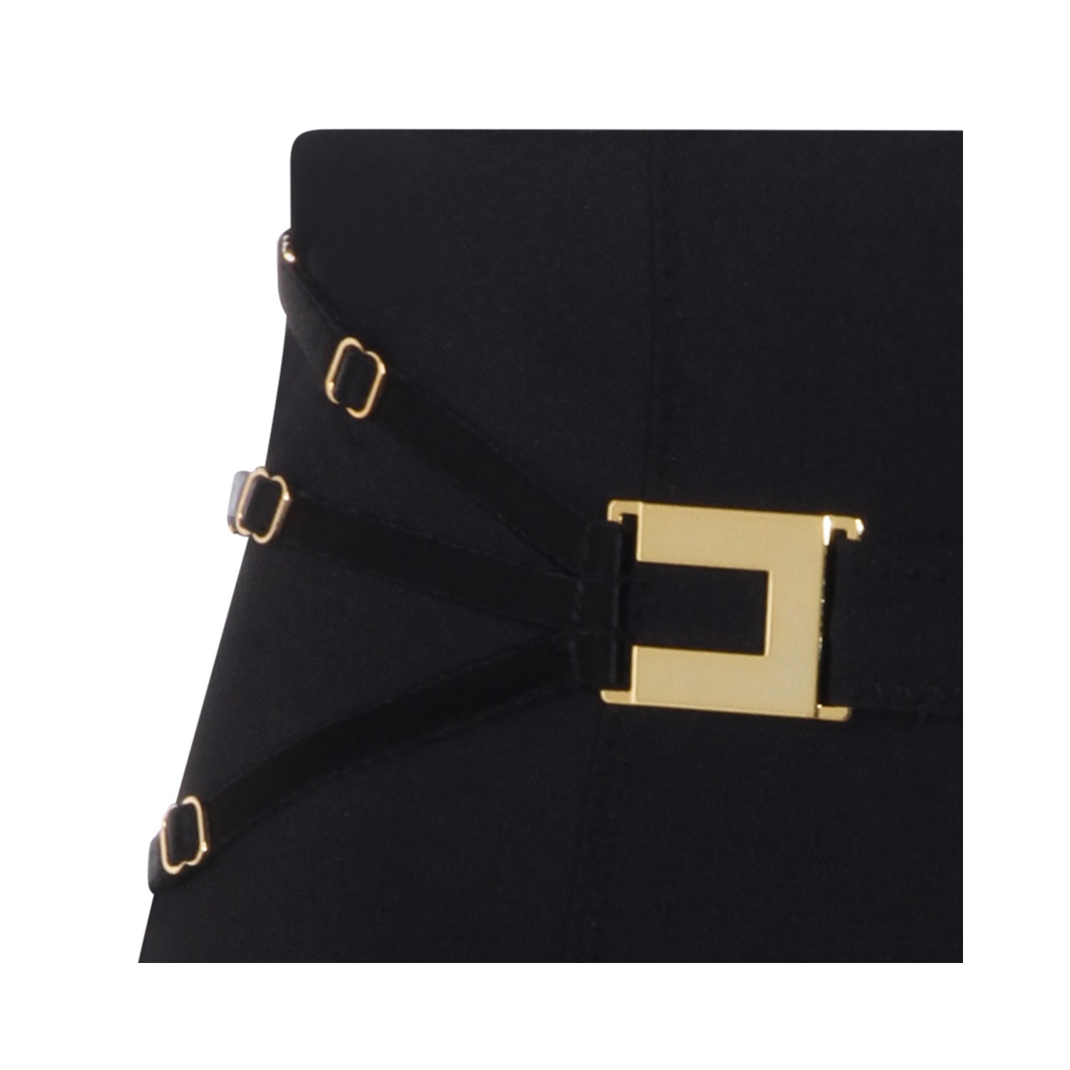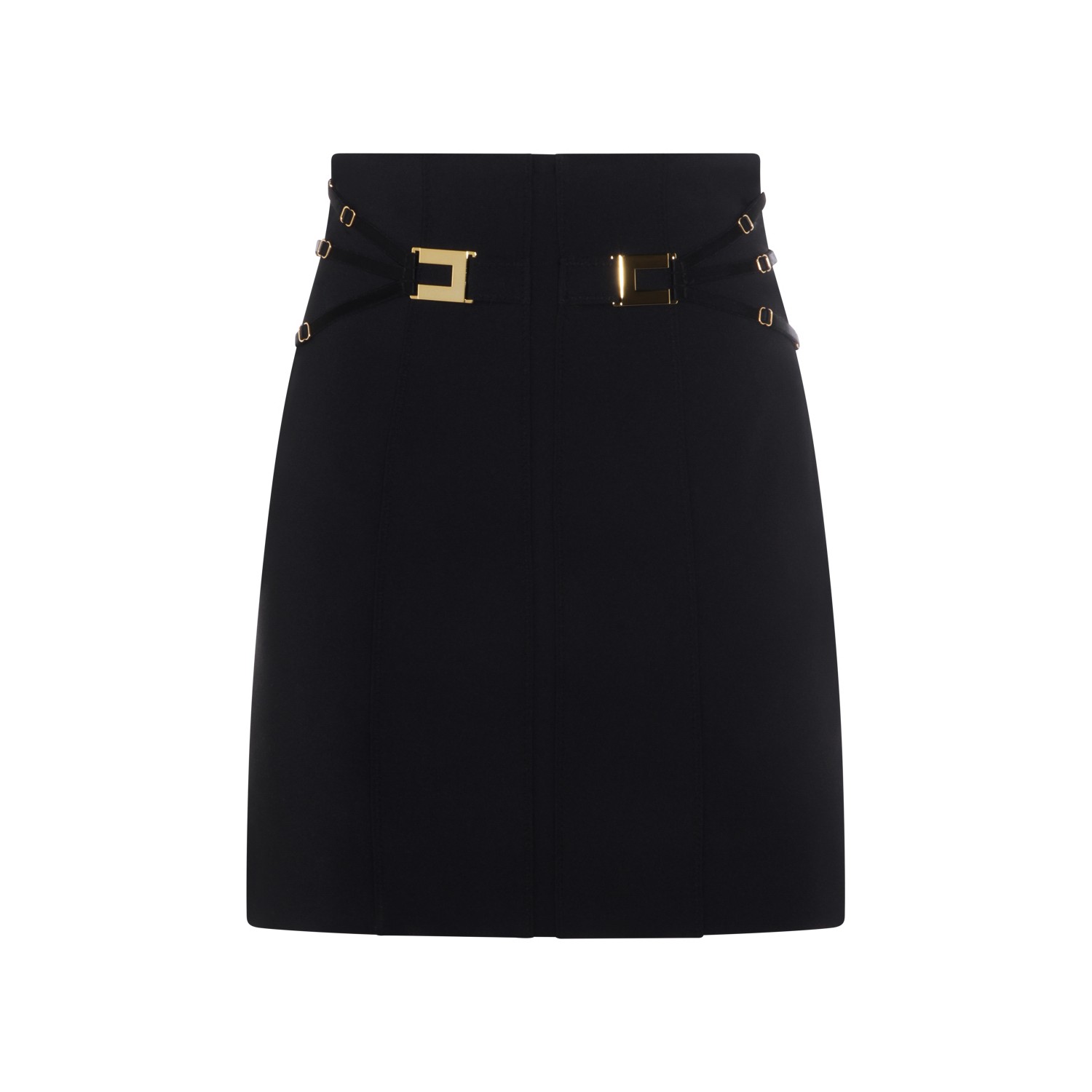 Black skirt from Elisabetta Franchi featuring high waist, gold tone hardware, buckle details, tight fit and mini lenght.
