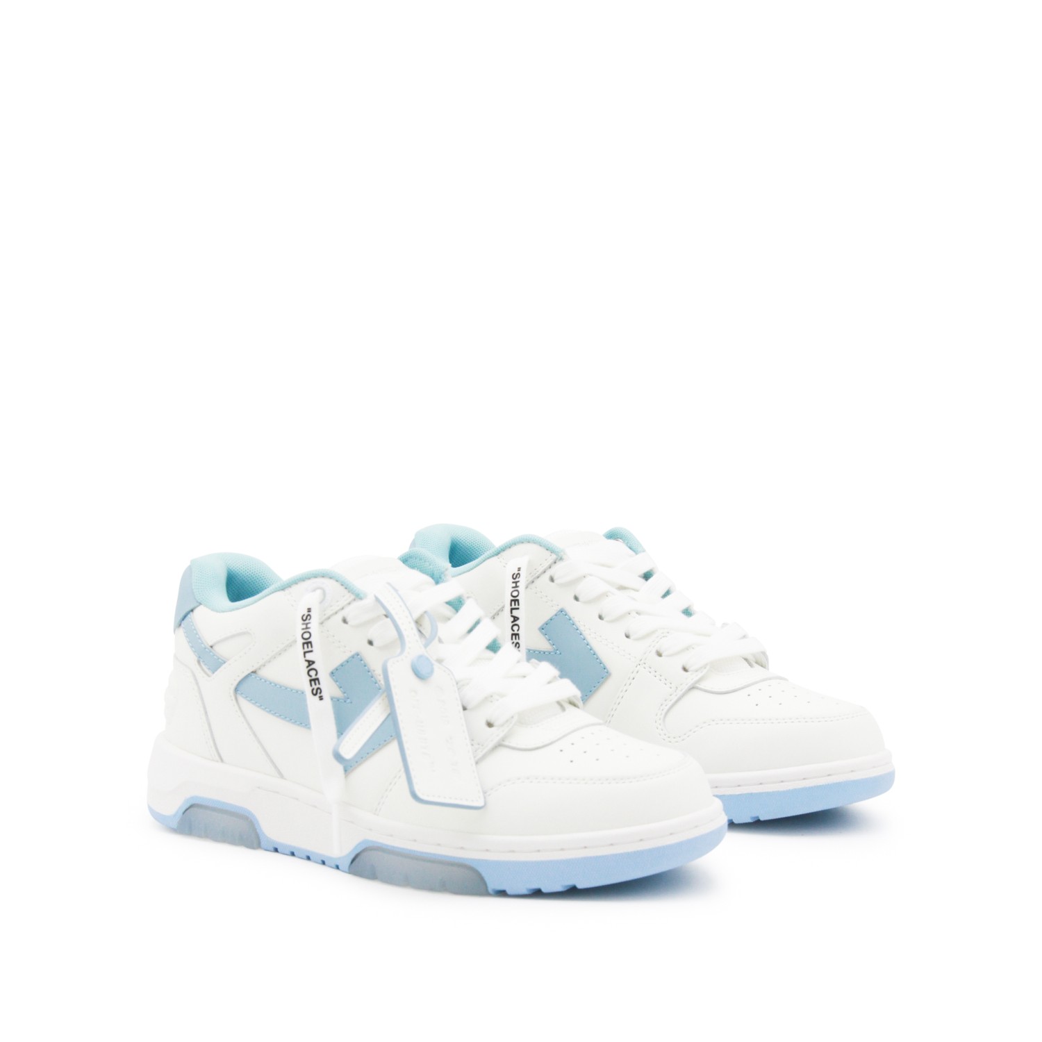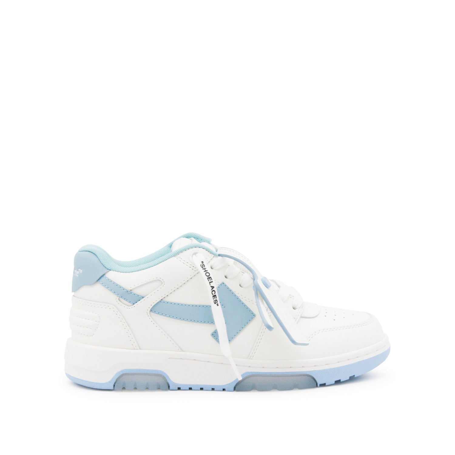 White and light blue Out Of Office sneakers from Off-White featuring round toe, laces fastening, leather sole and arrow detail.