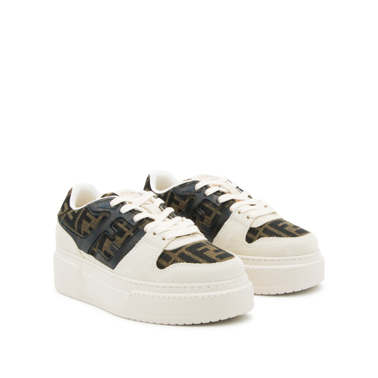 Beige and brown leather Fendi Match sneakers from Fendi featuring round toe, FF logo texture, laces fastening, and oversize rubber sole.