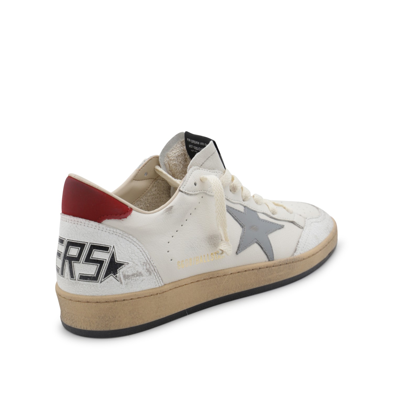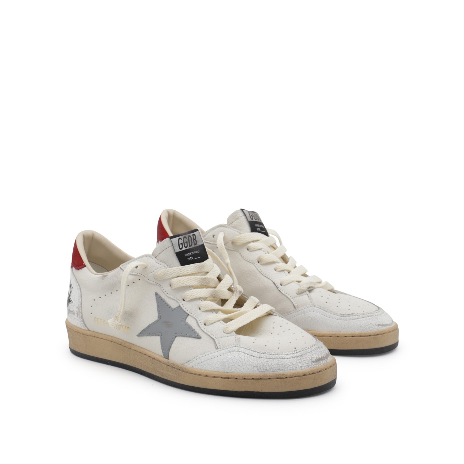 White and light blue leather Ball Star sneakers from Golden Goose featuring round toe, cotton lace-up fastening, light blue star patch, logo, branded tongue and flat rubber sole.