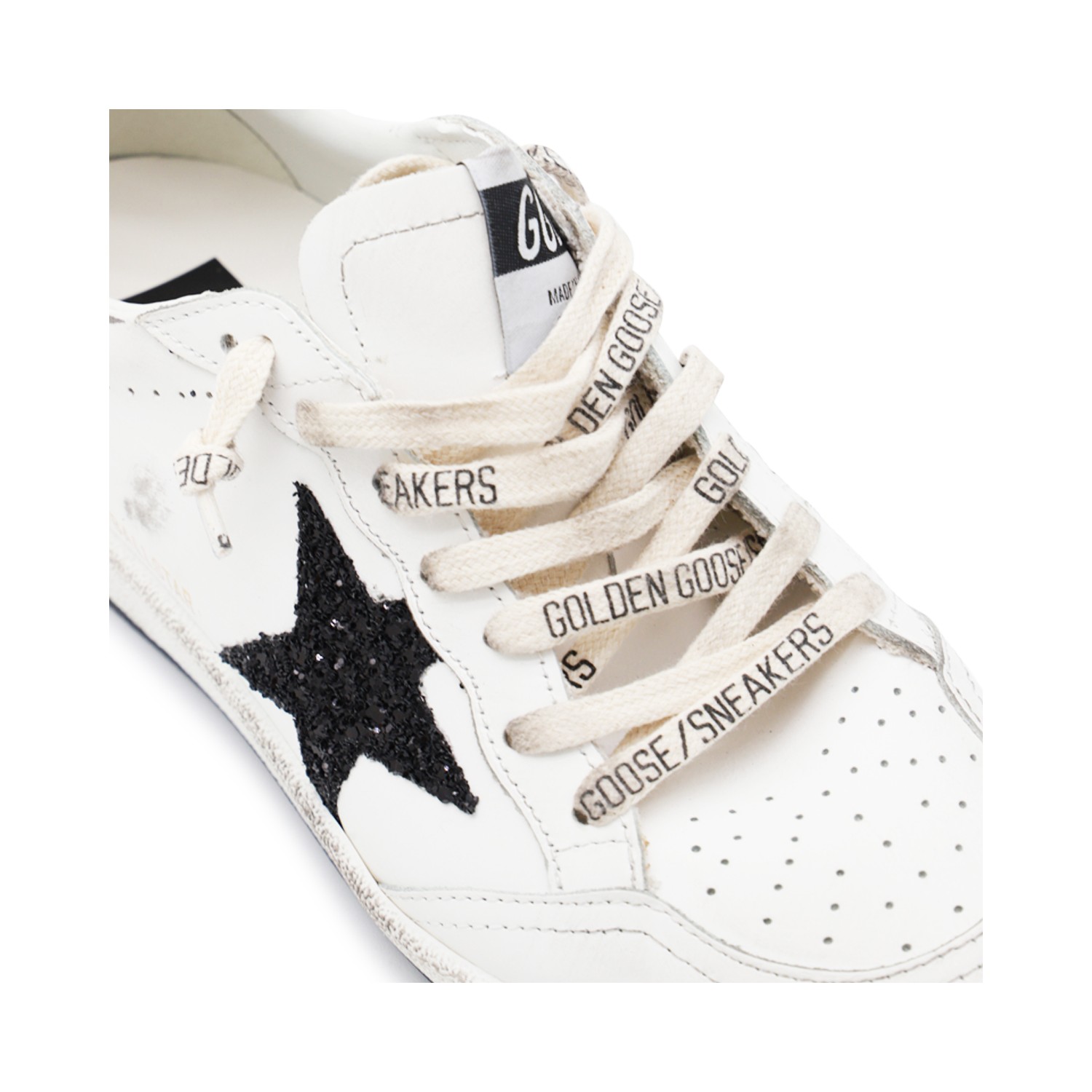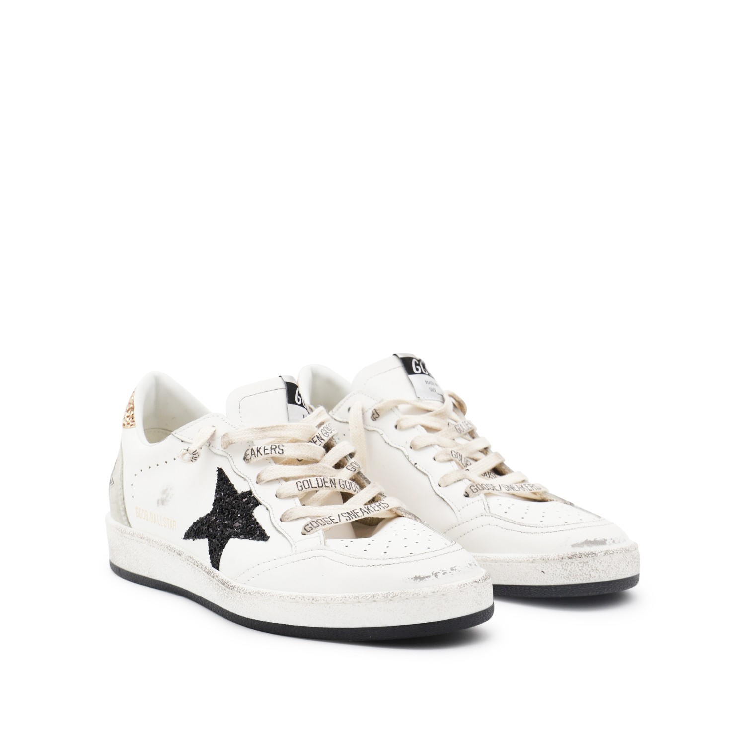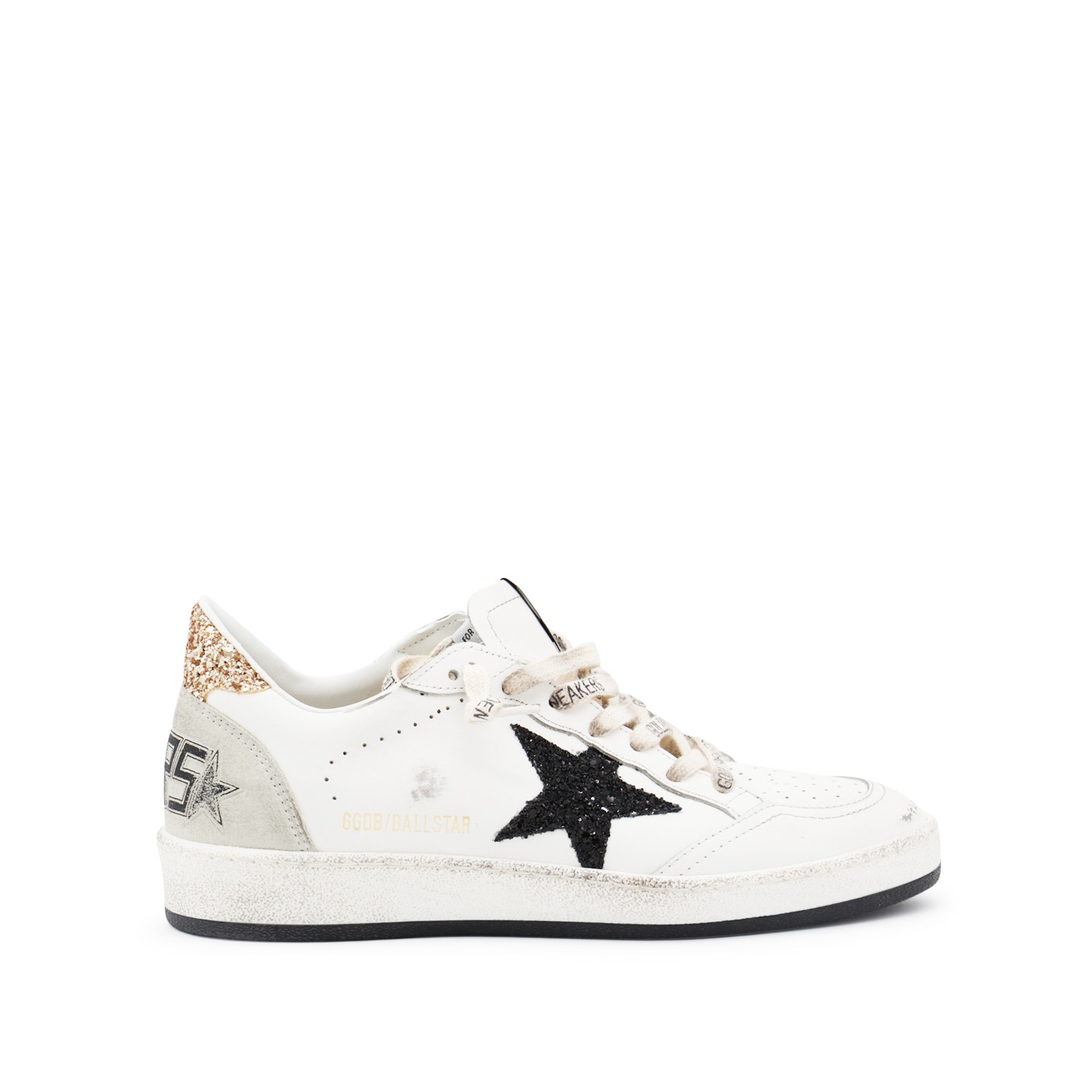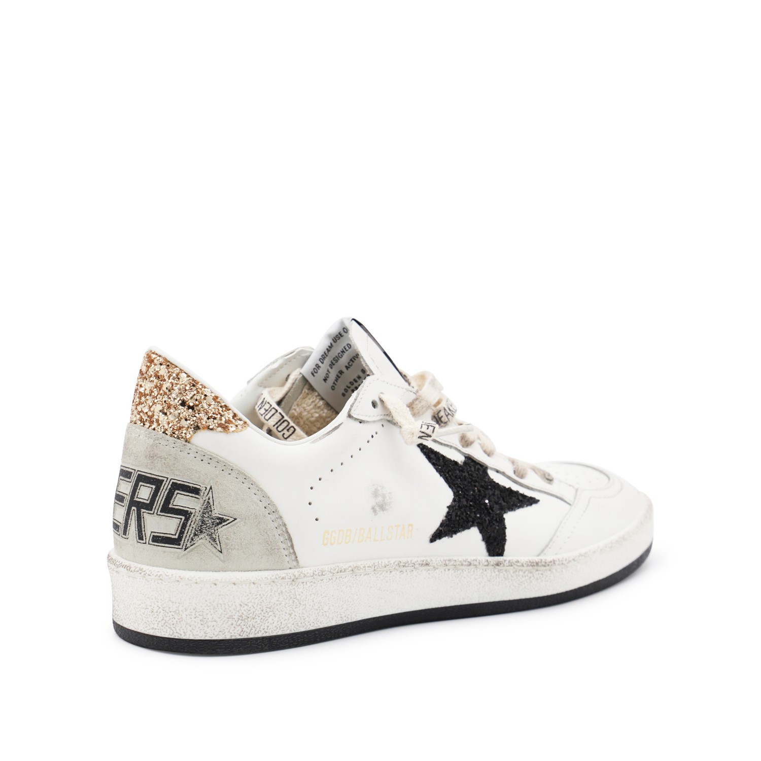 White and gold leather Ball Star low top sneakers from Golden Goose featuring rubber sole, round toe, cotton laces, logo details and silver strass Star application at side.