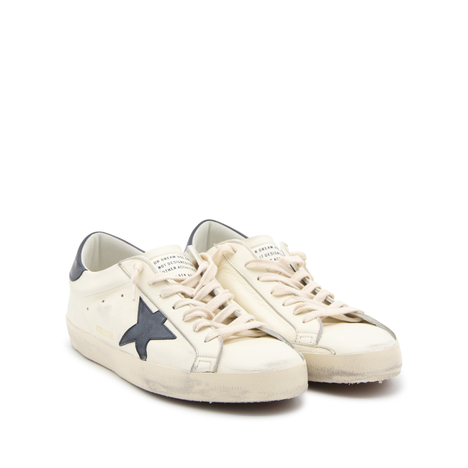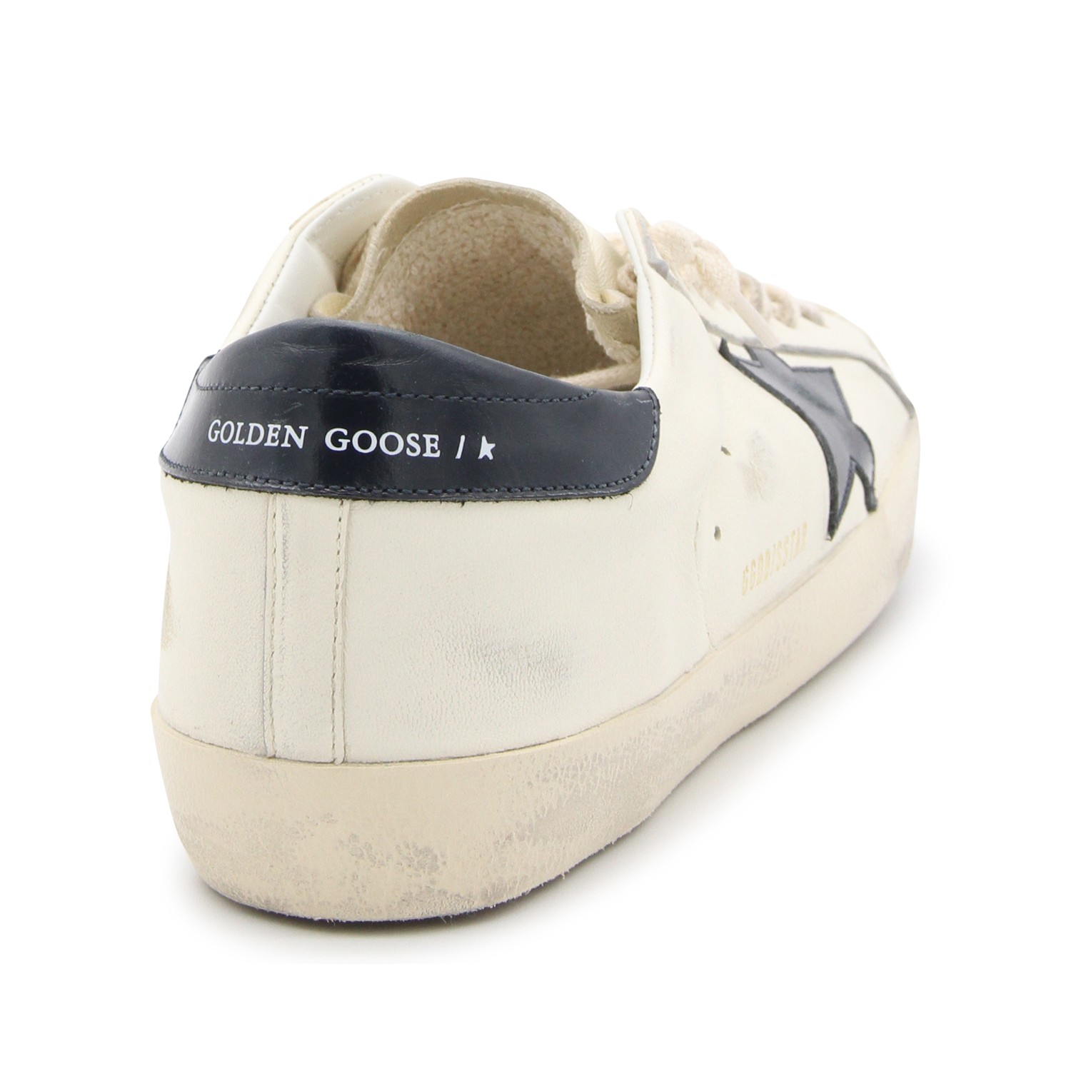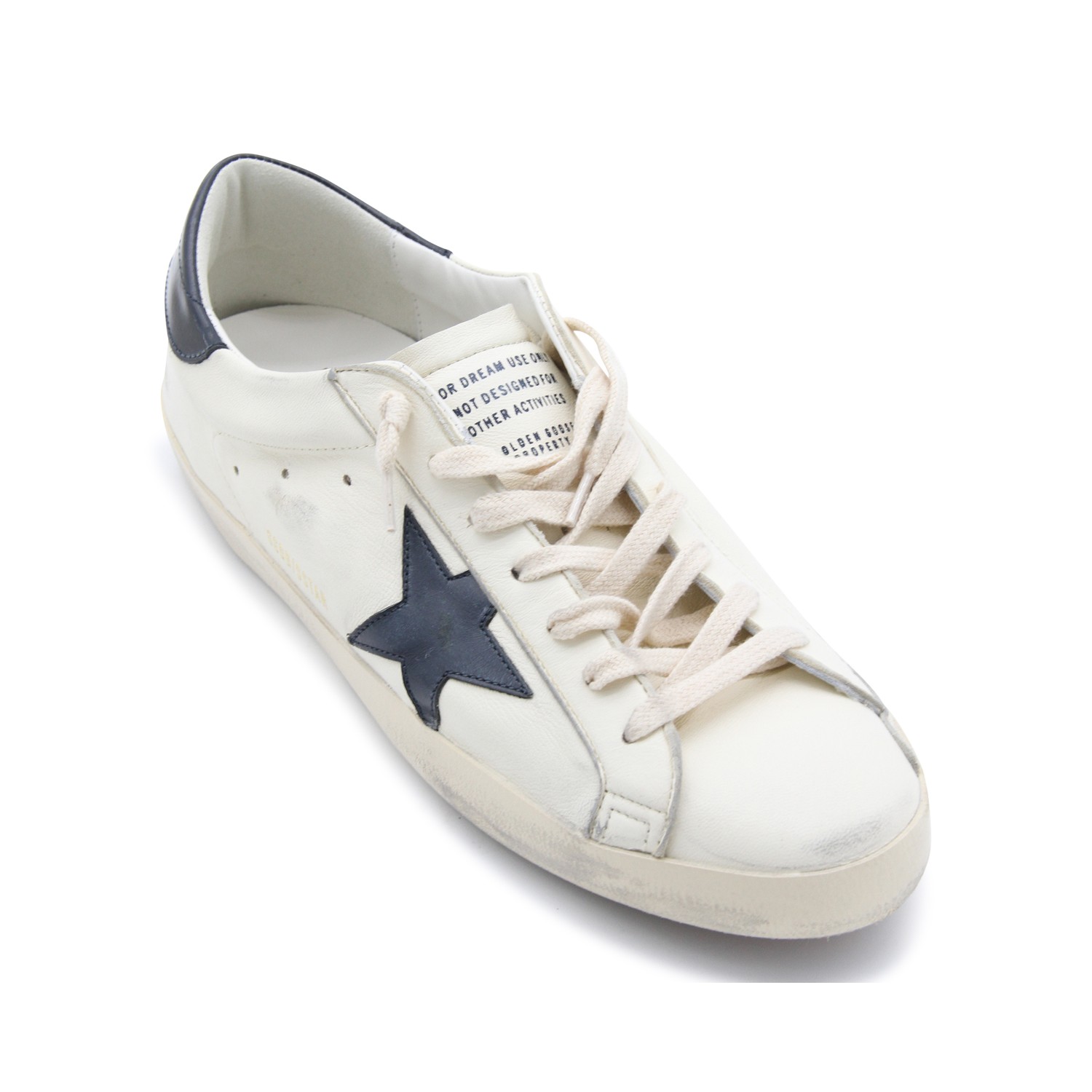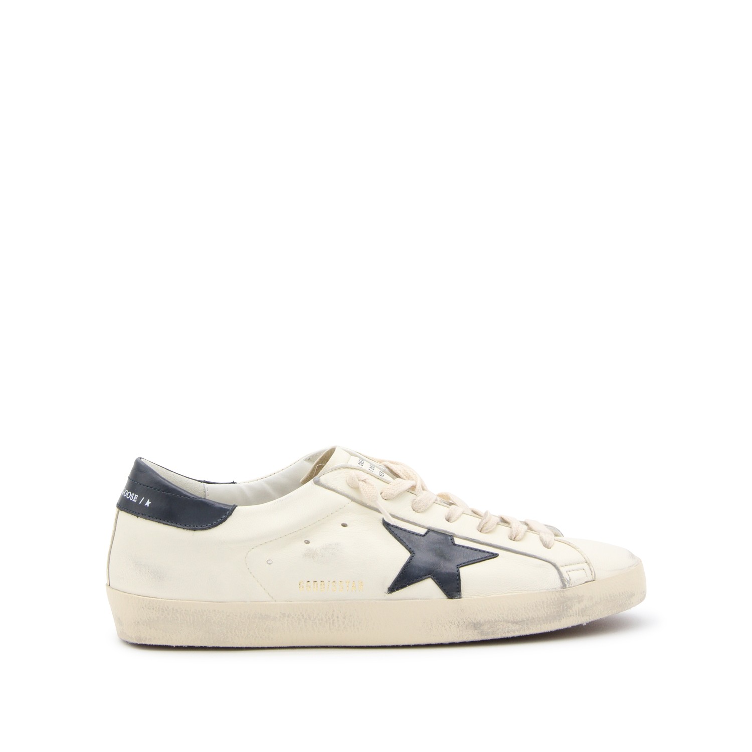 White and black leather sneakers from Golden Goose featuring round toe, cotton laces, lateral logo and leather sole.