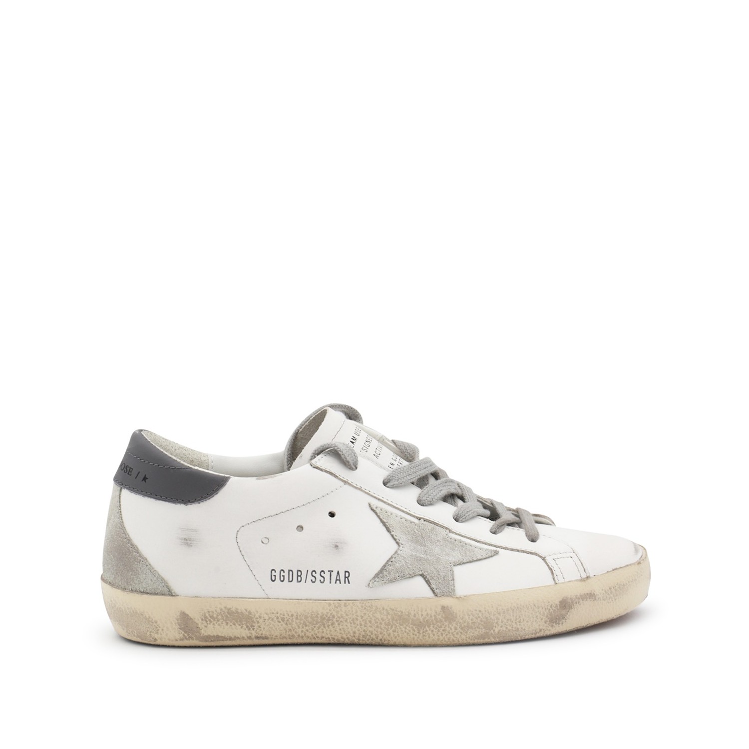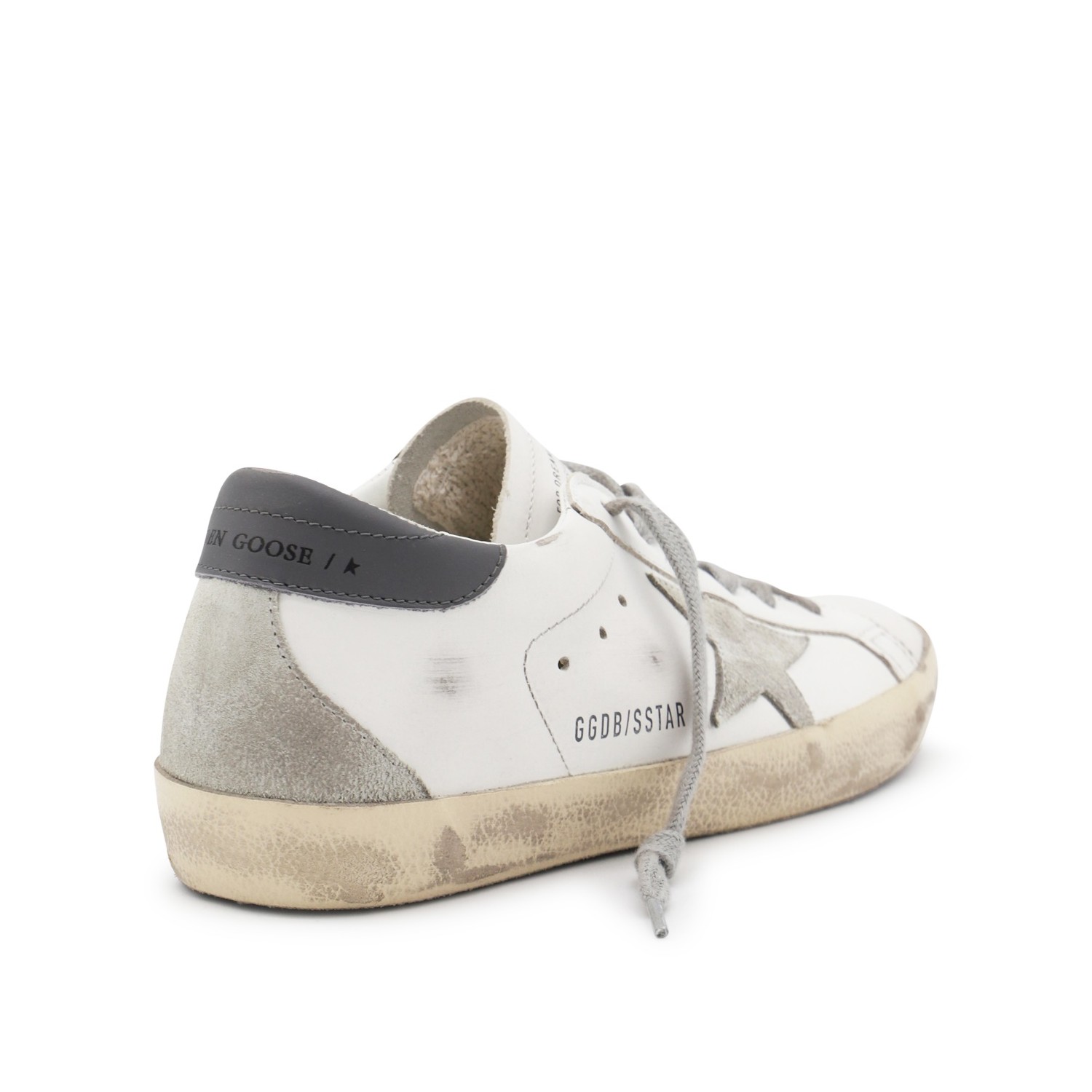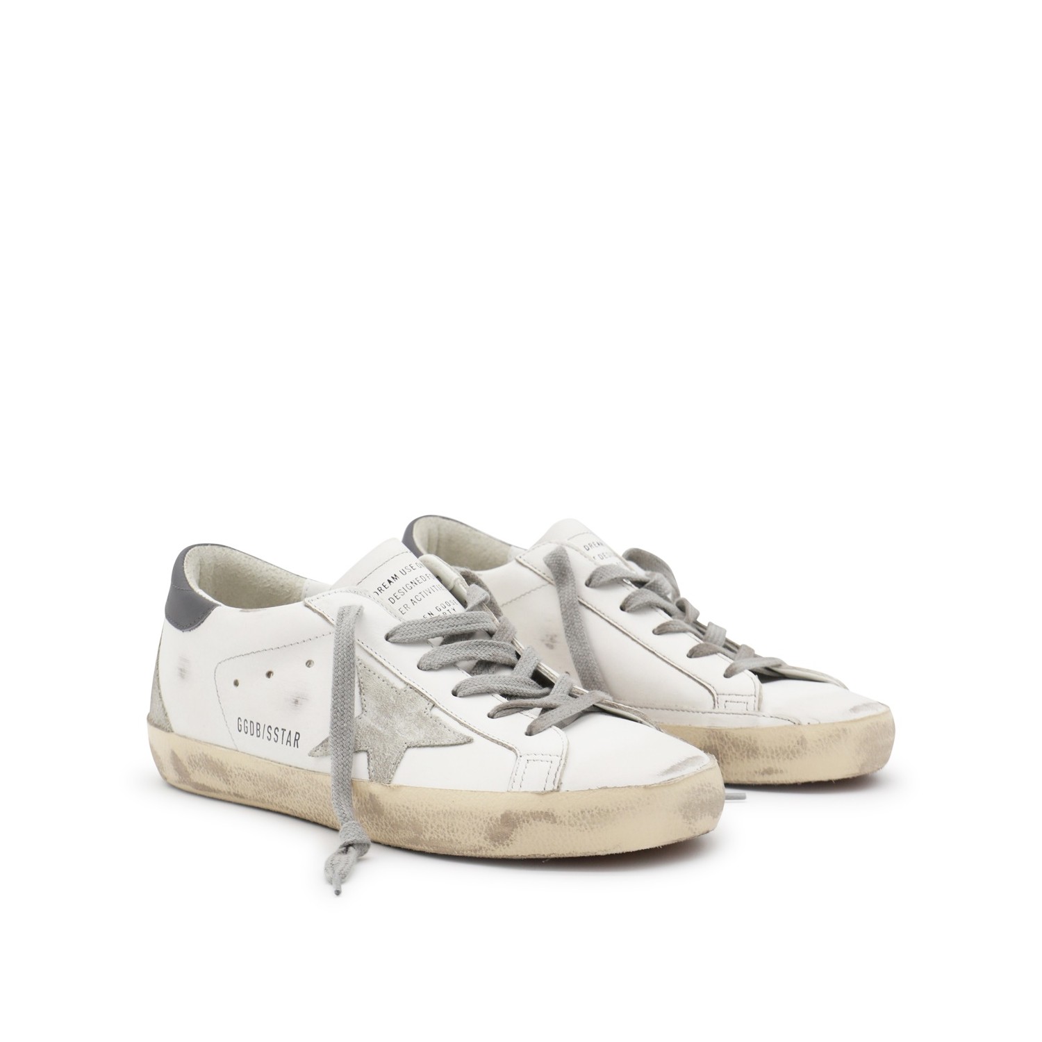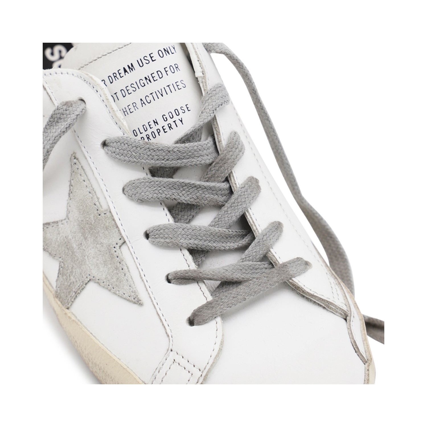 White and grey leather Super Star sneakers from Golden Goose featuring round toe, grey cotton laces fastening, side star patch, logo, rubber sole and branded insole.
