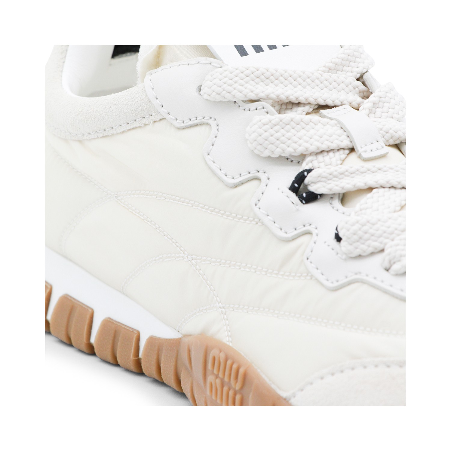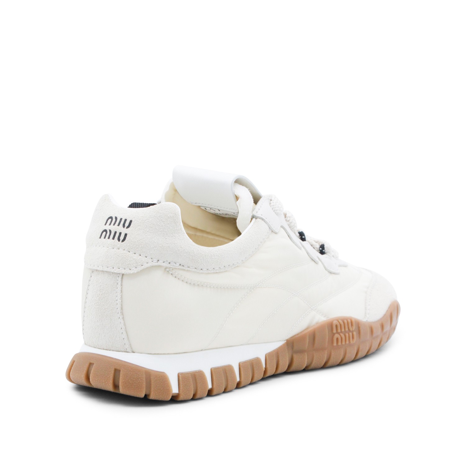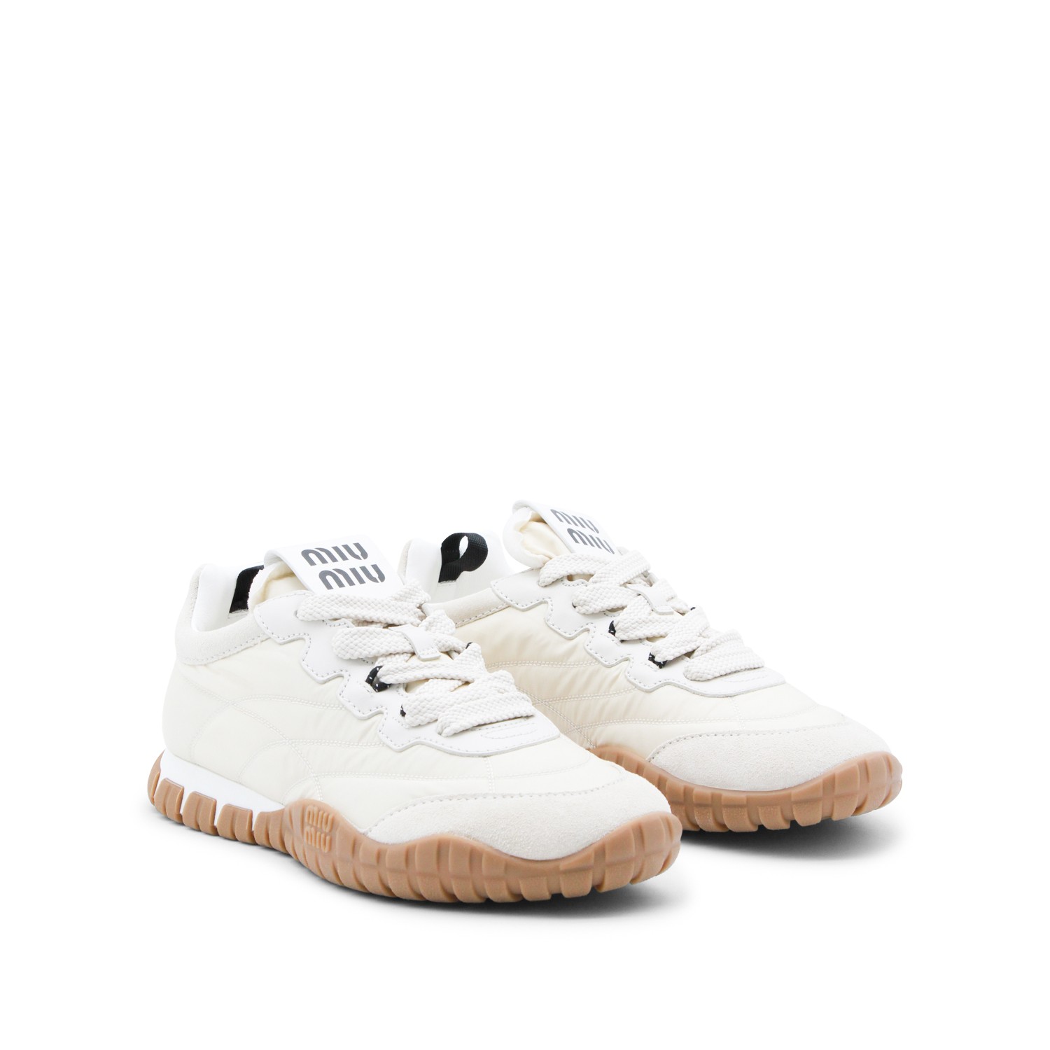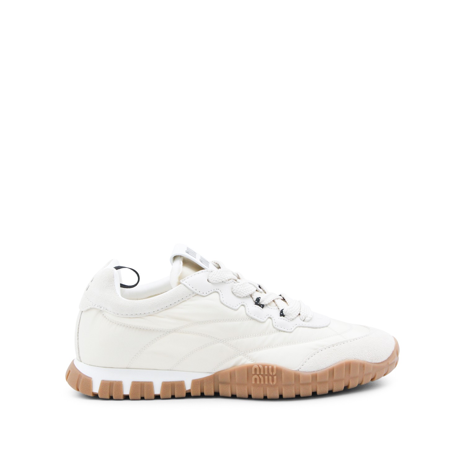 Ivory leather sneakers from Miu Miu featuring round toe, lace-up fastening, front and back logo detail and contrasting rubber sole.