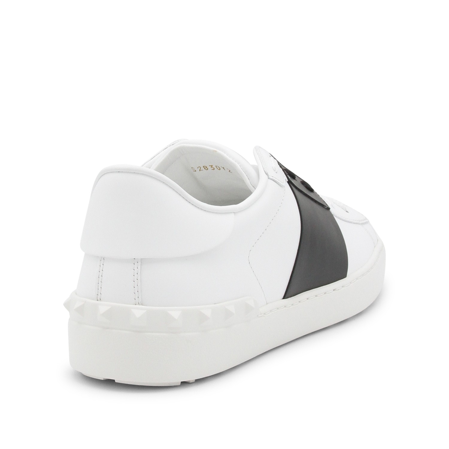 White and black leather Open sneakers from Valentino Garavani featuring round toe, lace up fastening, black detail and rubber sole.