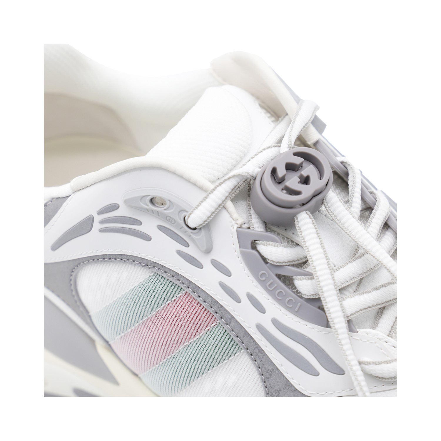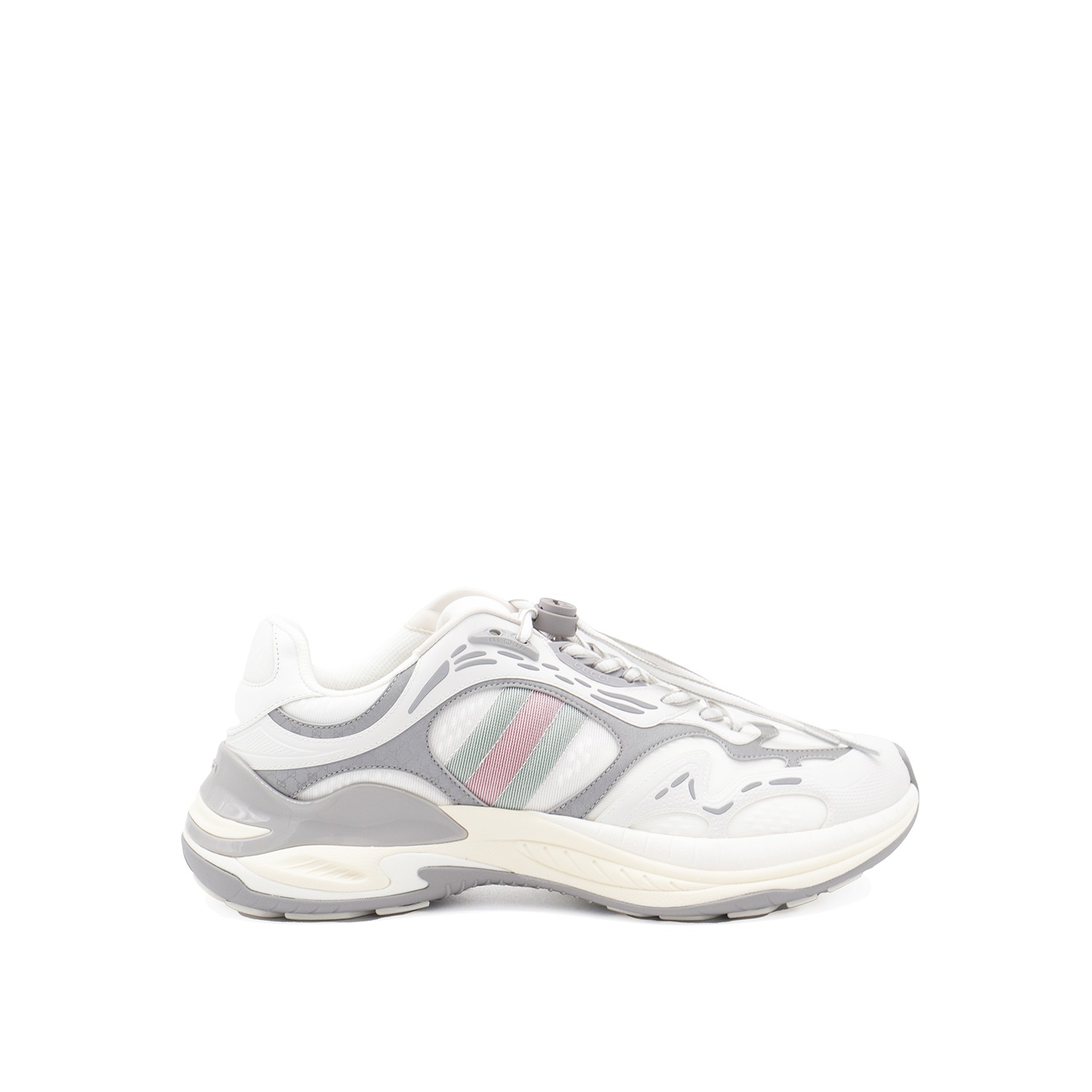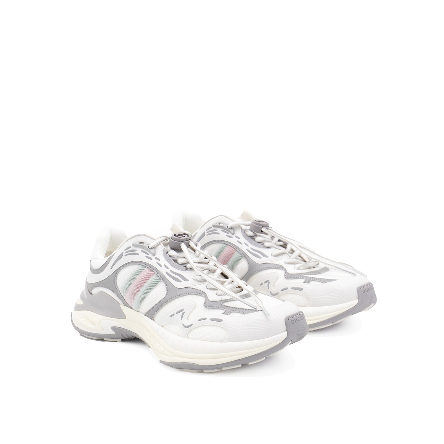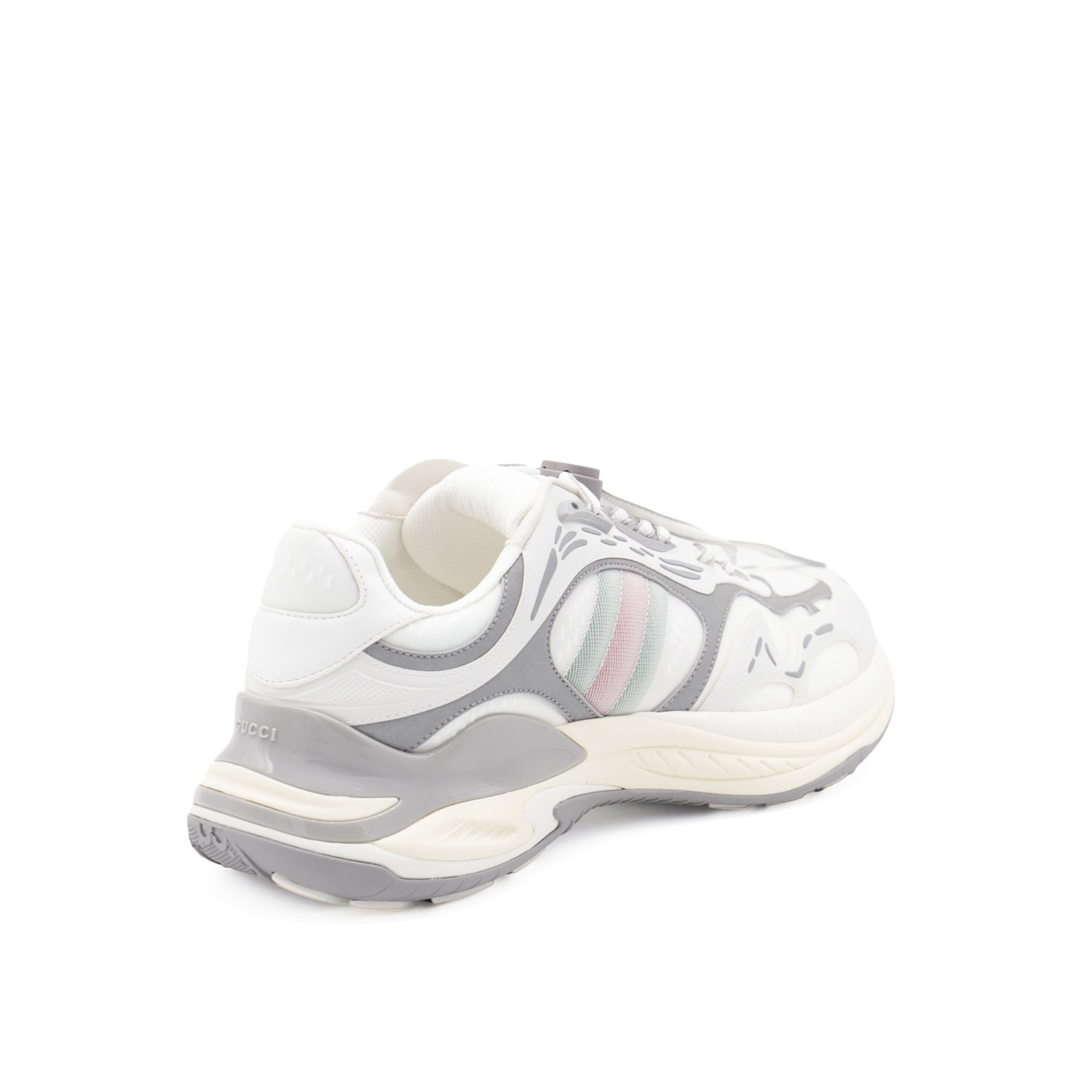 White and grey sneakers from Gucci featuring round toe, leather sole, branded insole, laces fastening and logo.