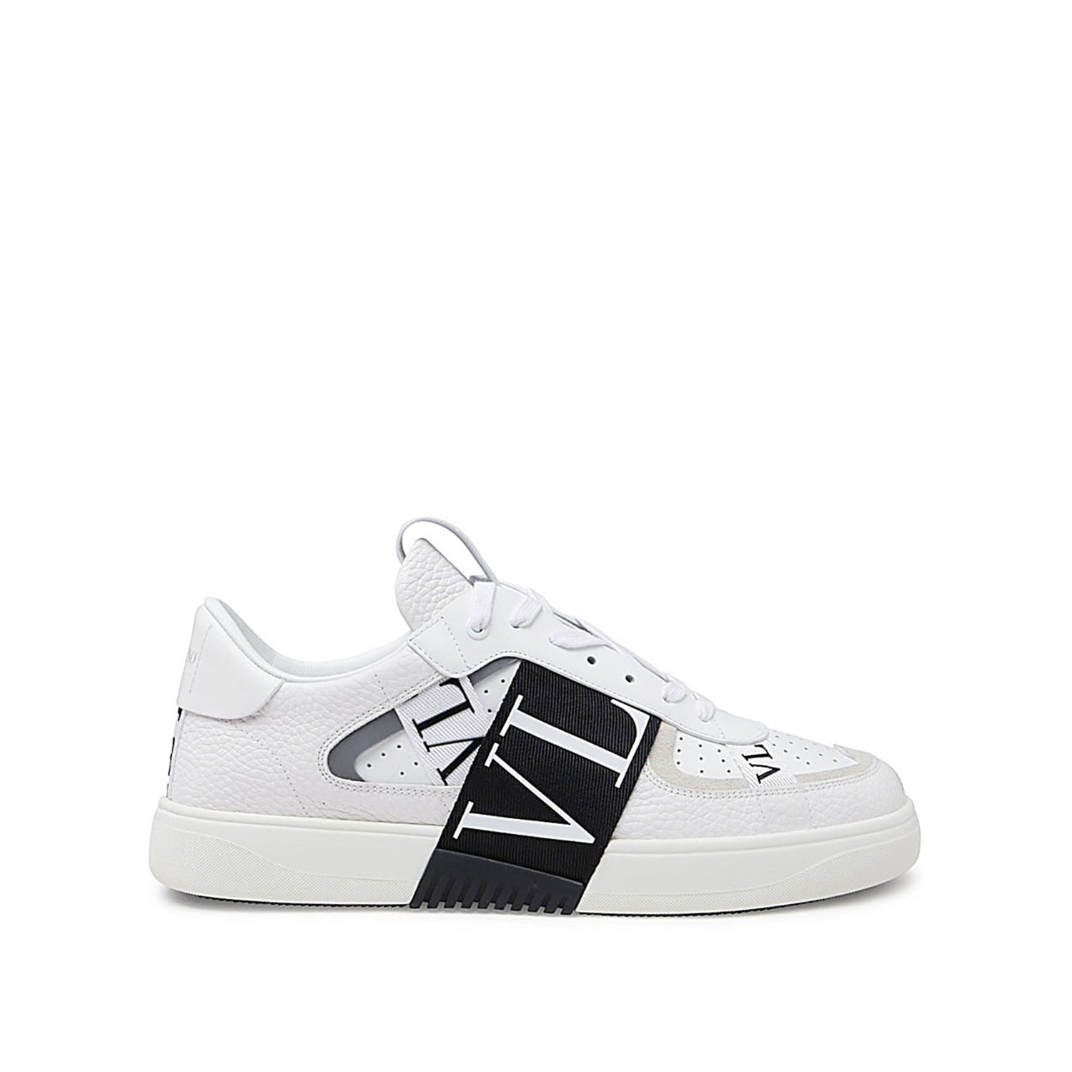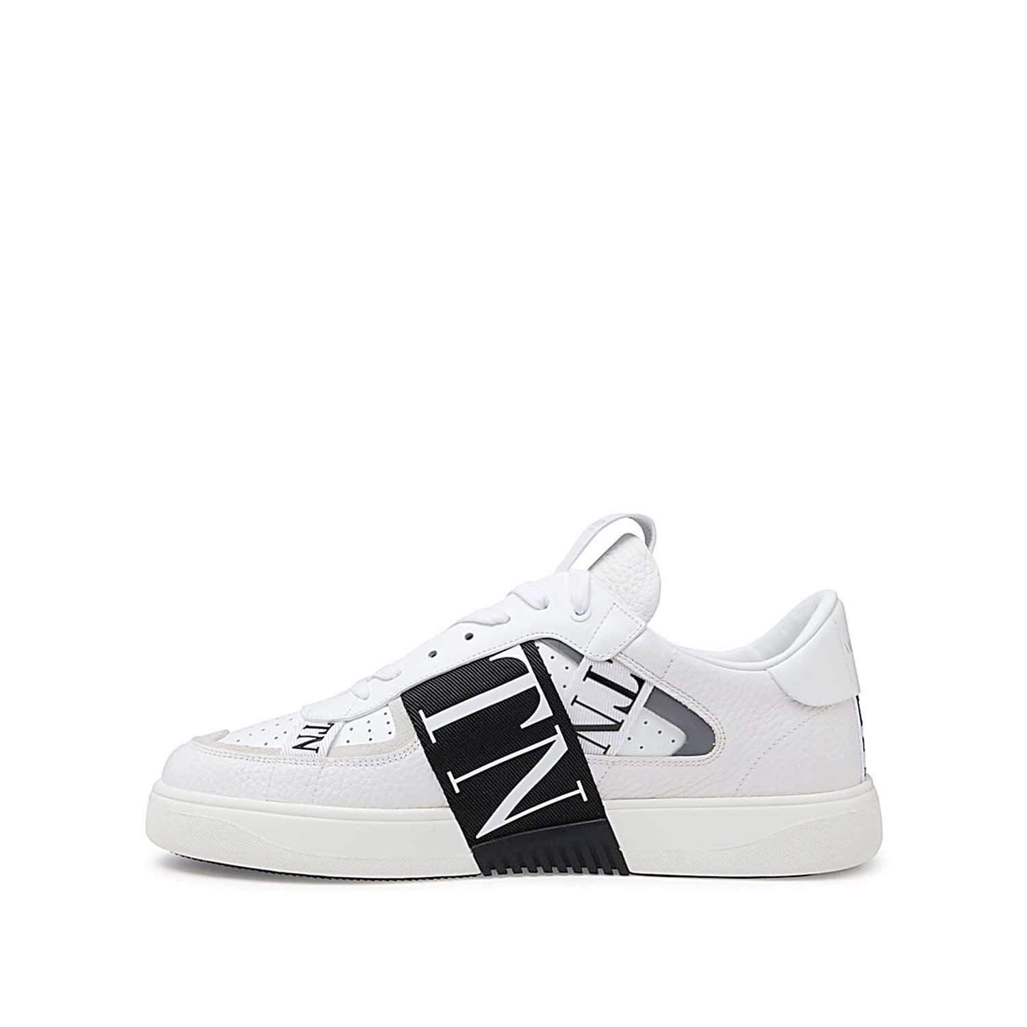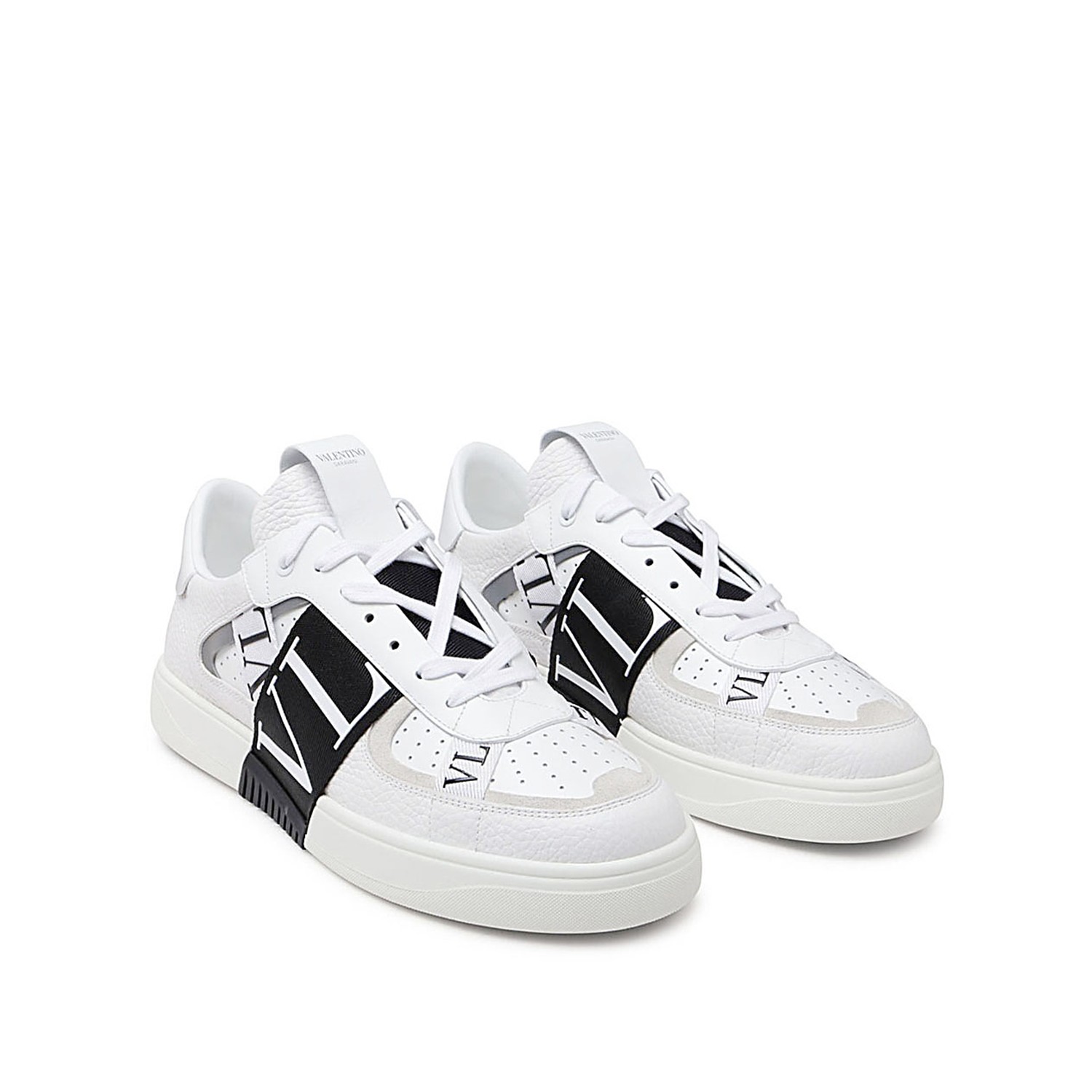 White and black leather VL7N sneakers from Valentino Garavani featuring round toe, lace up fastening, black logo detail and rubber sole.