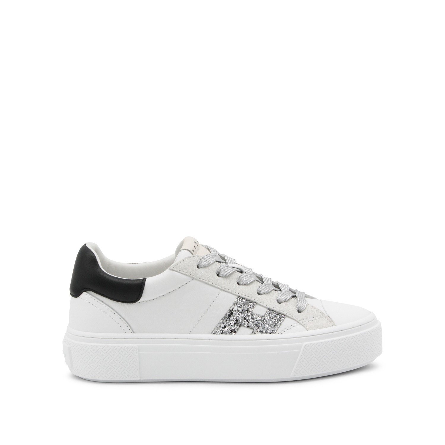 White and black leather sneakers from Hogan featuring round toe, lace up fastening, lateral logo and rubber sole.