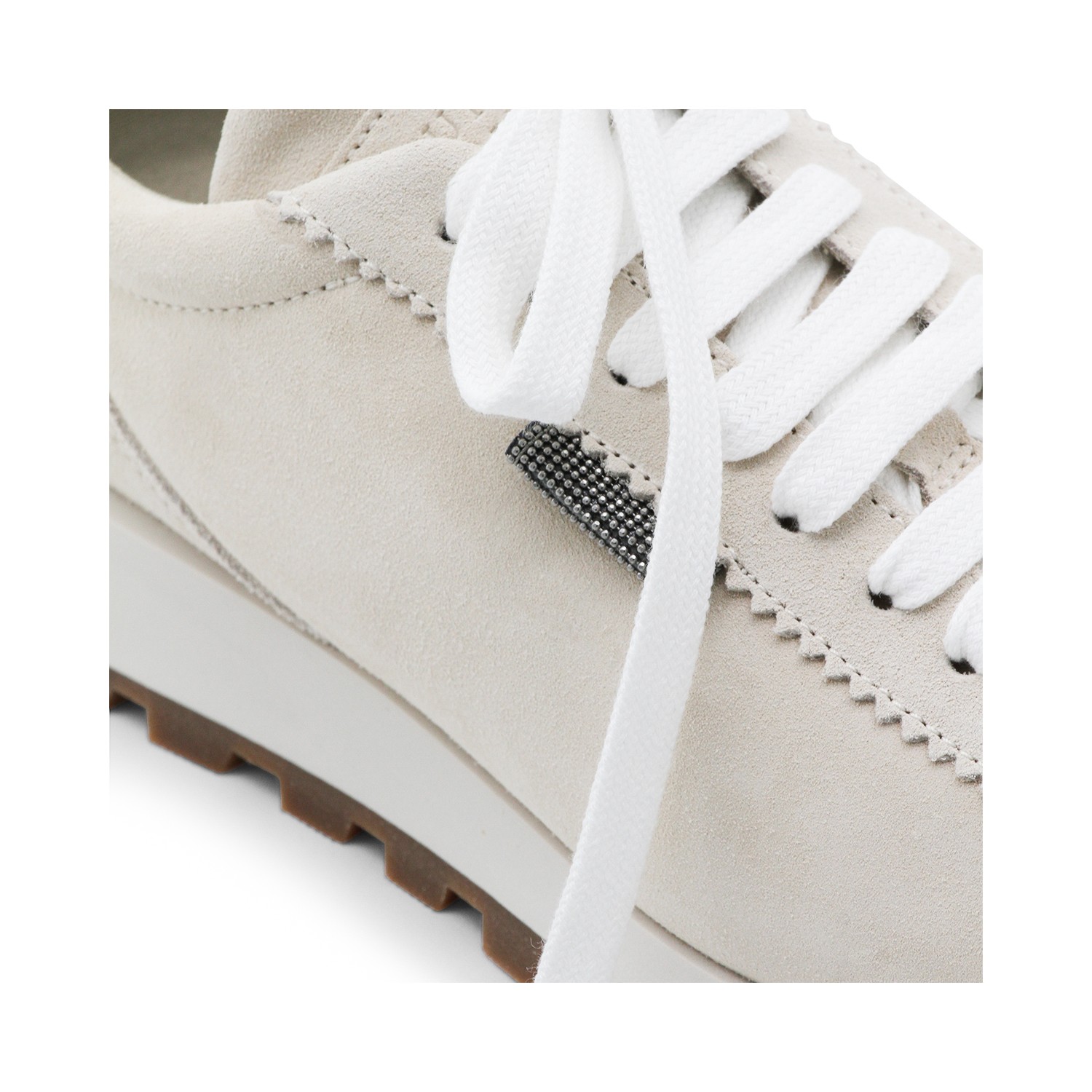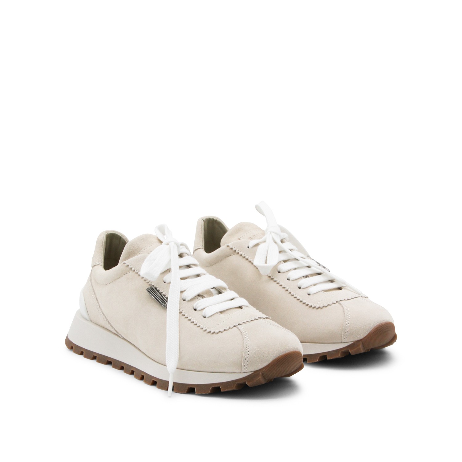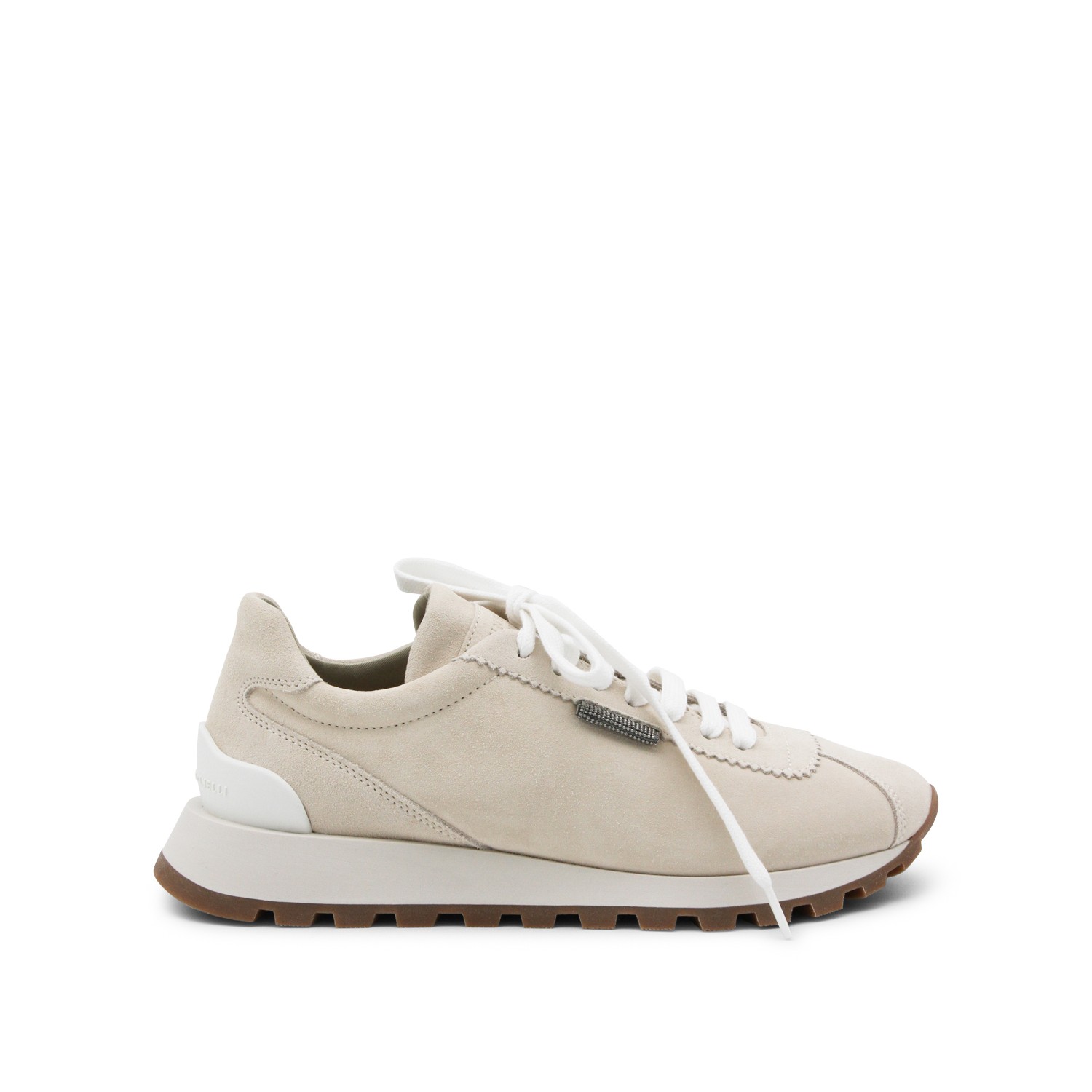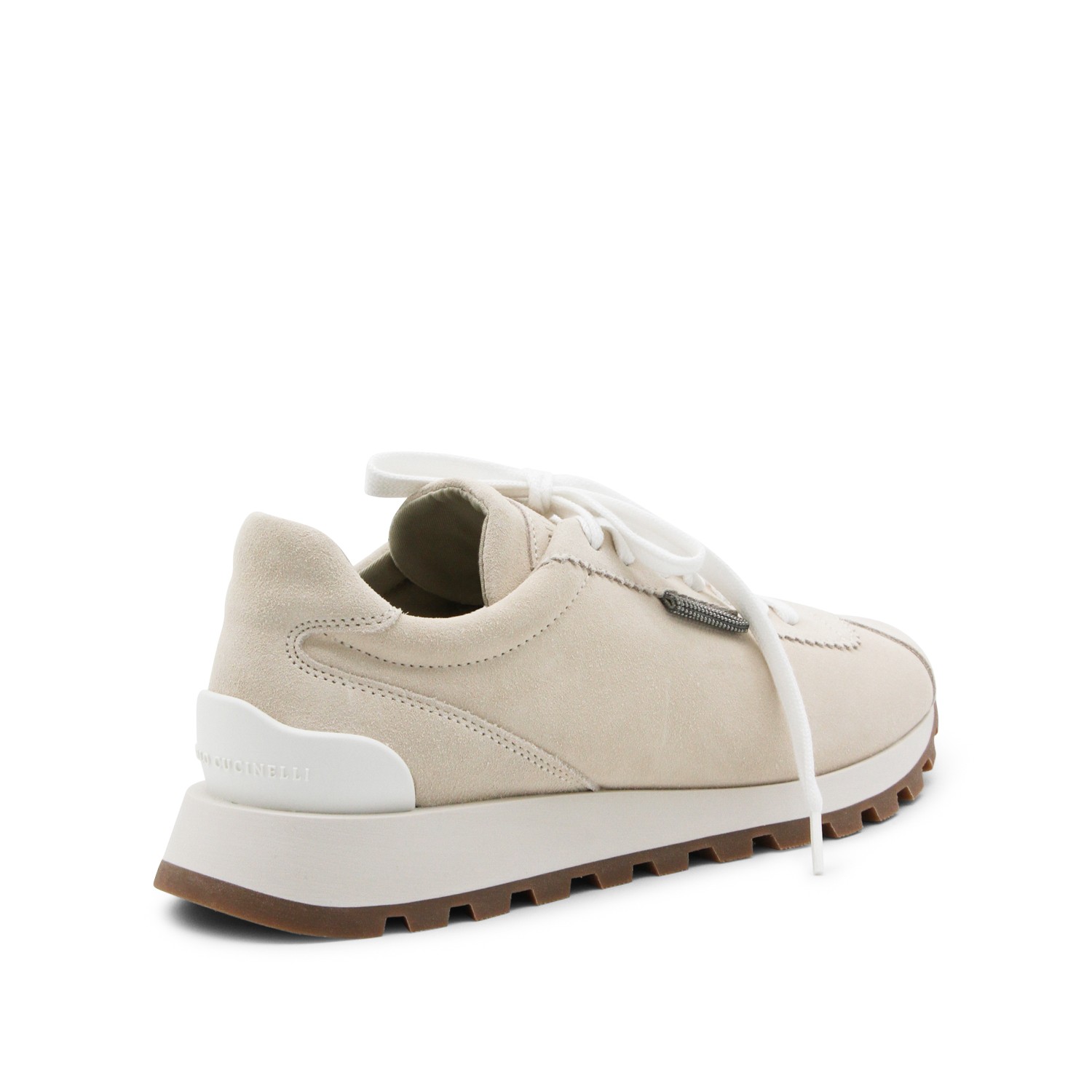 Ivory leather sneakers from Brunello Cucinelli featuring round toe, cotton lace up fastening, lateral detail and rubber sole.