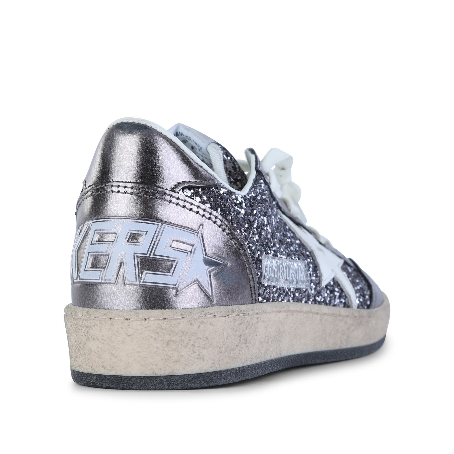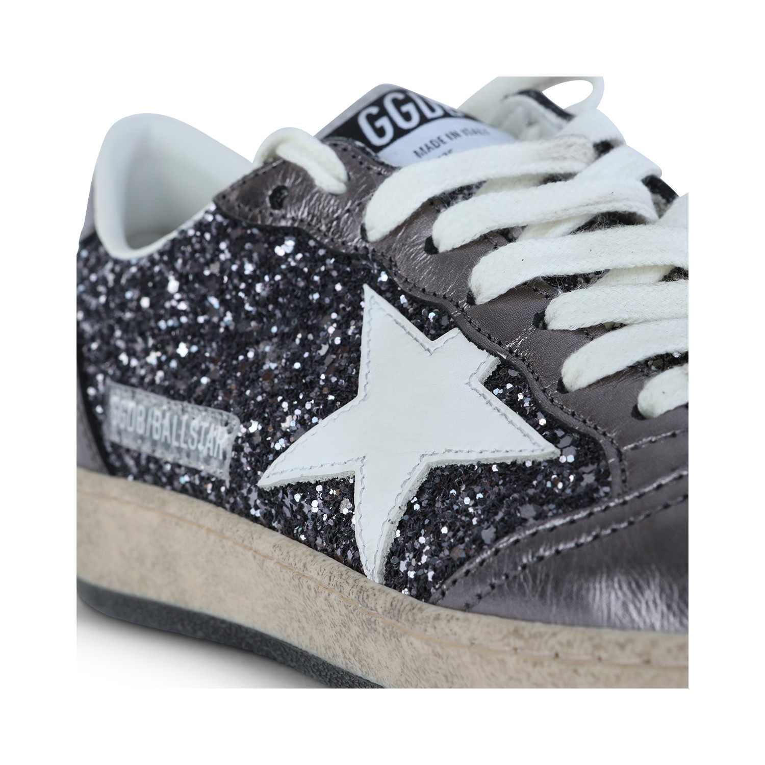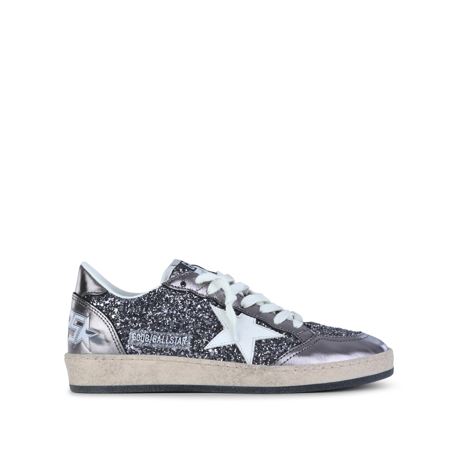 Grey and purple leather Ballstar sneakers from Golden Goose featuring round toe, cotton laces fastening, stained effect, contrasting patch, rubber sole and branded insole.