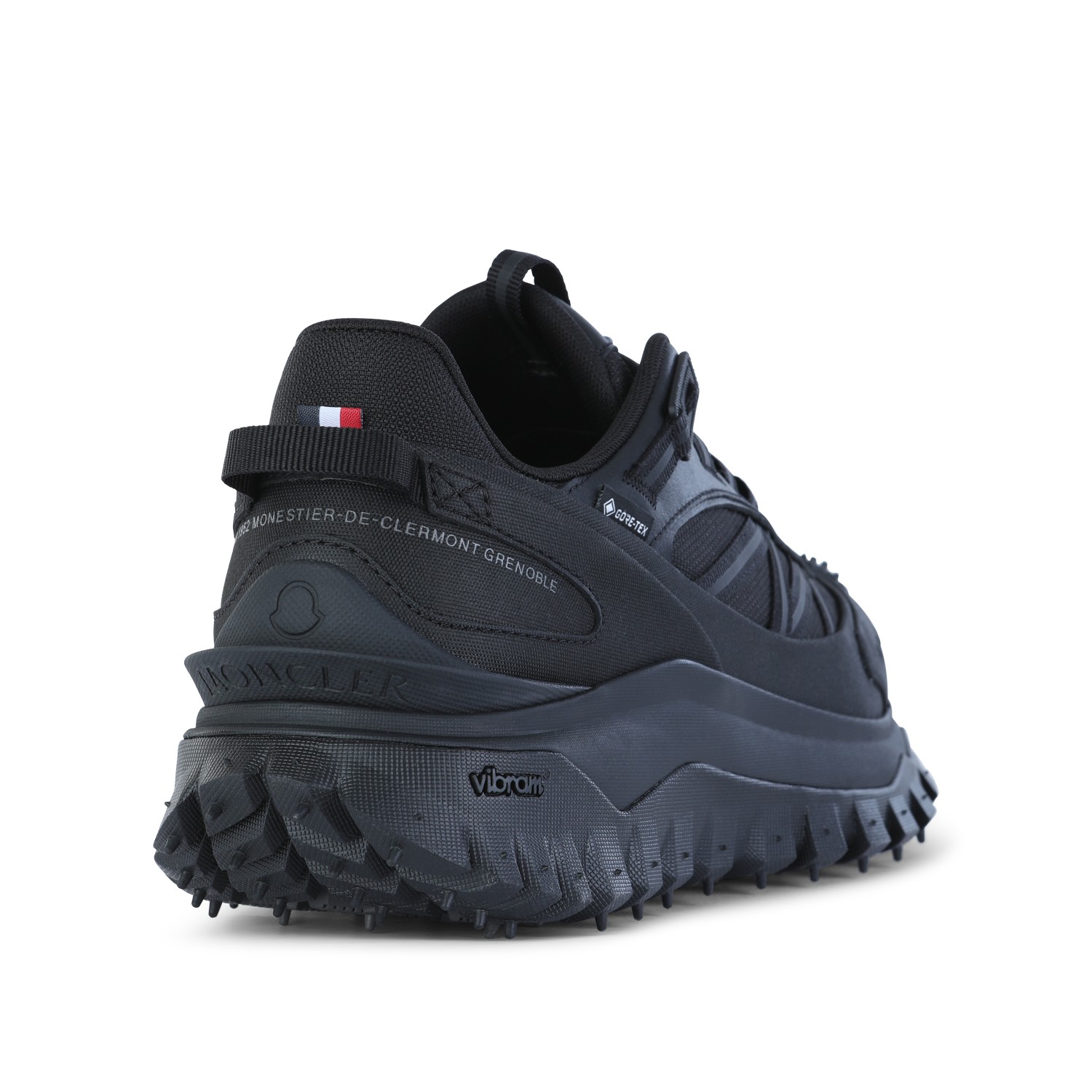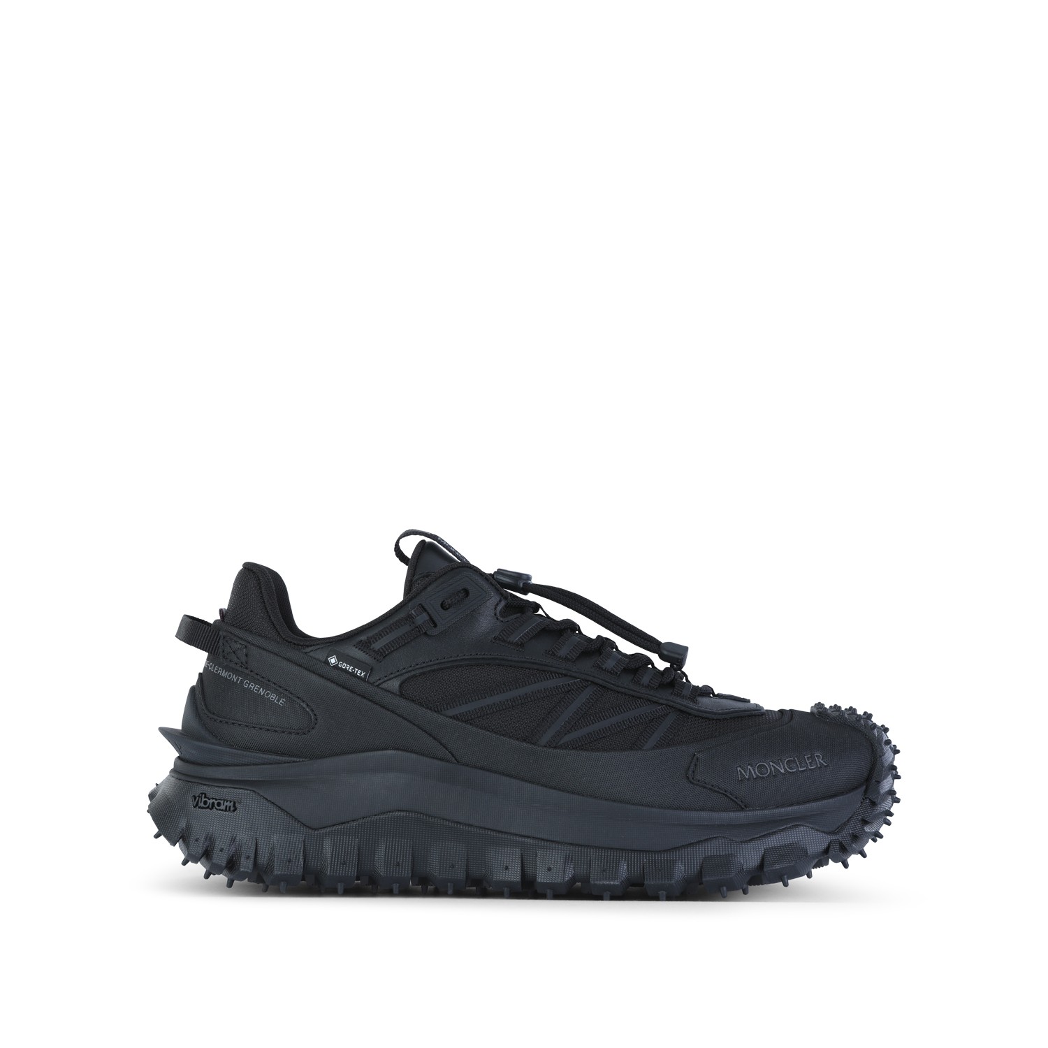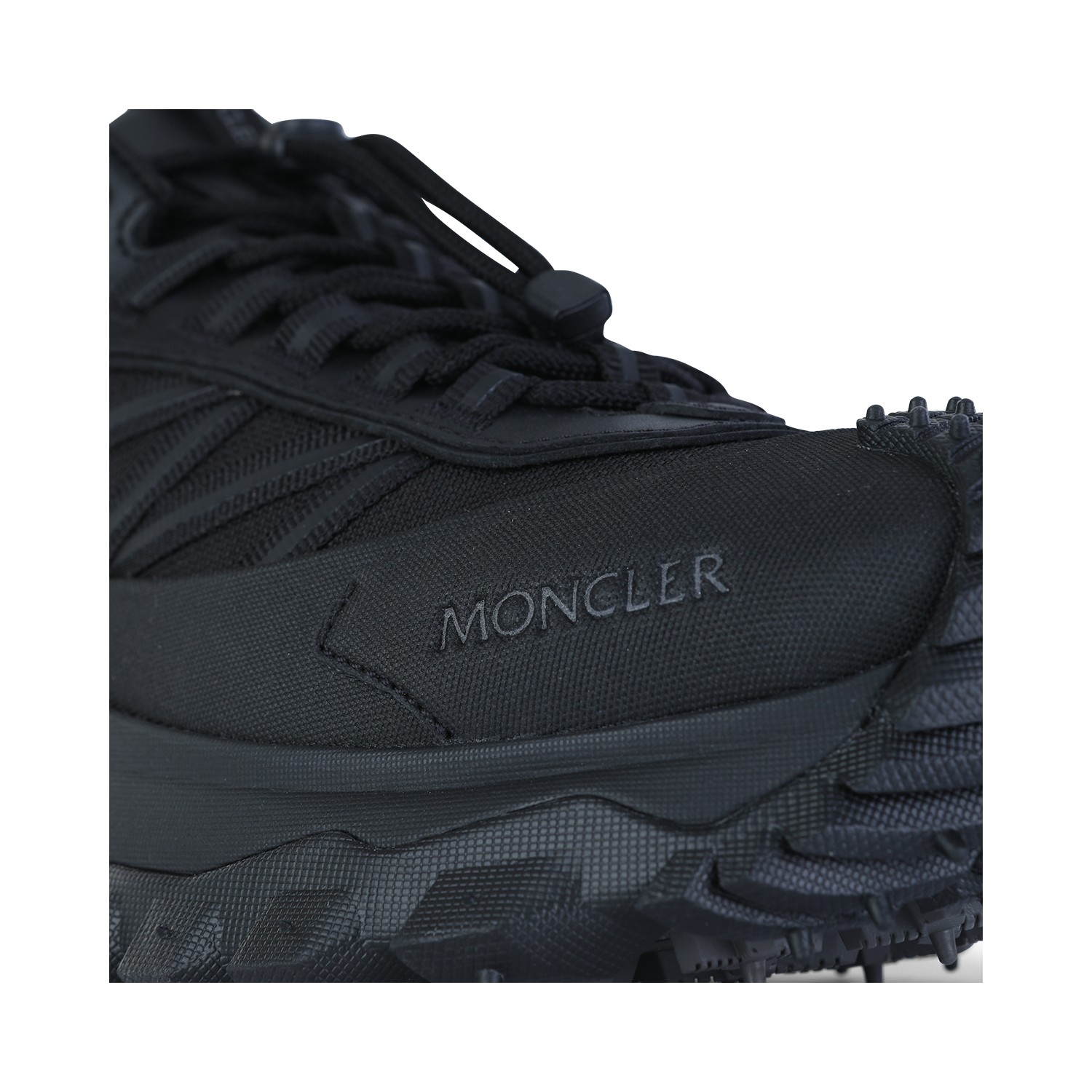 Black leather sneakers from Moncler featuring round toe, lace up fastening, all over details and rubber sole.