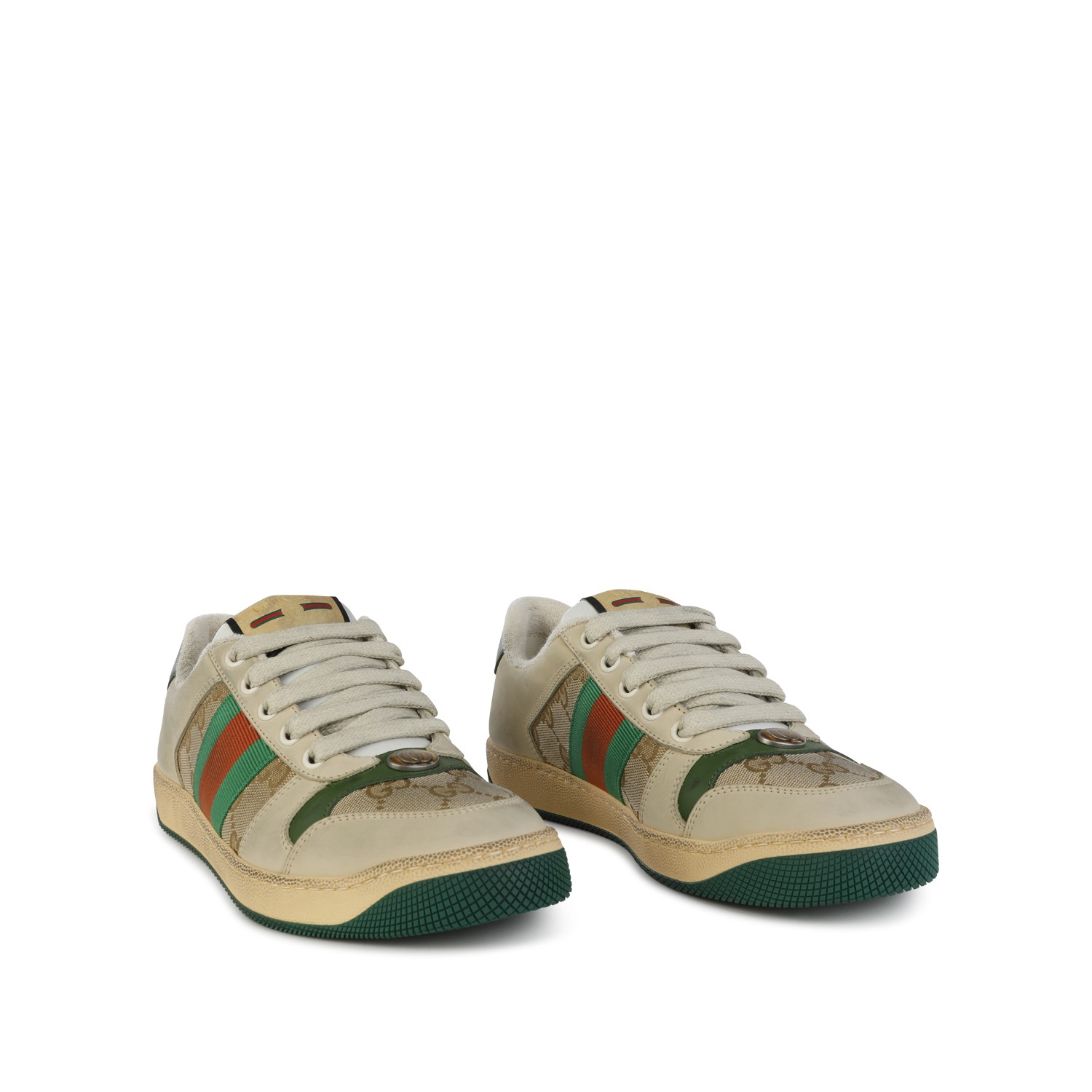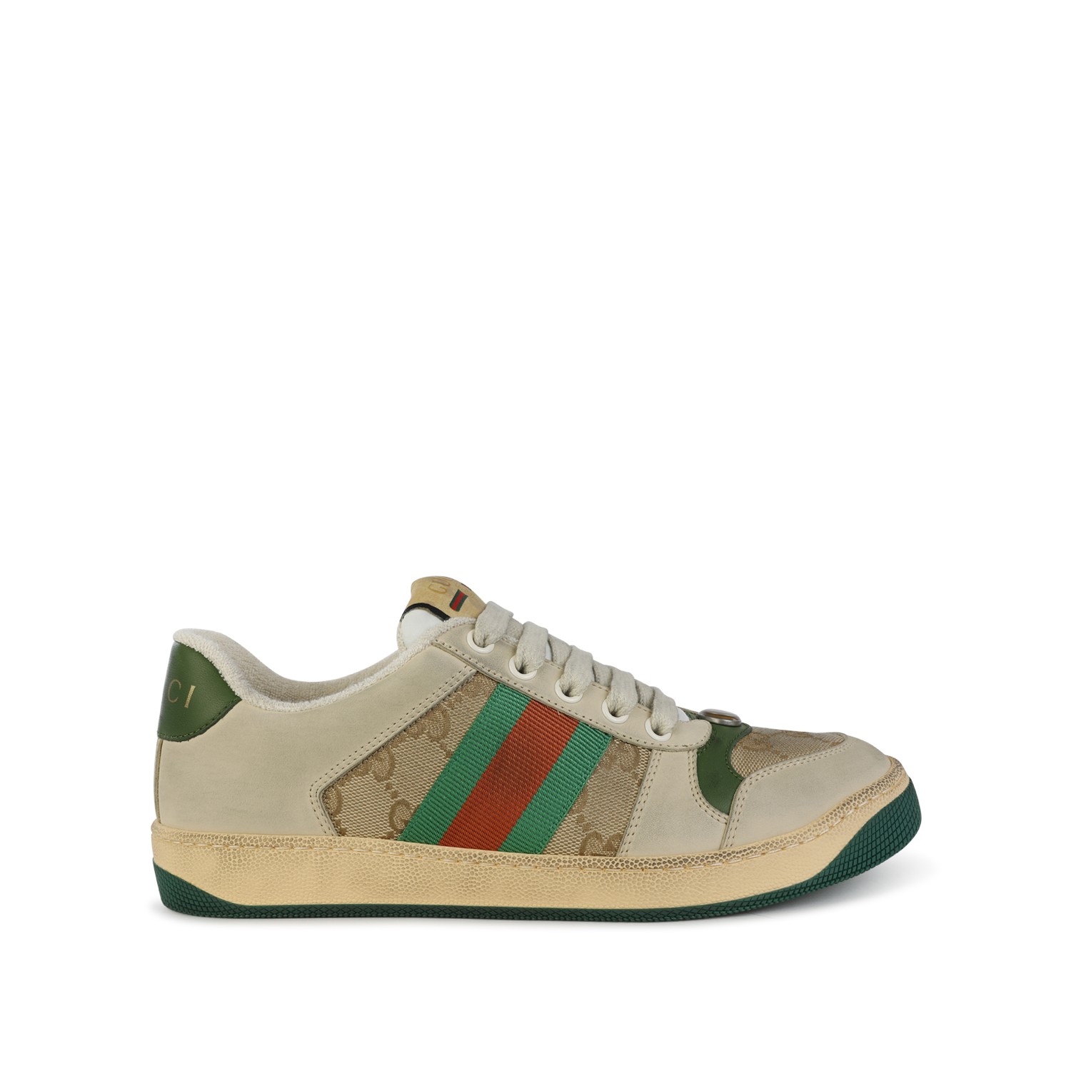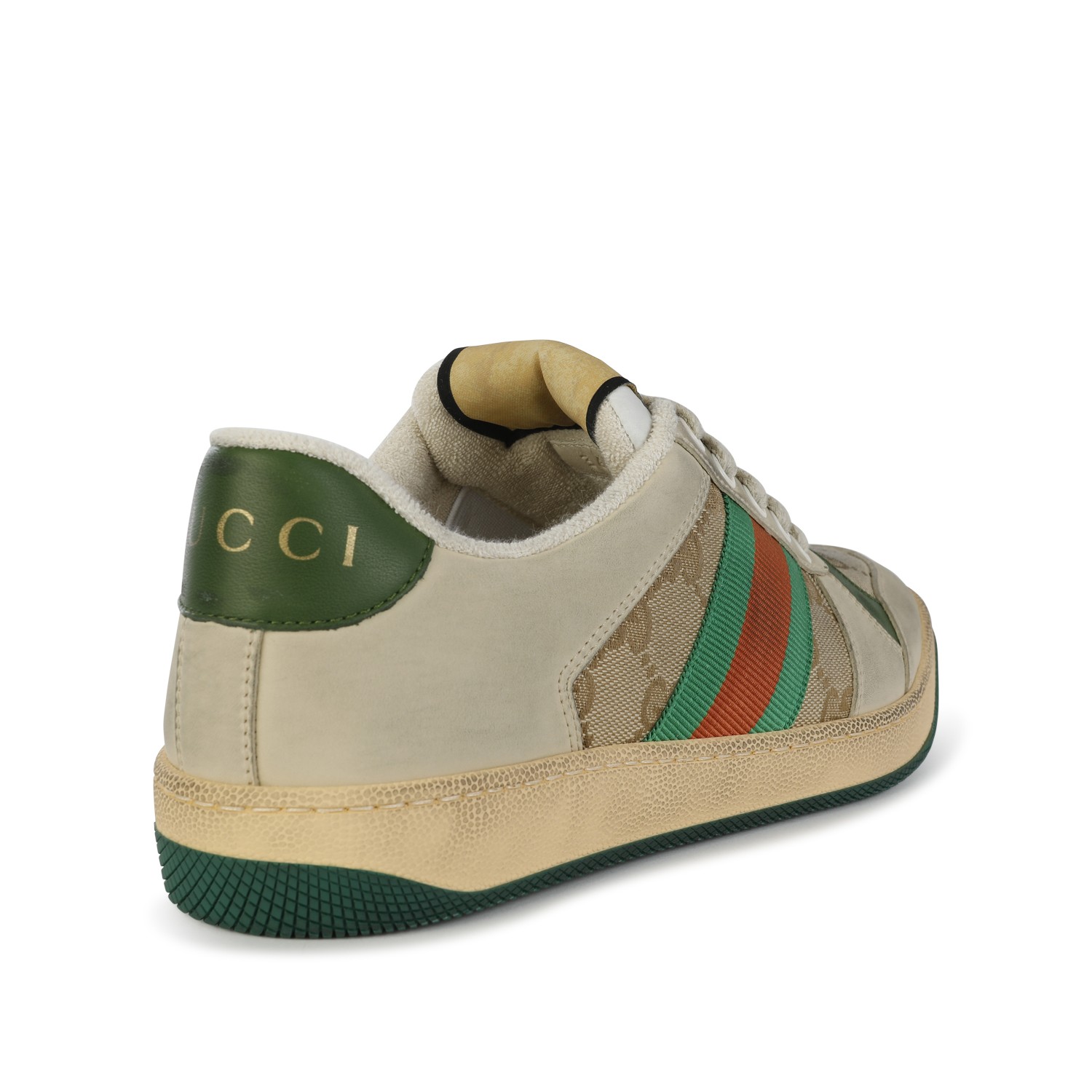 Beige sneakers from Gucci featuring round toe, cotton laces fastening, GG pattern, rubber sole and details.
