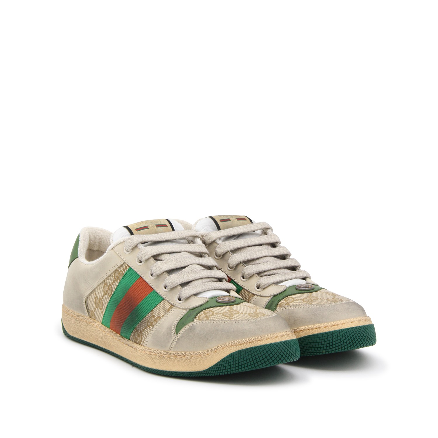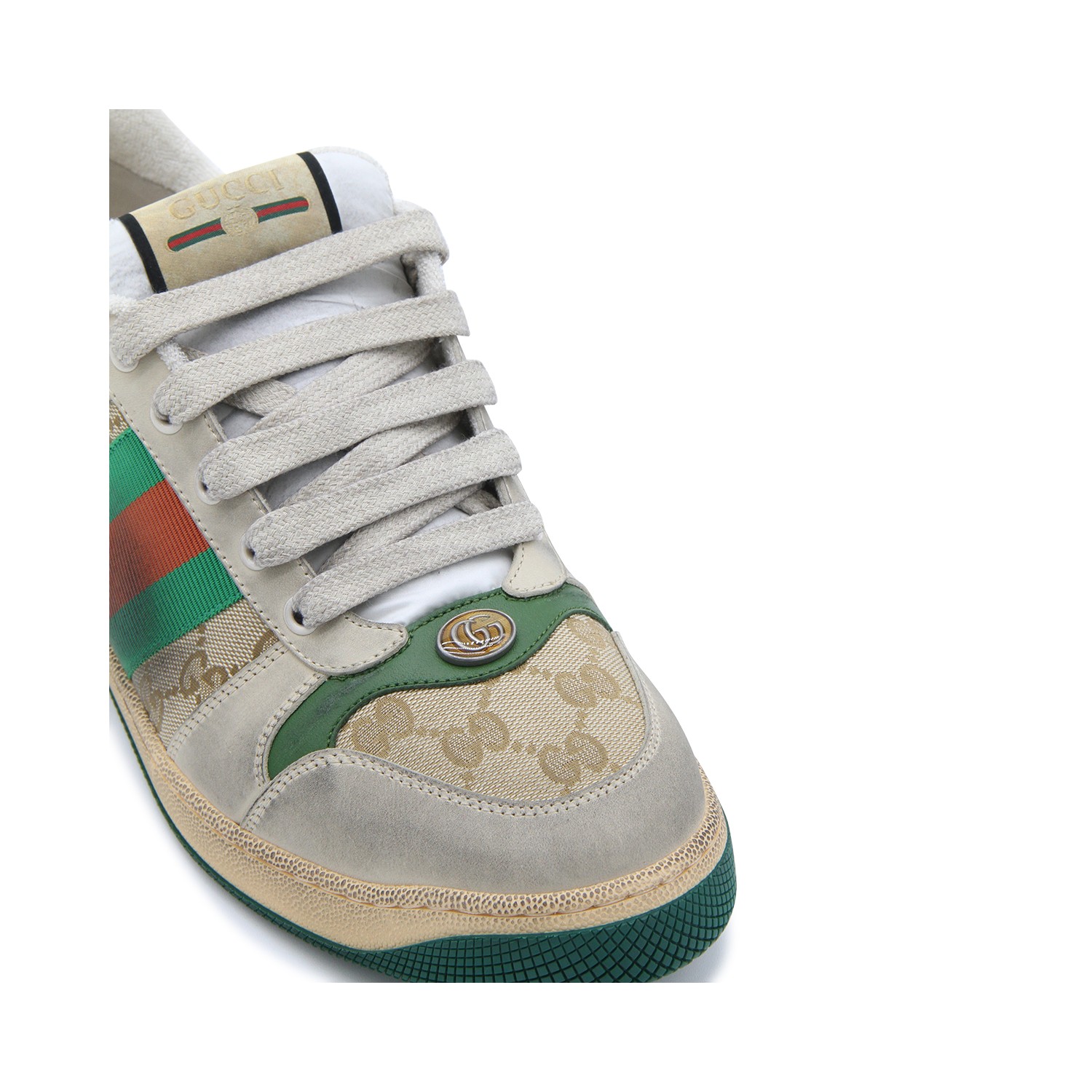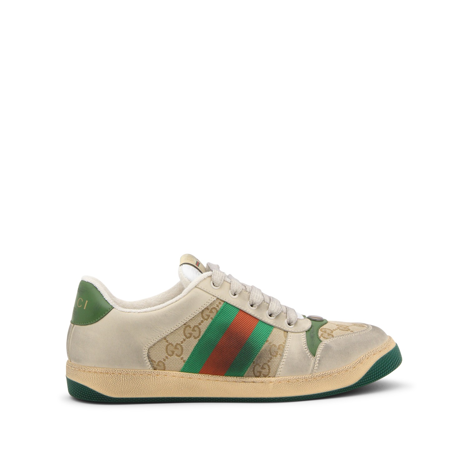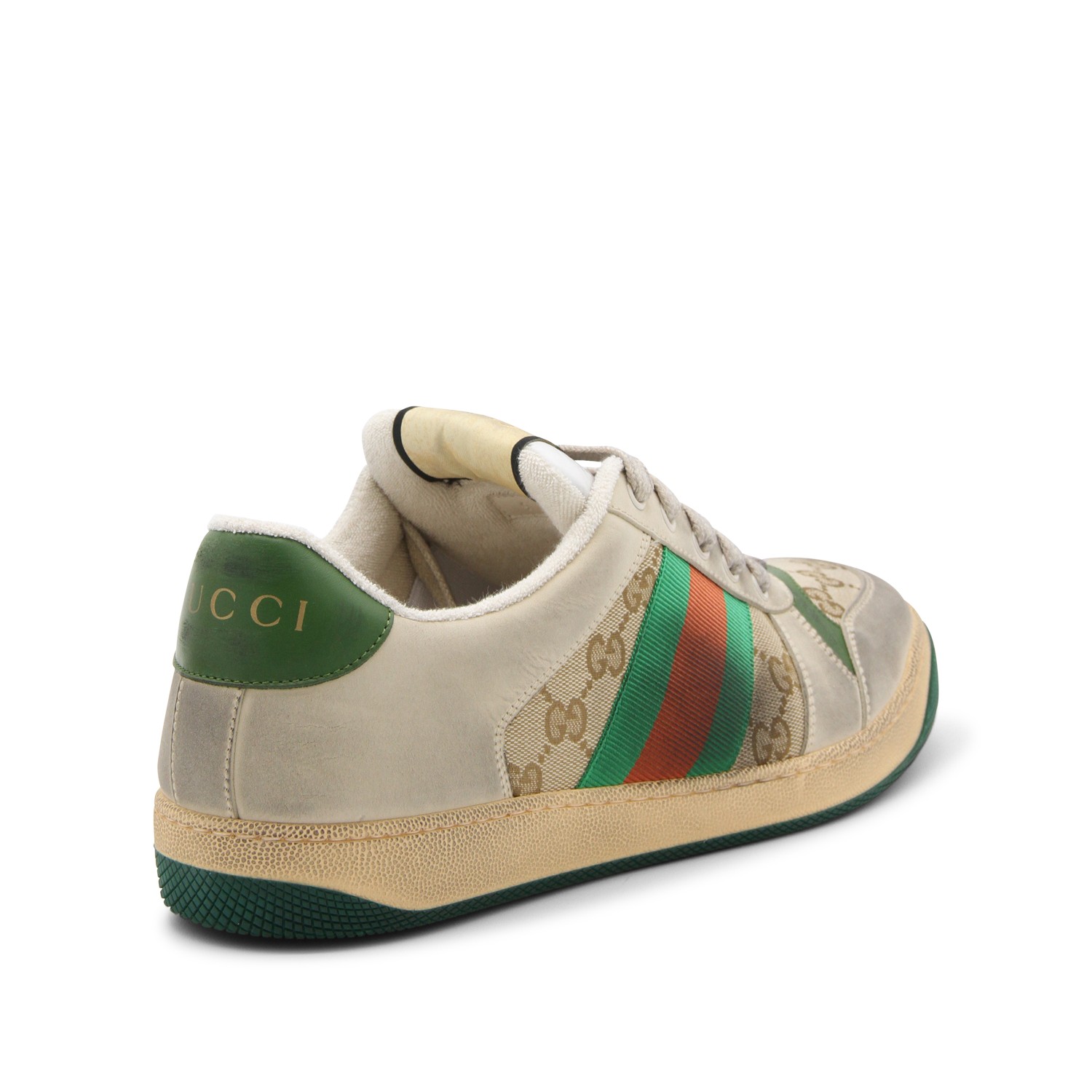 Beige, green, orange canvas and leather Screener sneakers from Gucci featuring round toe, front logo plaque front lace-up fastening, vintage effect, branded insole and flat rubber sole.