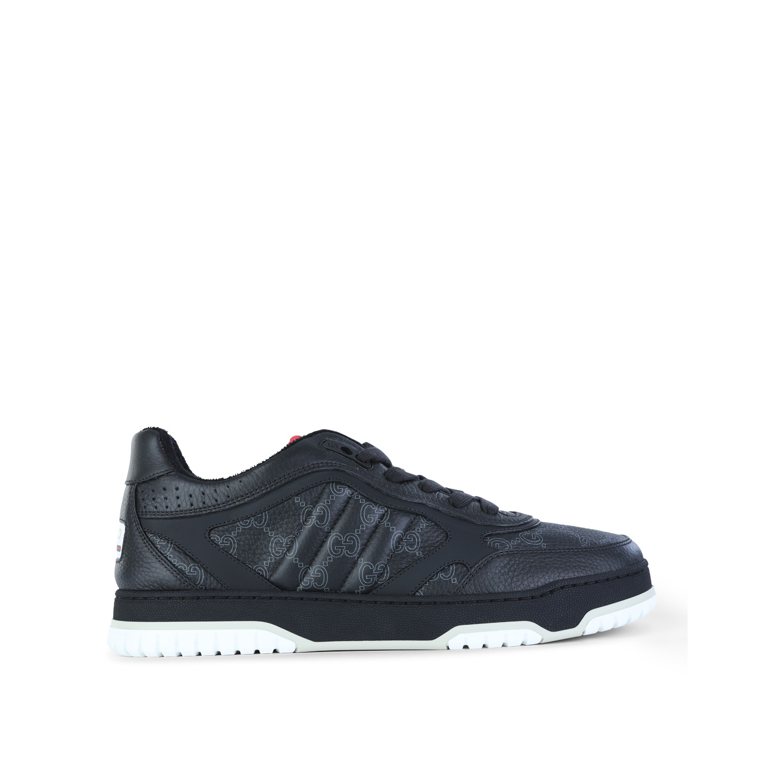 Black leather sneakers from Gucci featuring round toe, lace-up fastening, back logo, all over monogram and contrasting sole.