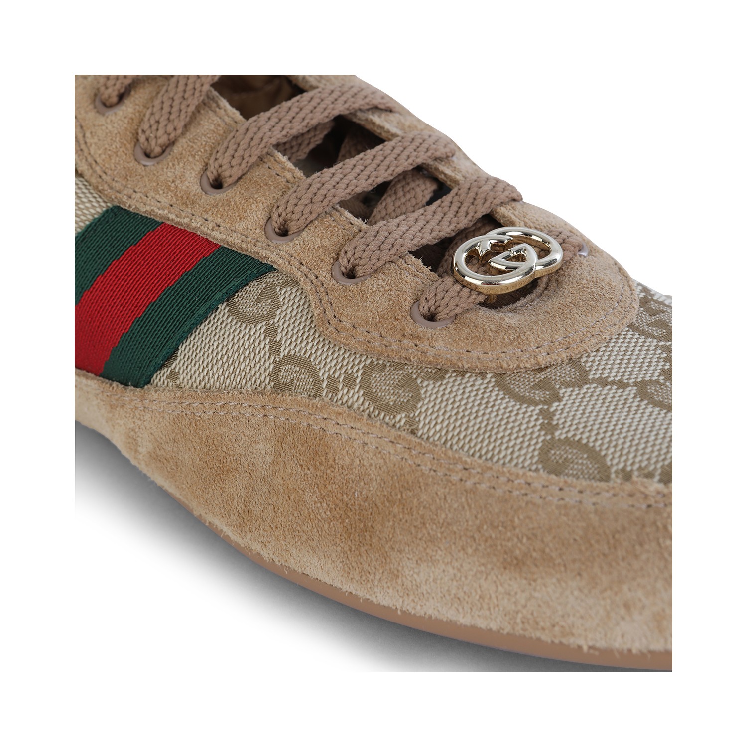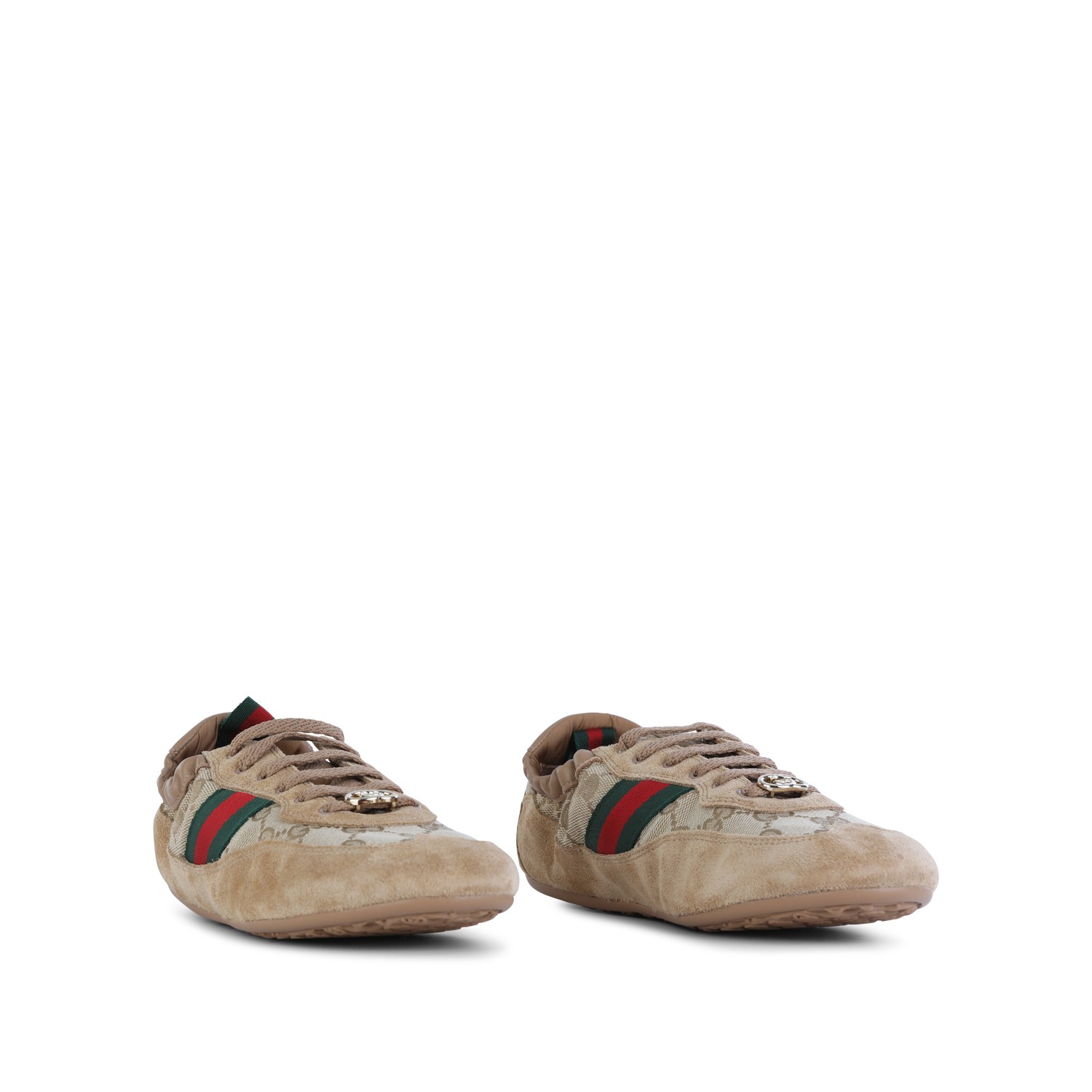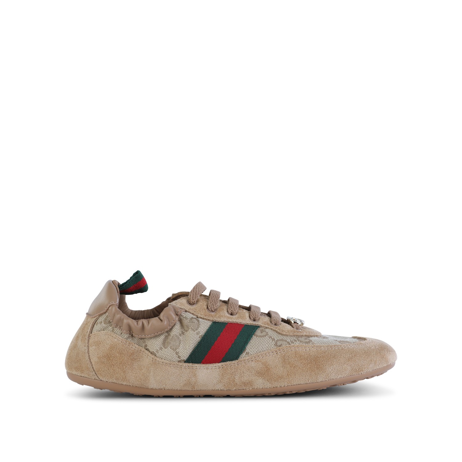 Beige leather sneakers from Gucci featuring round toe, lace-up fastening, elasticated waist, monogram, logo detail and leather sole.