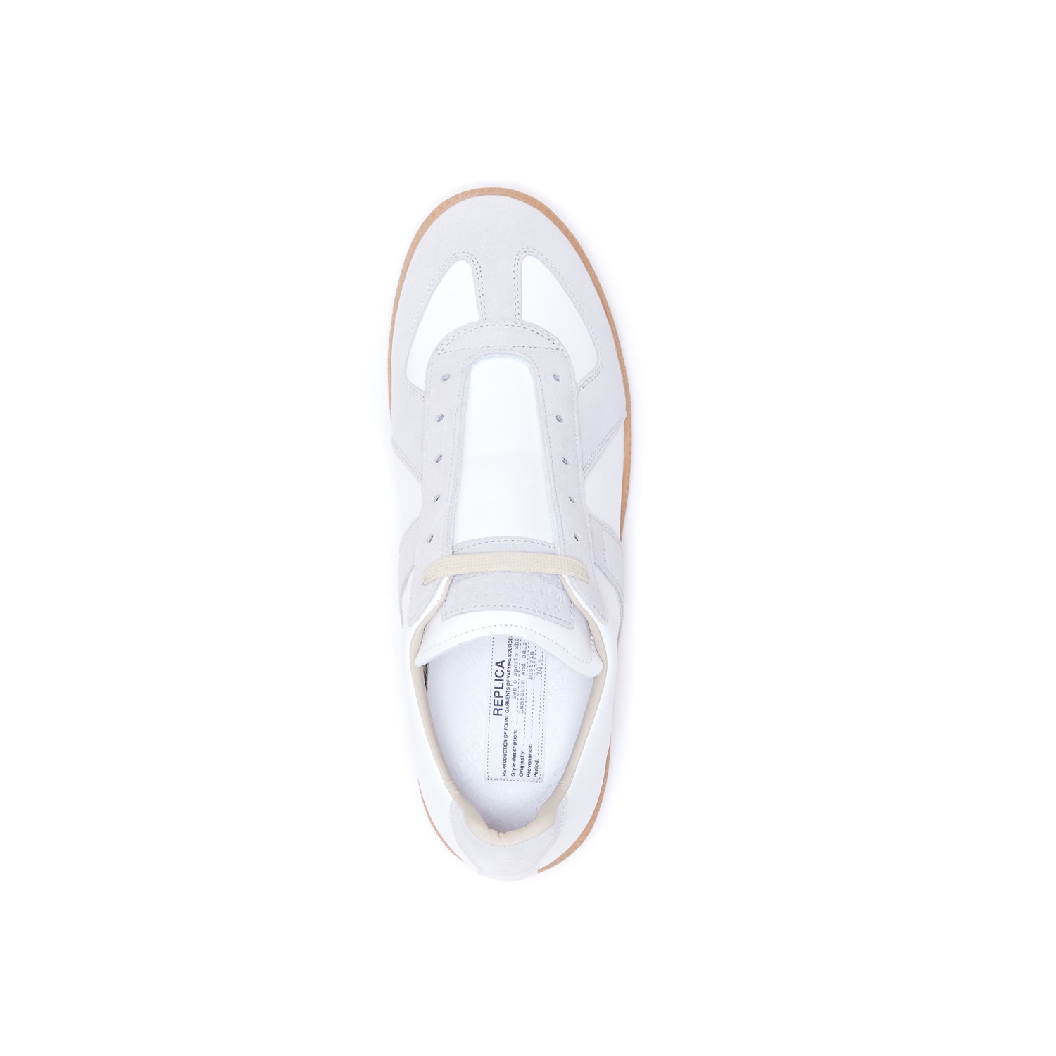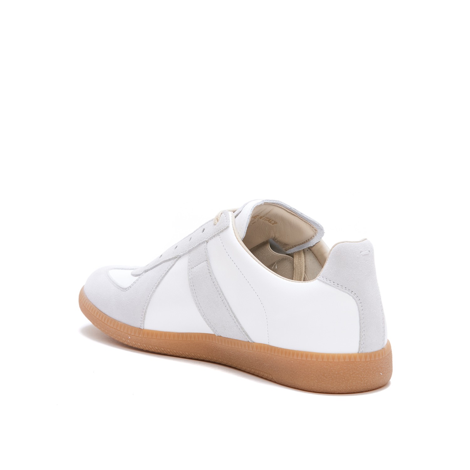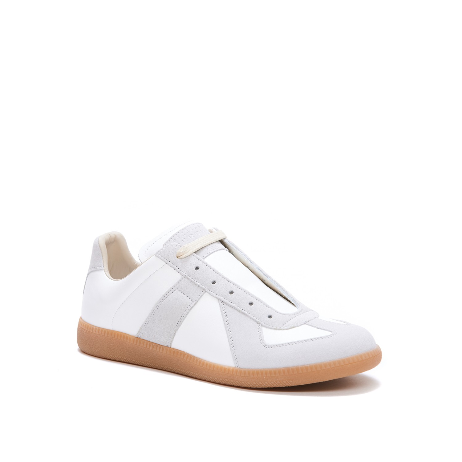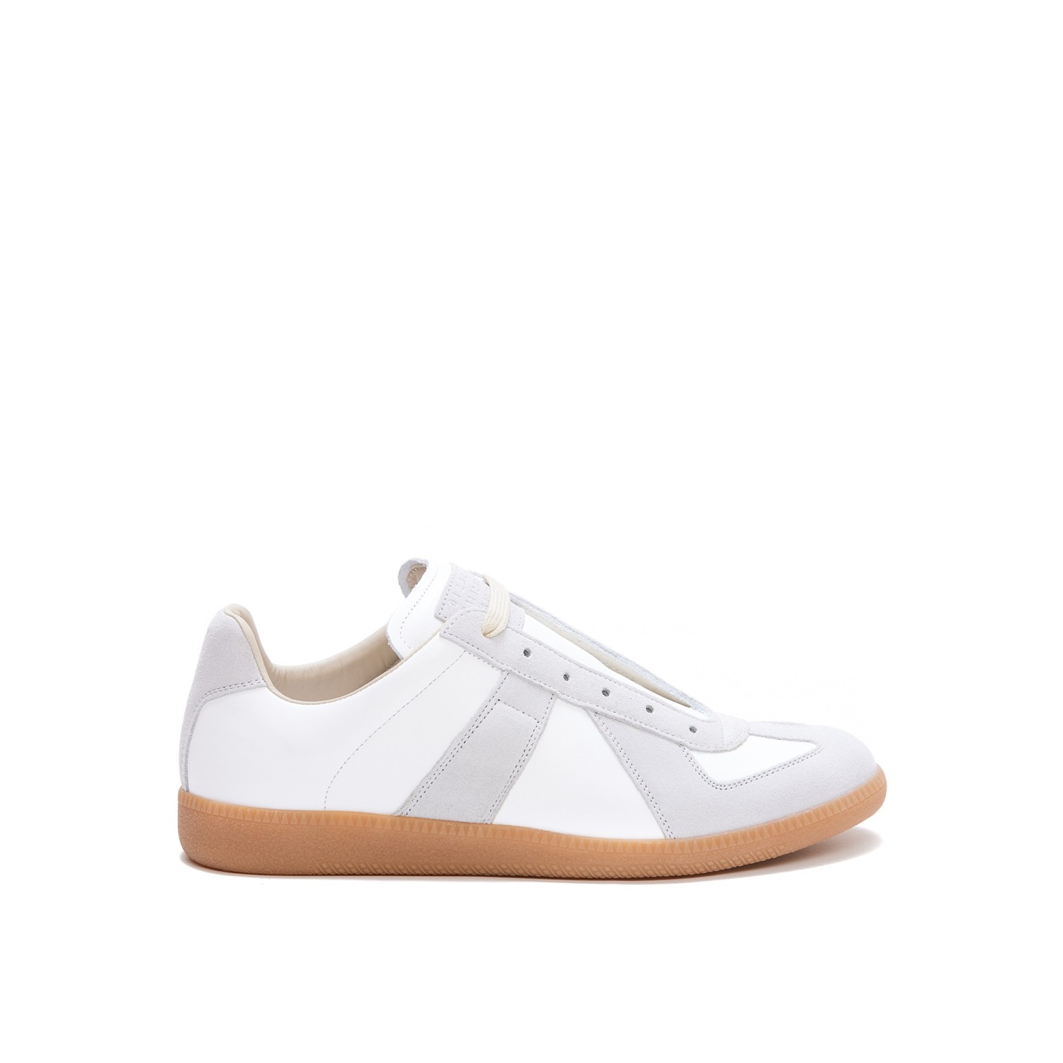 White leather sneakers from Maison Margiela featuring round toe, lace up fastening, contrasting details and rubber sole.