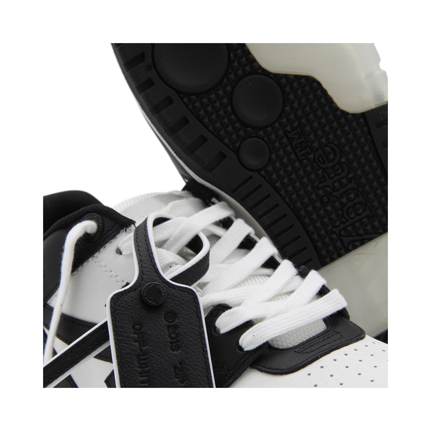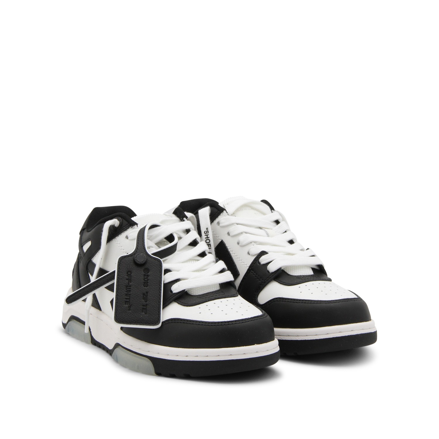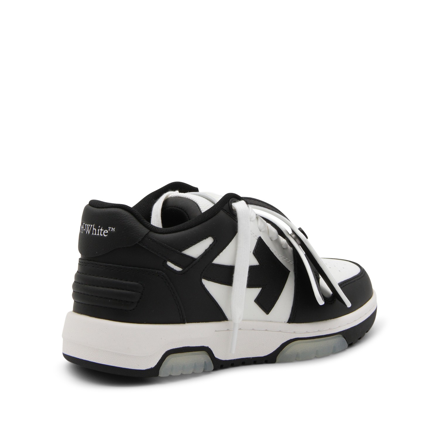 Black and white leather Out Of Office sneakers from Off White featuring round toe, cotton laces, rubber sole, logo label, Arrow contrasting detail at side and logo signature on the heel.