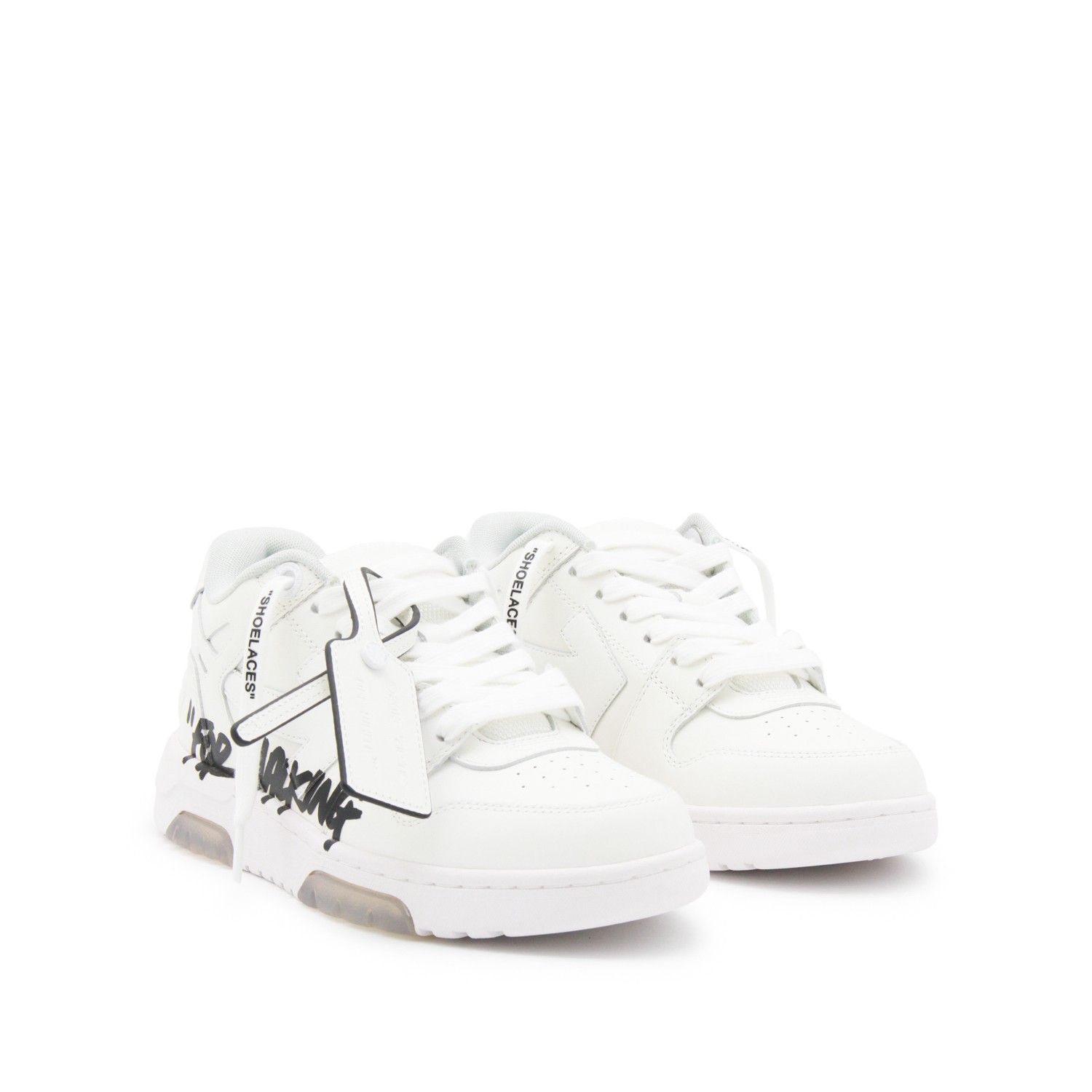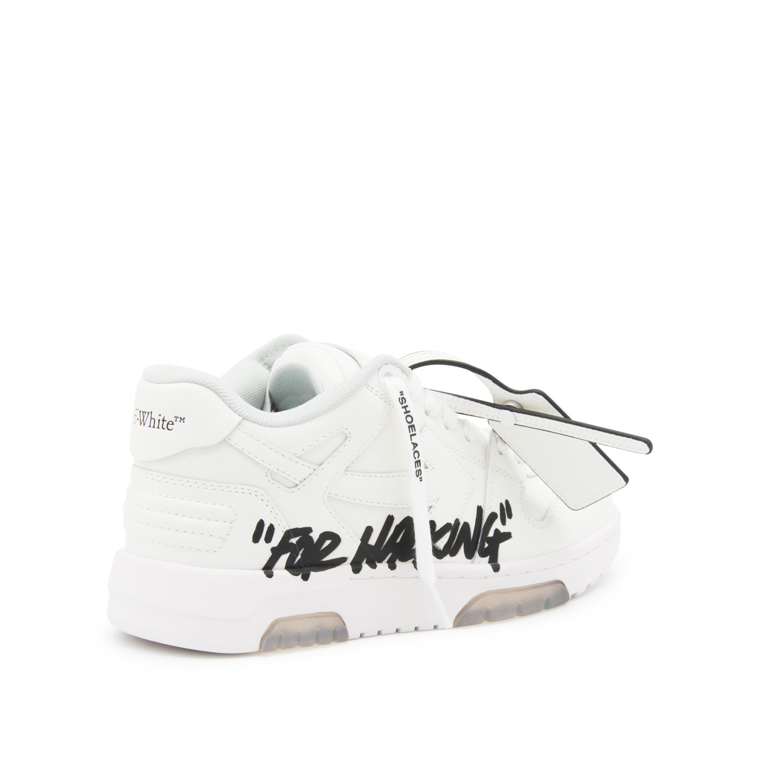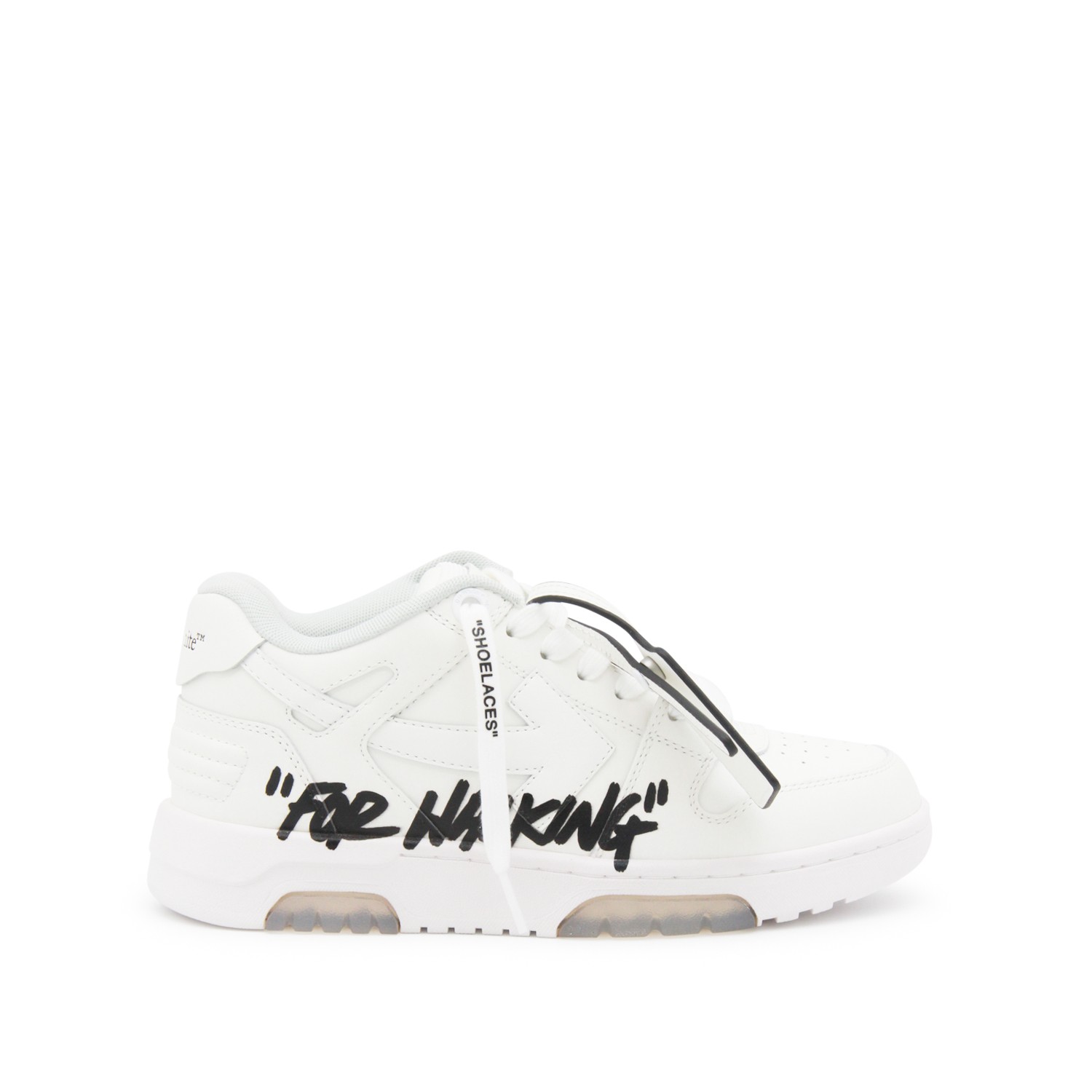 White leather Out Of Office sneakers from Off-White featuring round toe, cotton lace-up fastening, lateralwritten detail, logo stitching and rubber sole.