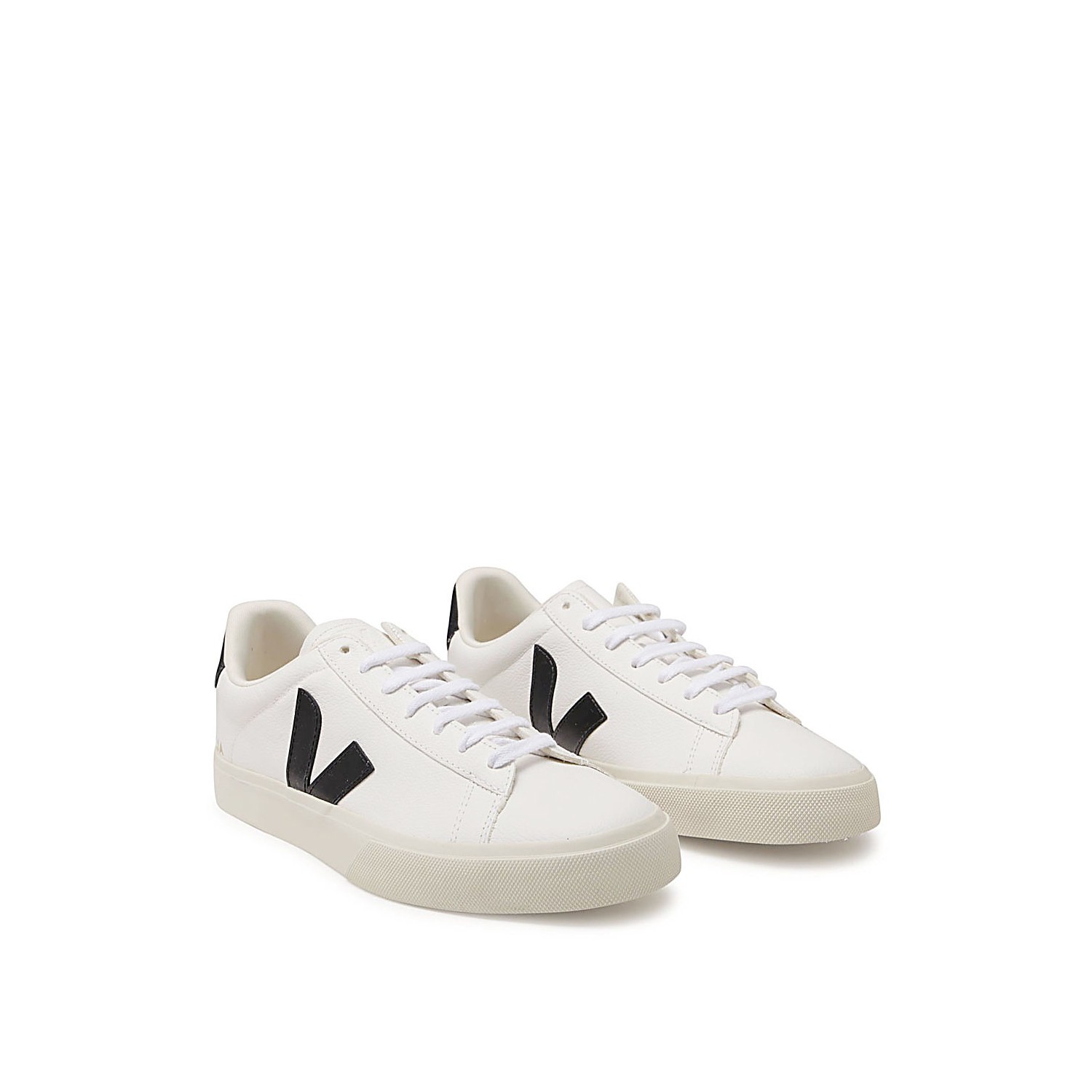 Black and white faux leather Campo sneakers from Veja featuring round toe, front lace-up fastening, logo patch at the tongue, logo print to the side, logo patch to the side, contrasting heel counter and flat sole.