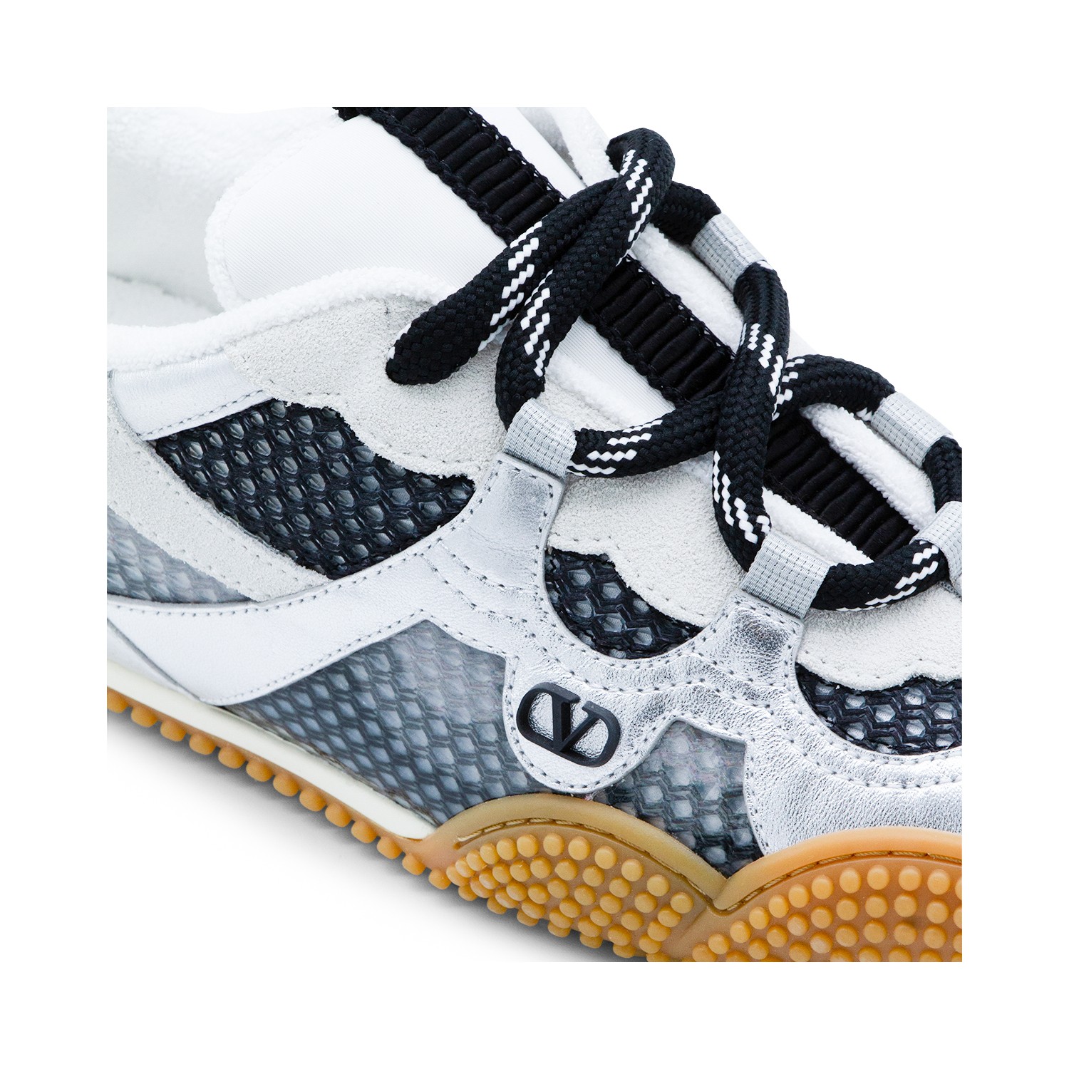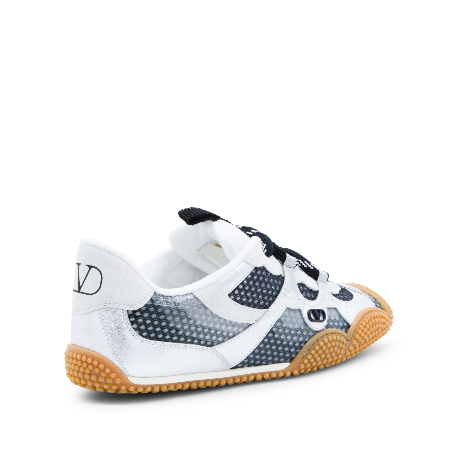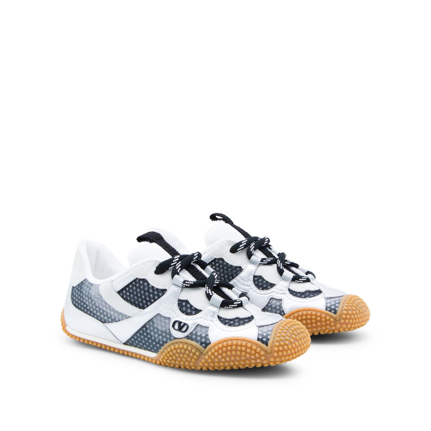 White and black leather Amphibia sneakers from Valentino Garavani featuring round toe, cotton lace-up fastening, lateral logo rubber detail, logo detail on the abck, striped fabric pull tab and custom rubber sole with scallops pattern.