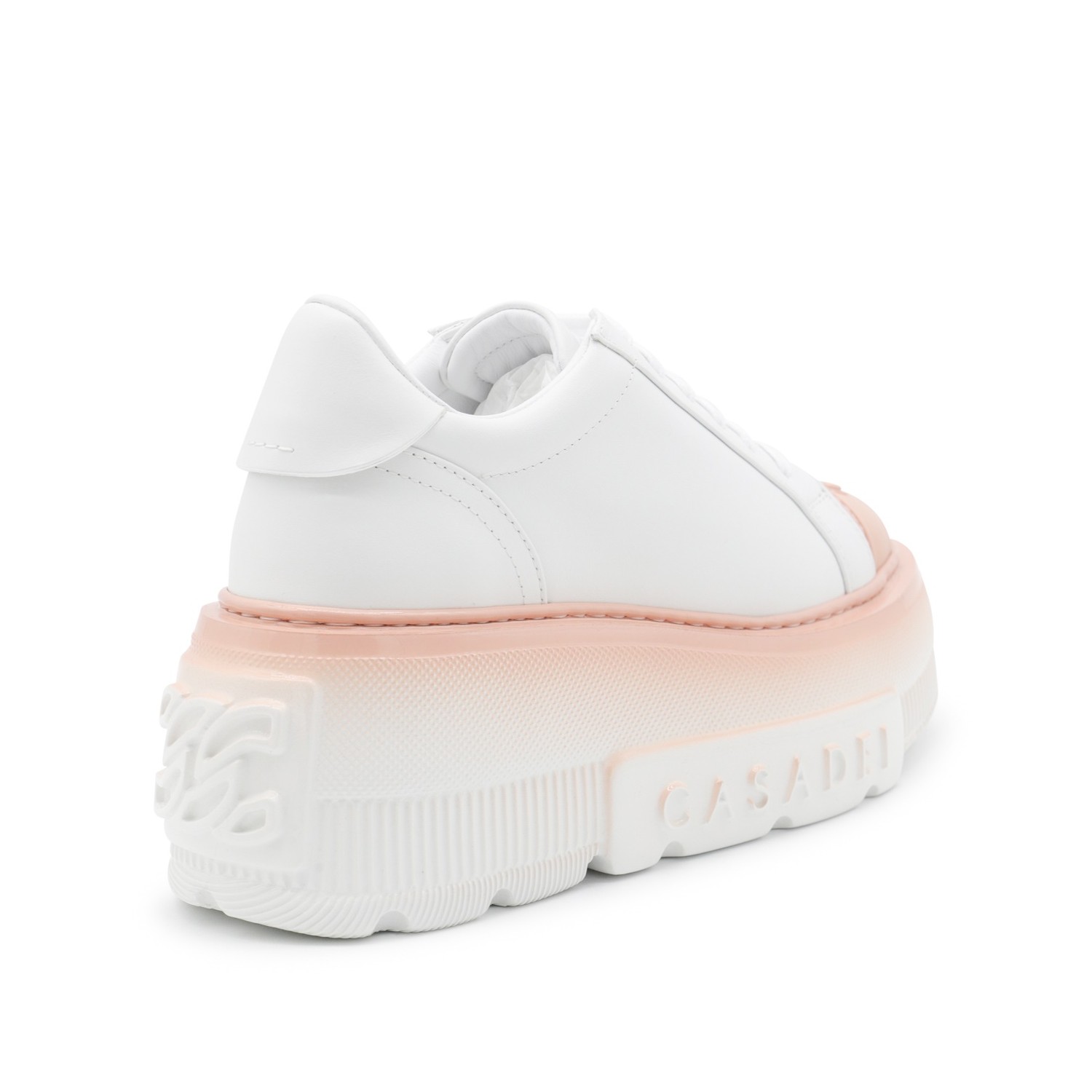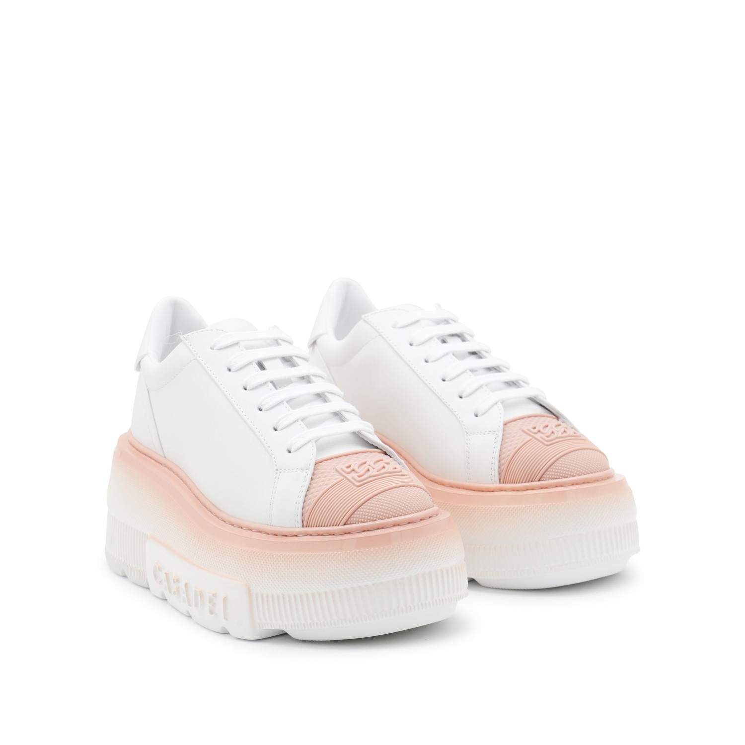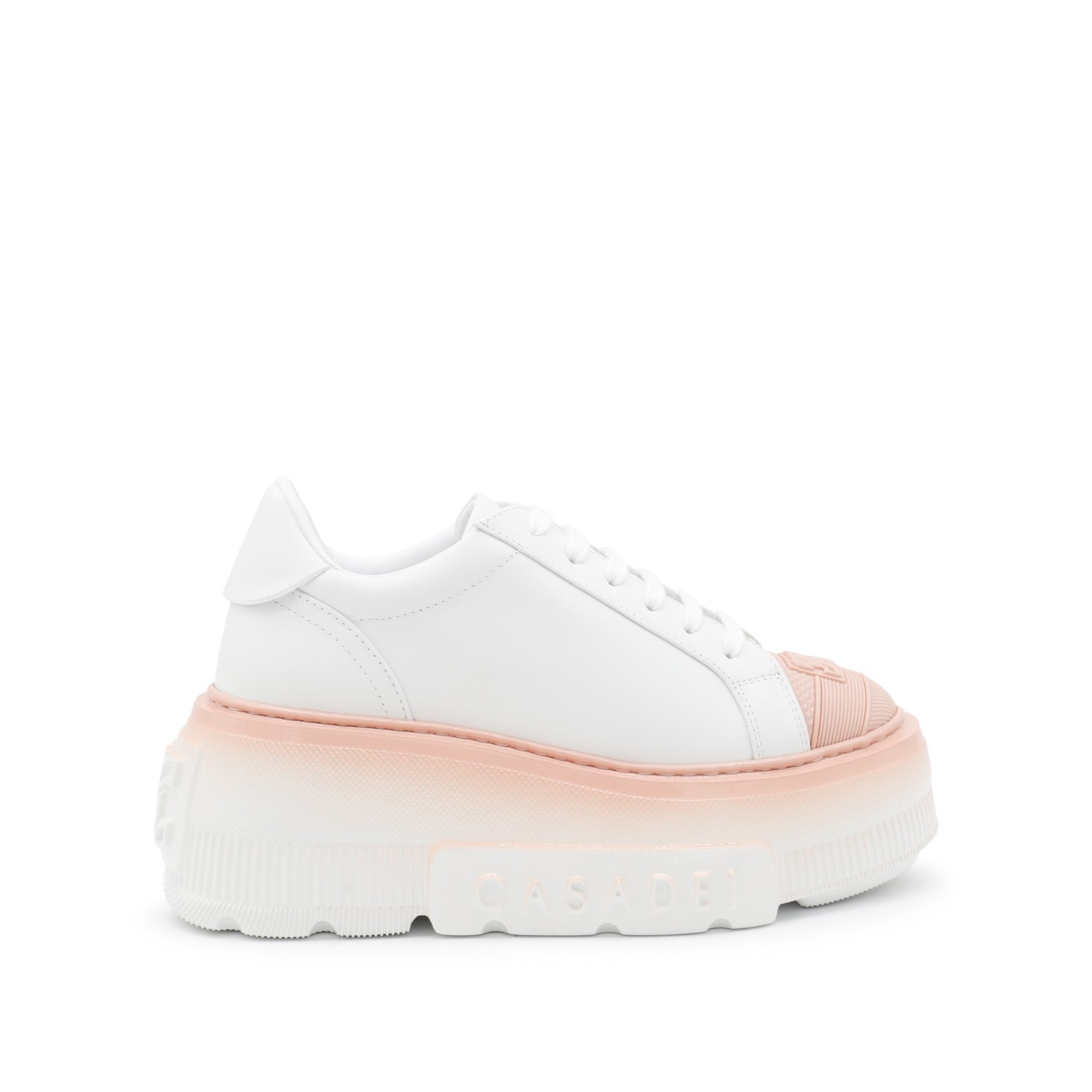 White and pink leather Nexus Tiffany sneakers from Casadei featuring round toe, cotton lace-up fastening, frontal patch, rubber sole and rubber logo patch on the sole.