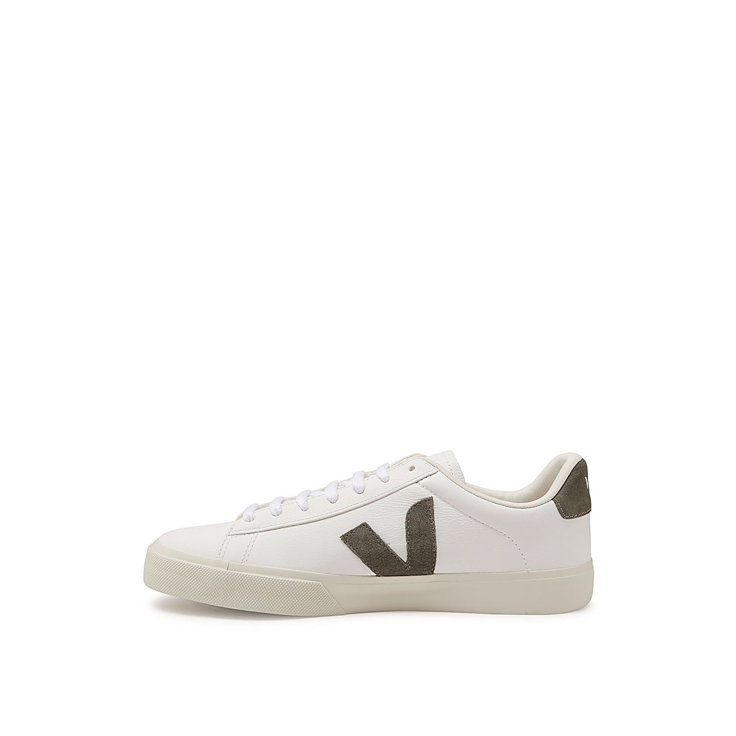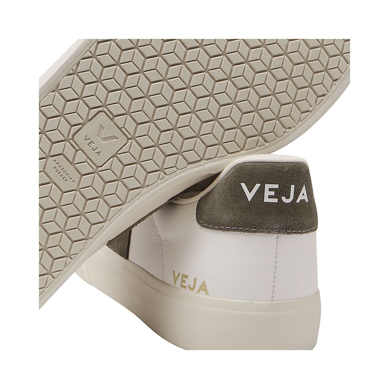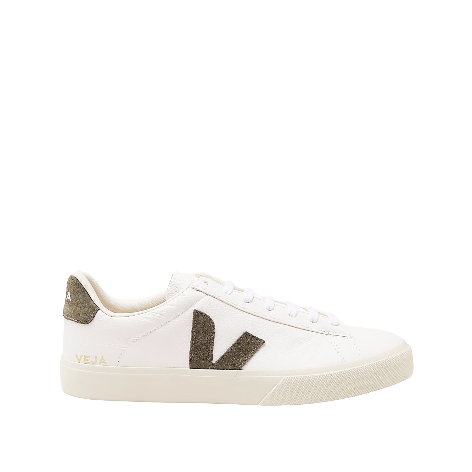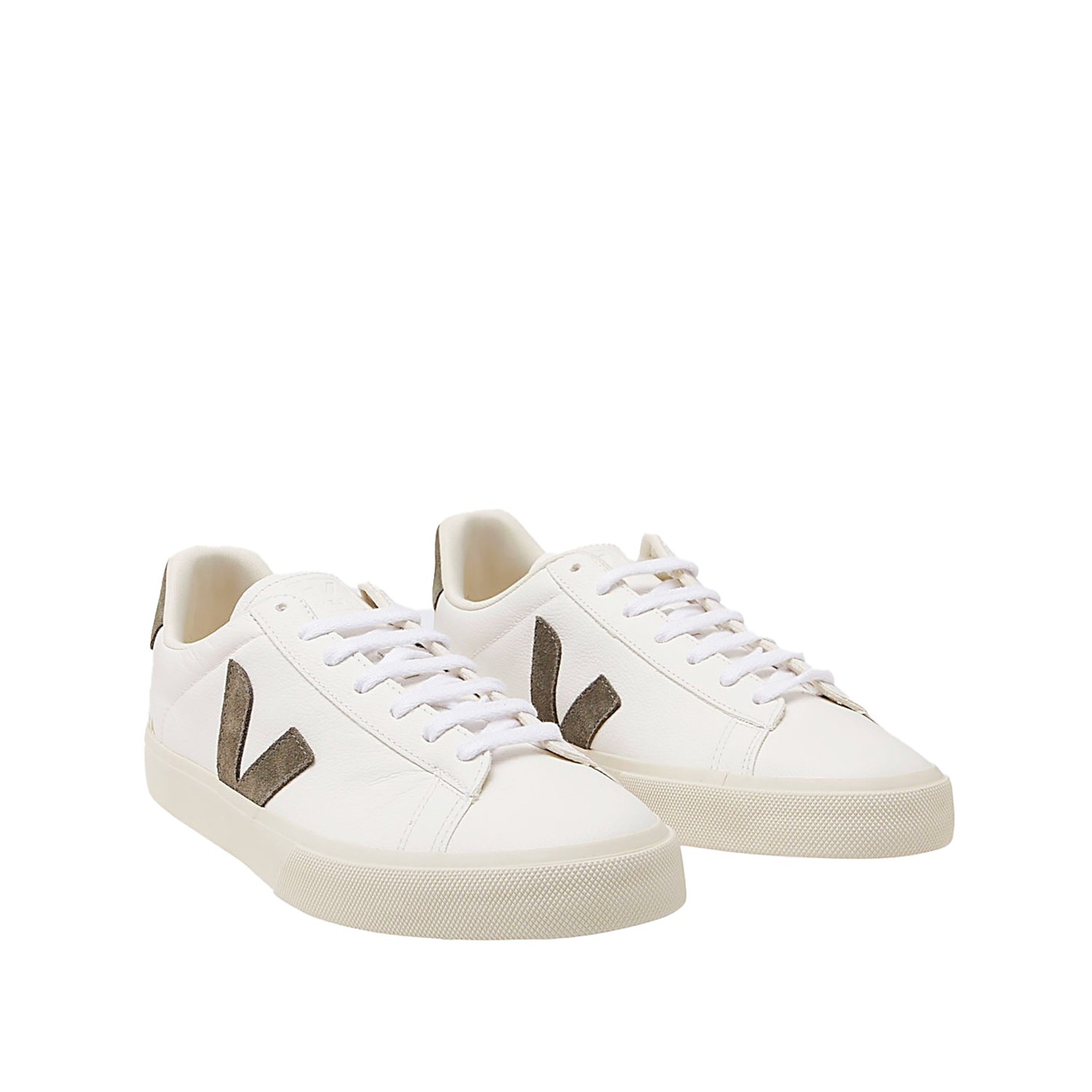 White and brown leather Campo sneakers from Veja featuring round toe, laces fastening, contrasting side logo patch, branded tongue and flat rubber sole.