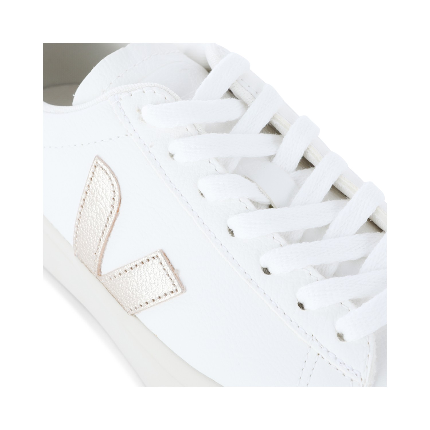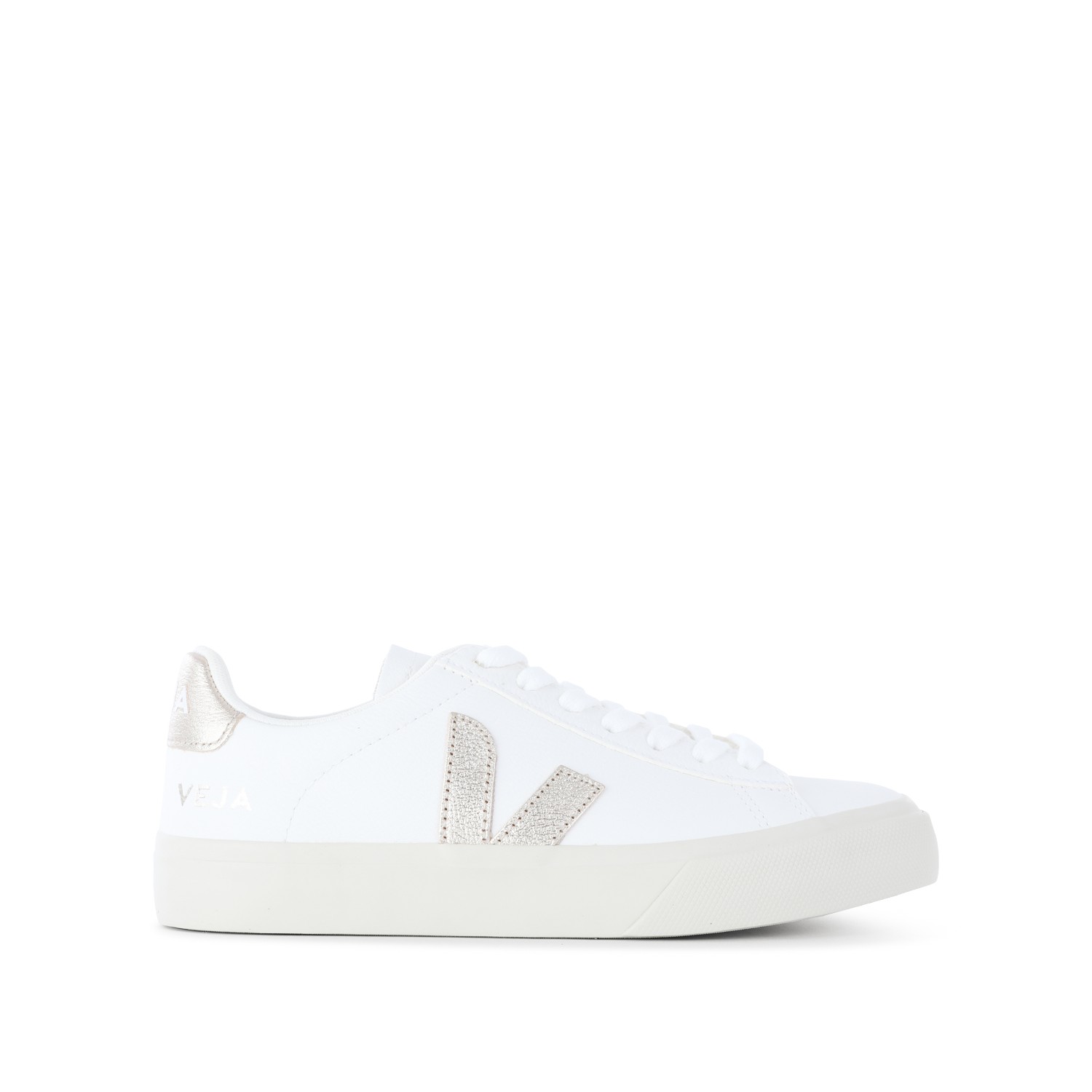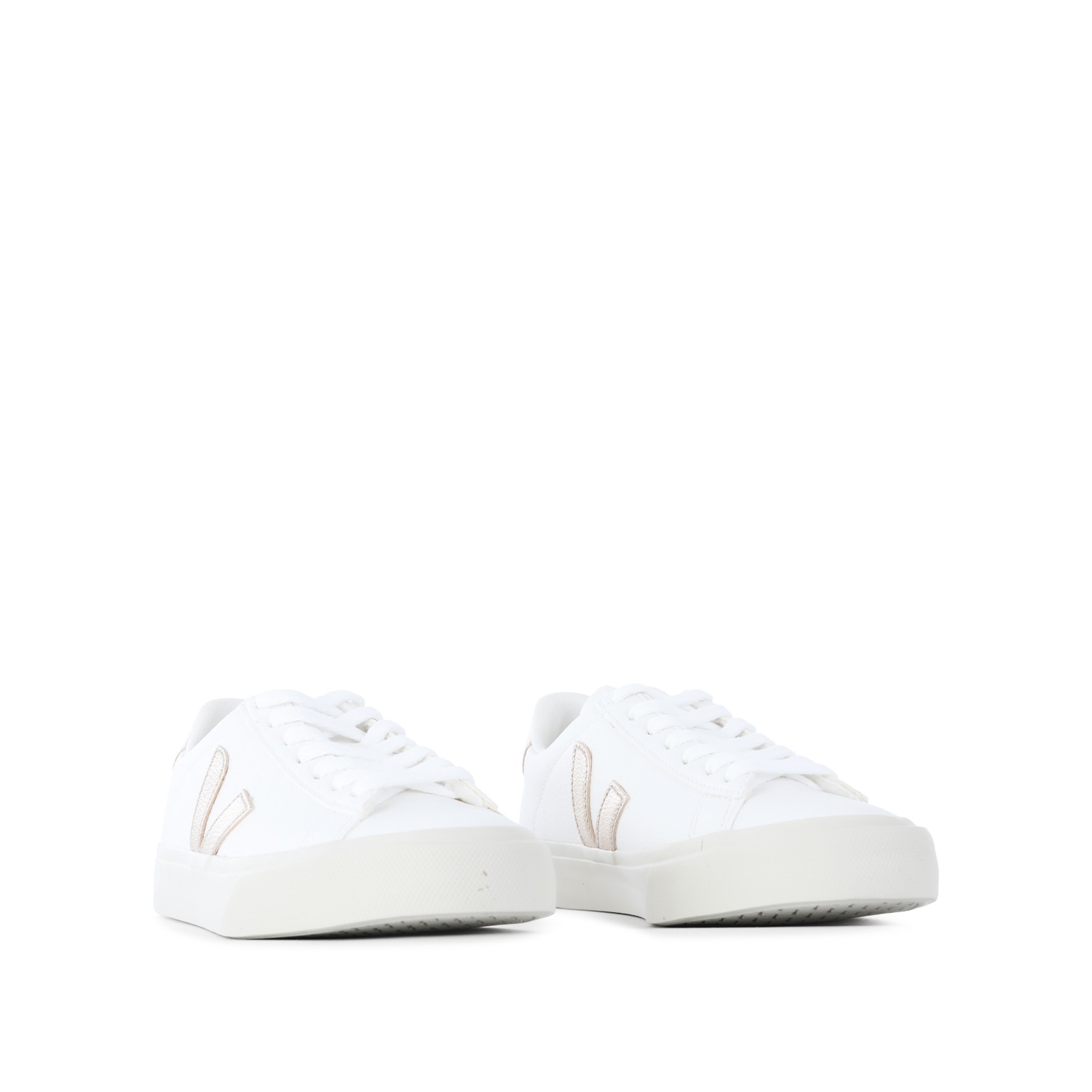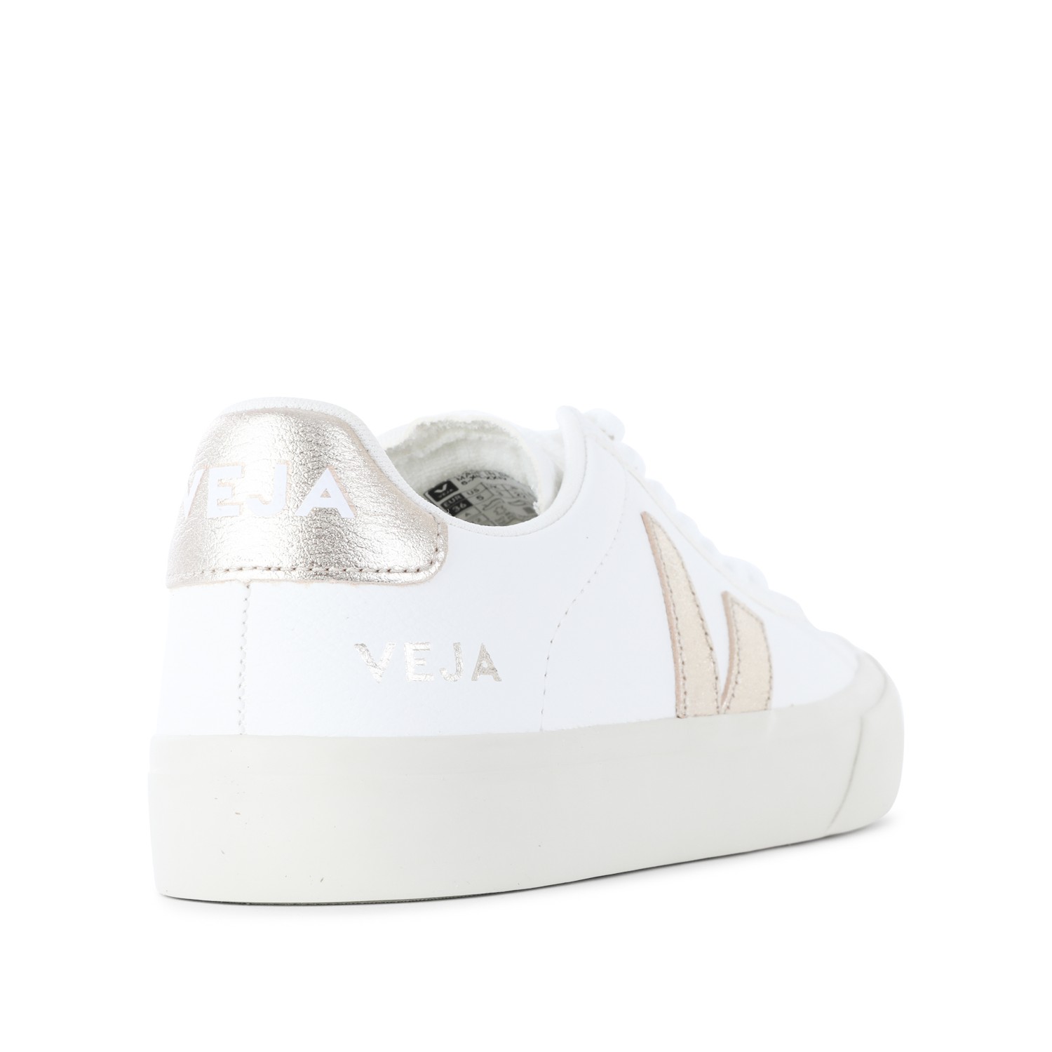 White and gold Campo sneakers from Veja featuring round toe, cotton laces, leather sole and logo detail.