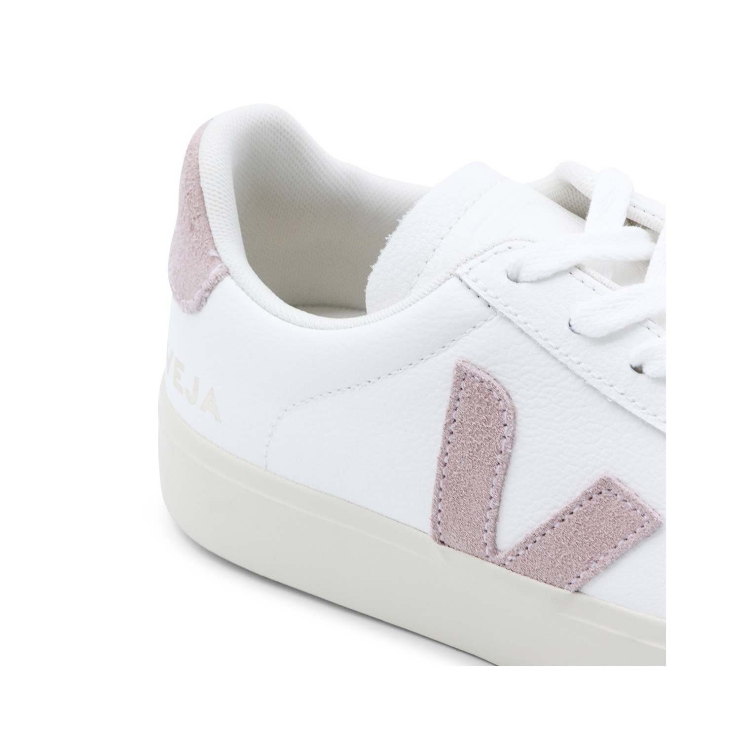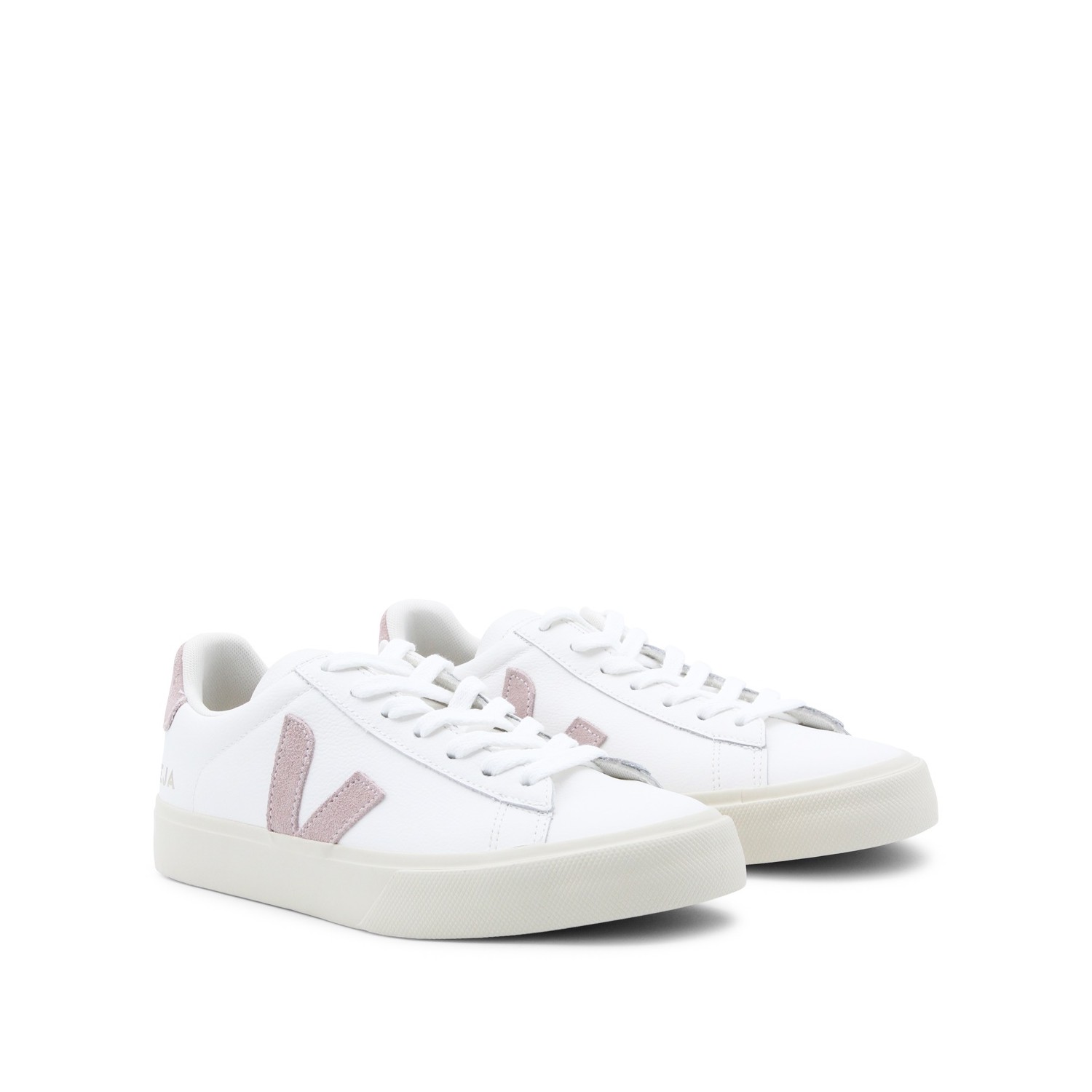 White and pink leather Campo sneakers from Veja featuring round toe, laces fastening, contrasting side logo, branded tongue and rubber sole.
