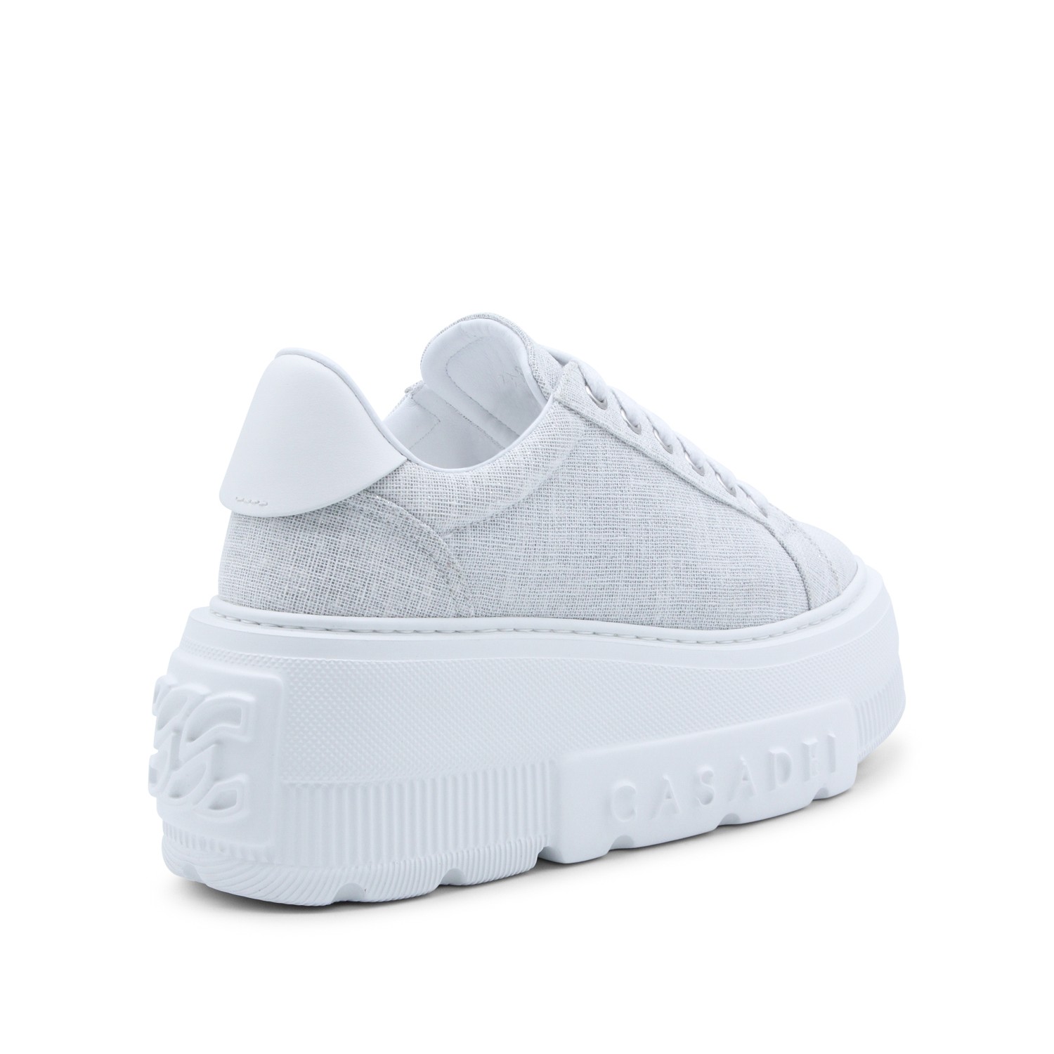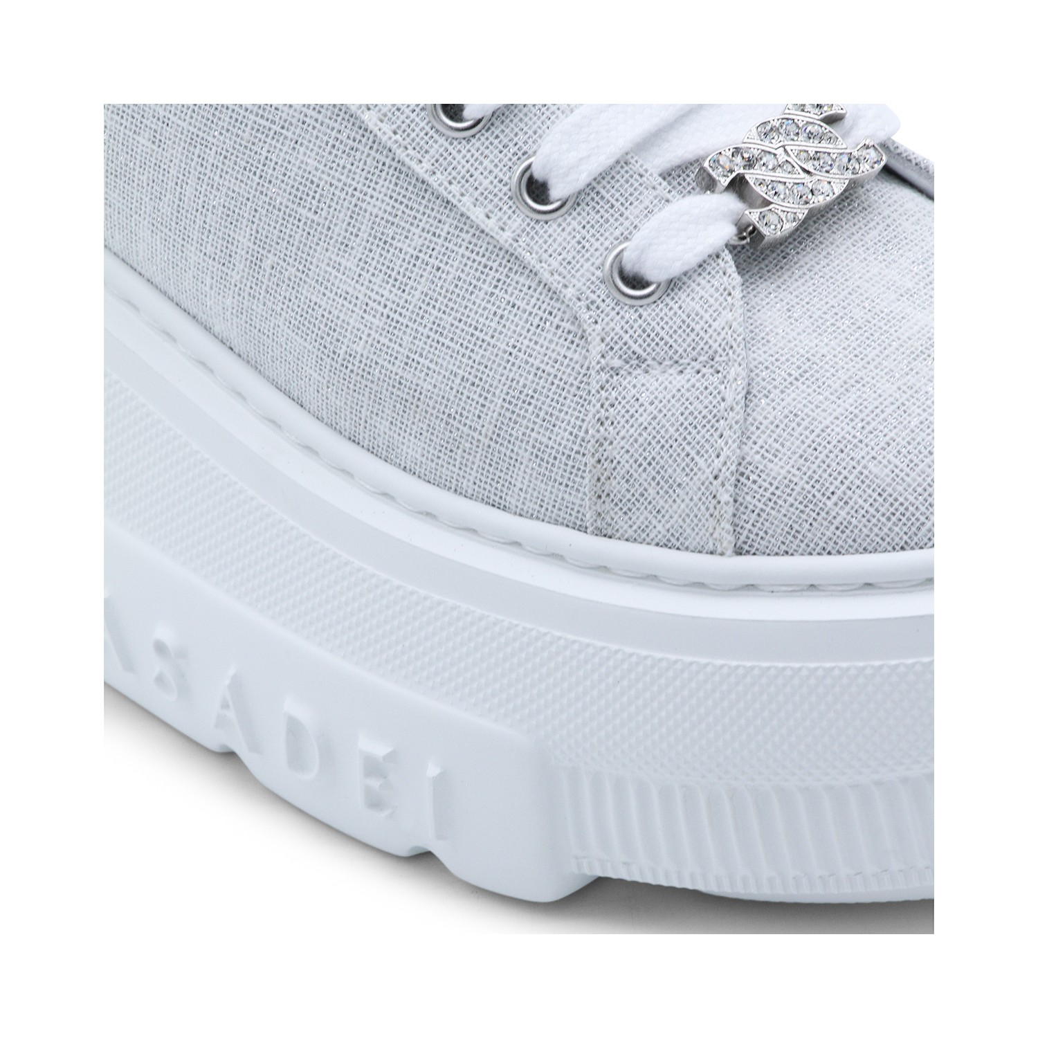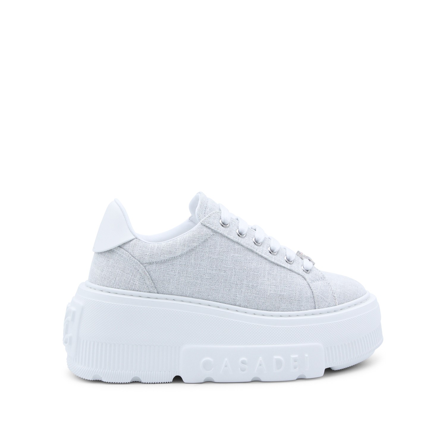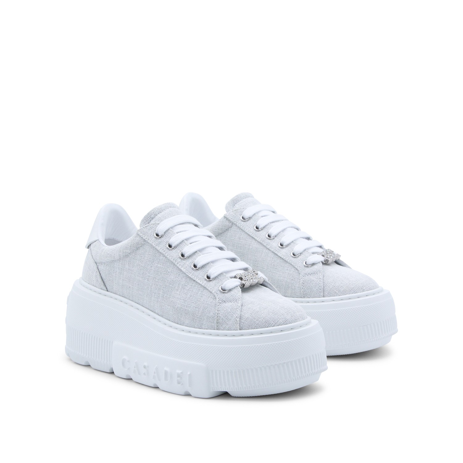 Grey leather Nexus Solar Eclipse sneakers from Casadei featuring round toe, cotton lace-up fastening, logo rhinestone-embellished metal buckle, glittery bamboo and milk fabric, rubber logo patch and rubber sole.