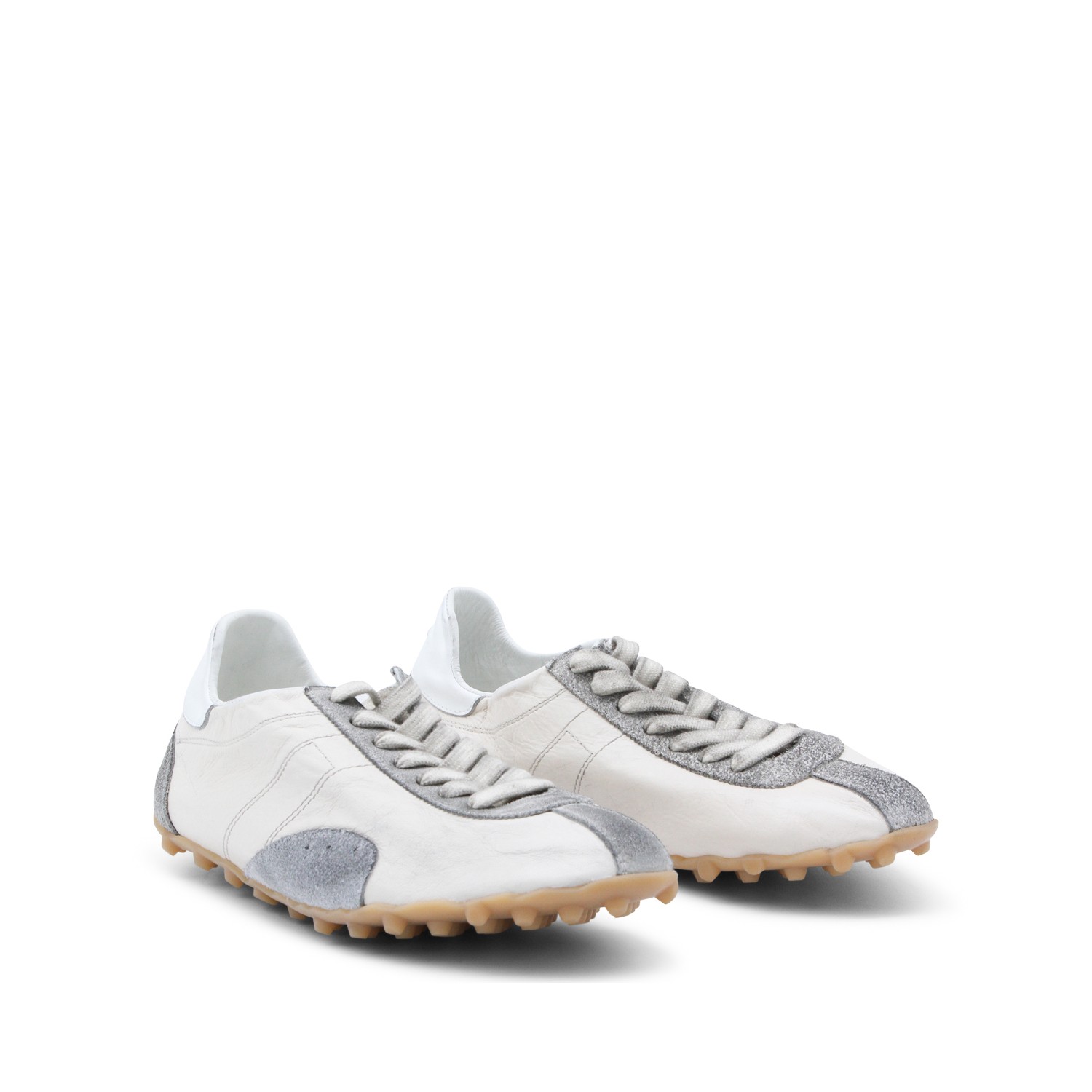 White and grey leather Sprinter Low sneakers from Maison Margiela featuring round toe, cotton lace-up fastening, central stripe, logo label on the tongue, white stitching on the back and studded rubber sole.