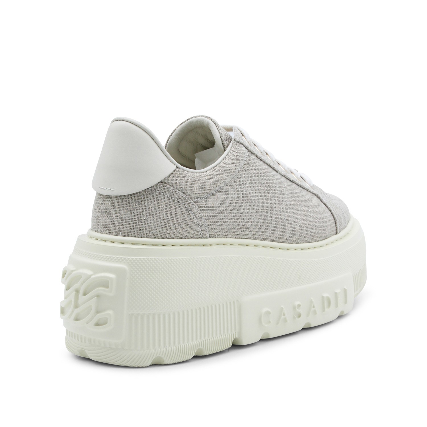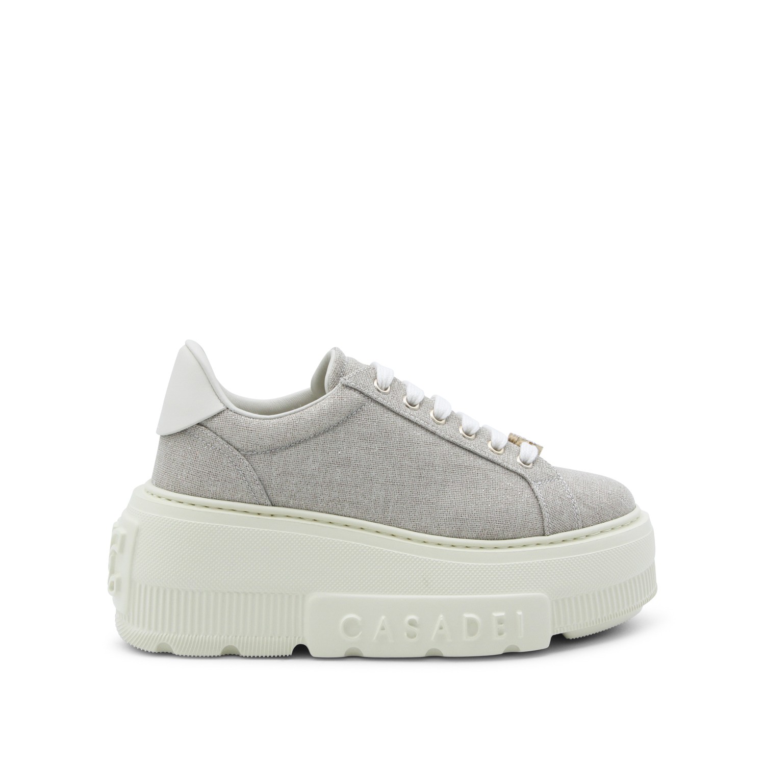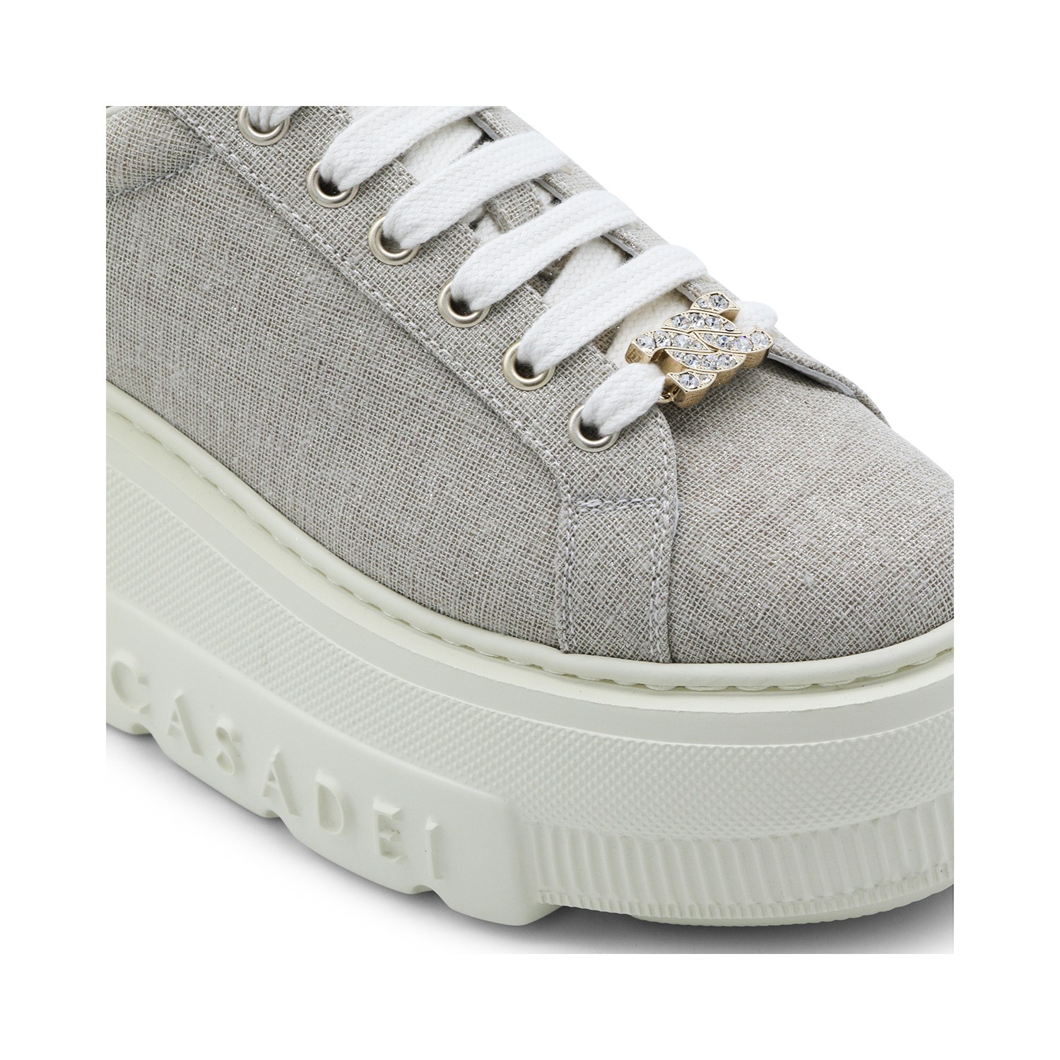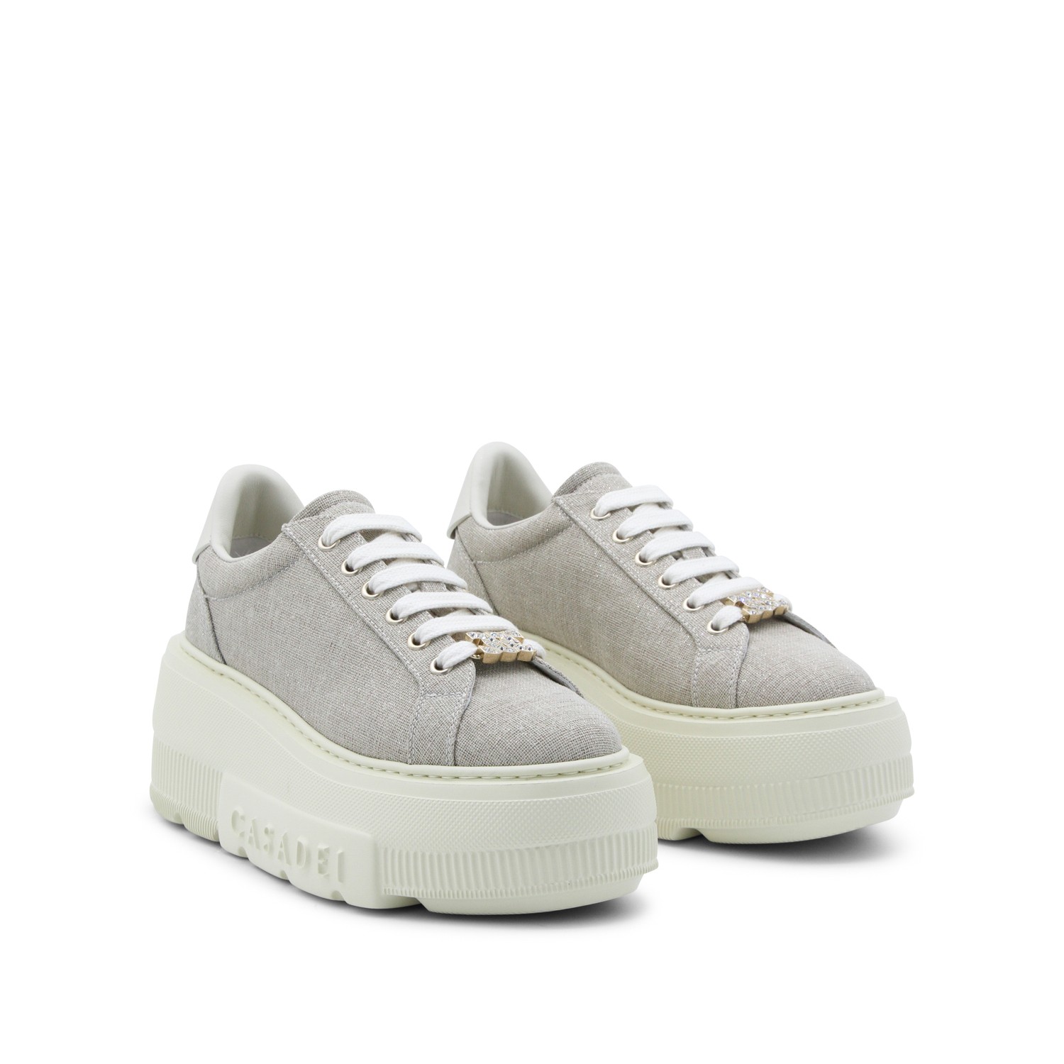 Beige leather Nexus Solar Eclipse sneakers from Casadei featuring round toe, cotton lace-up fastening, logo rhinestone-embellished metal buckle, glittery bamboo and milk fabric, rubber logo patch and rubber sole.