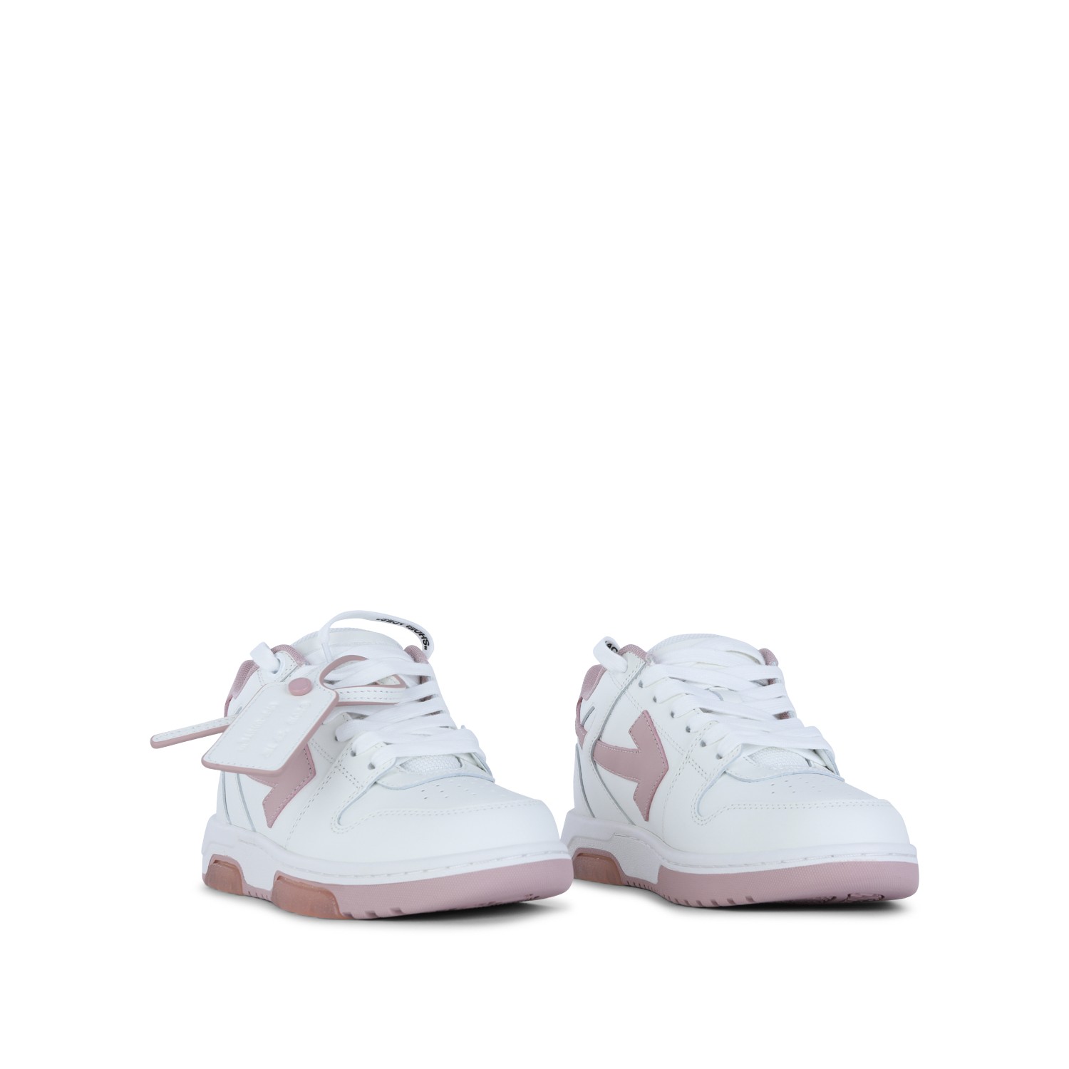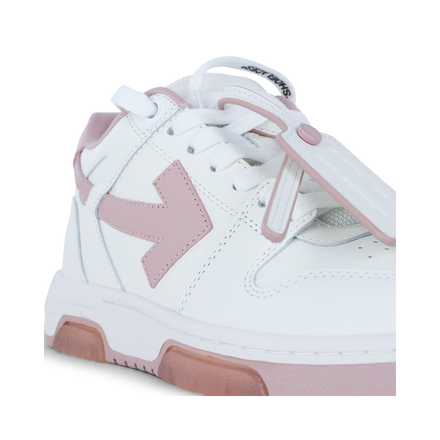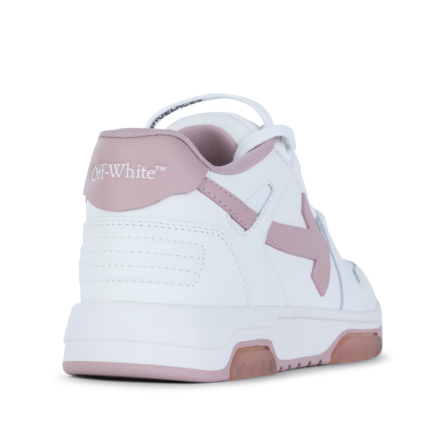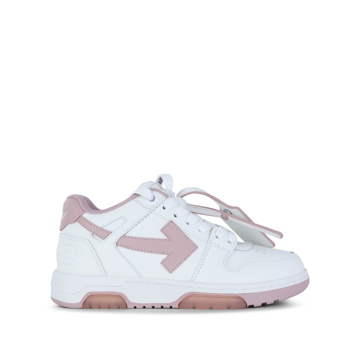 White and pink leather Out Of Office sneakers from Off White featuring cotton laces, round toe, rubber sole, contrasting Arrow detail on side, logo label and embossed logo on tongue.