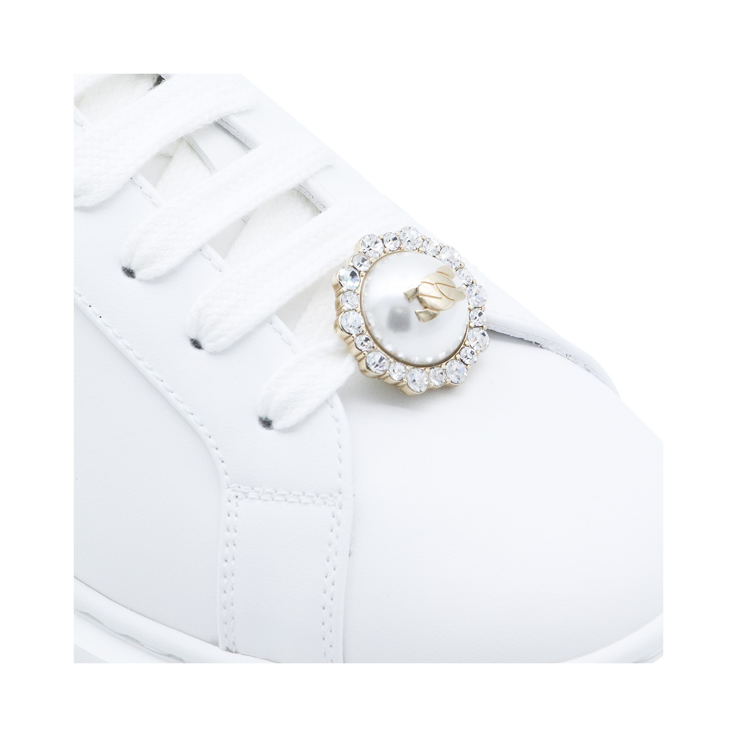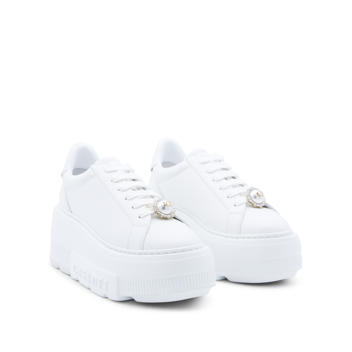 White leather Nexus sneakers from Casadei featuring round toe, cotton lace-up fastening, frotnal charm, oversize sole, platform and lateral logo.