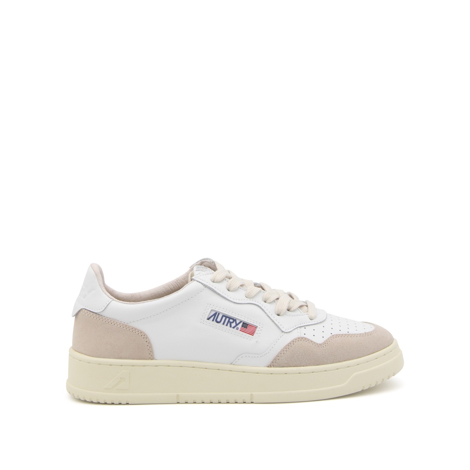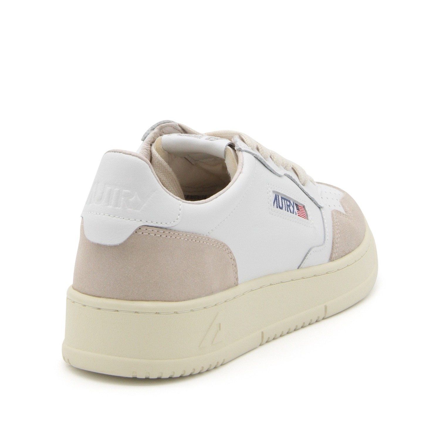 White and beige leather Action sneakers from Autry featuring a round toe, front lace-up fastening, logo patch, panelled design, branded tongue and flat rubber sole.