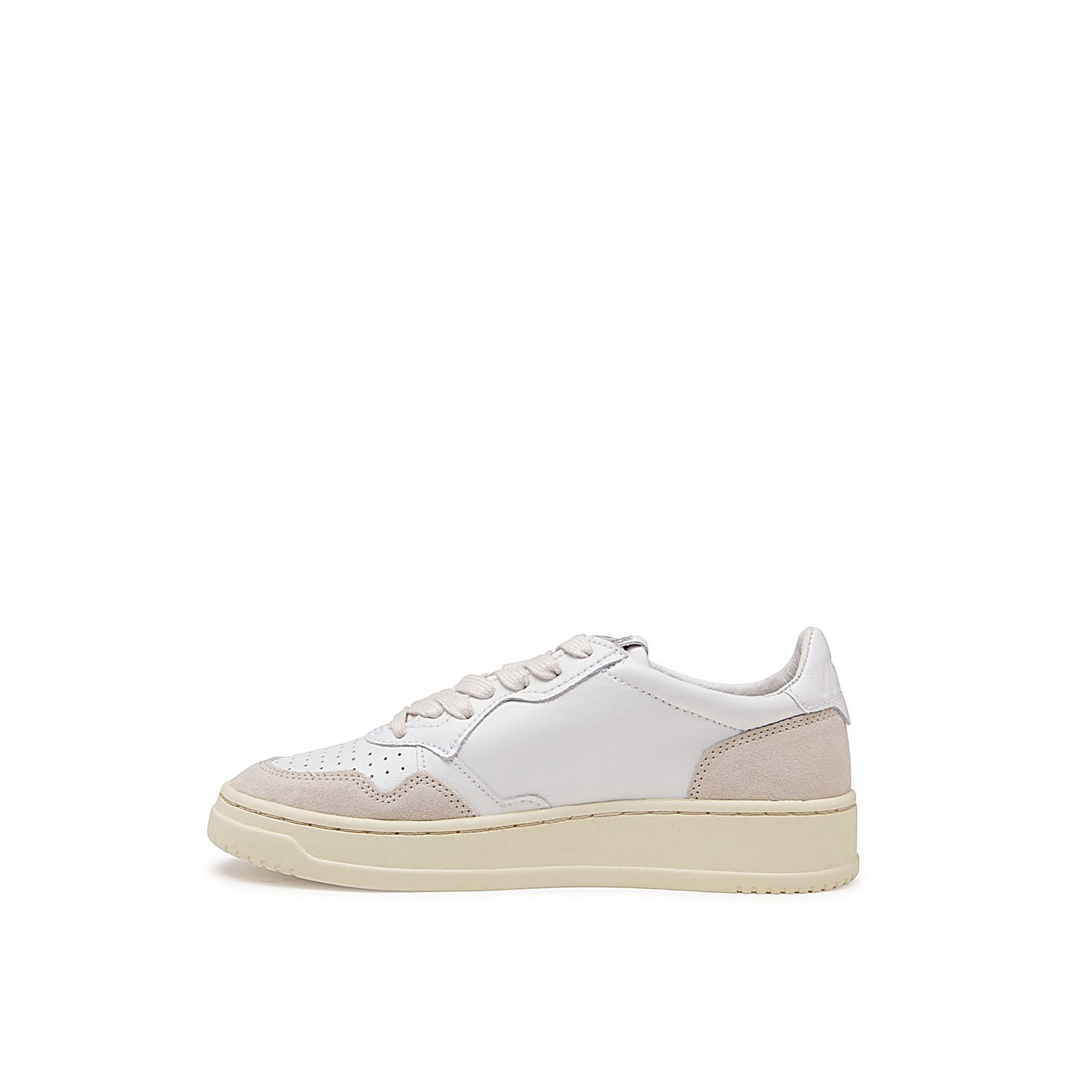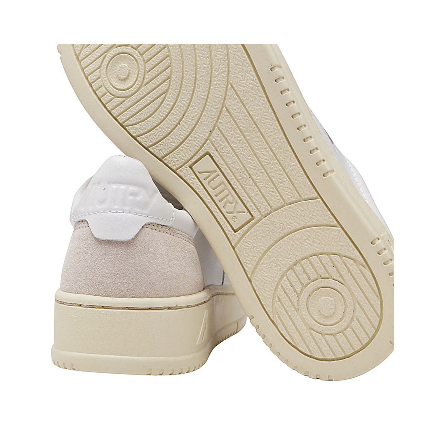 White and pink leather Medalist sneakers from Autry featuring perforated detailing, round toe, front lace-up fastening, logo patch at the tongue, branded insole and flat rubber sole.
