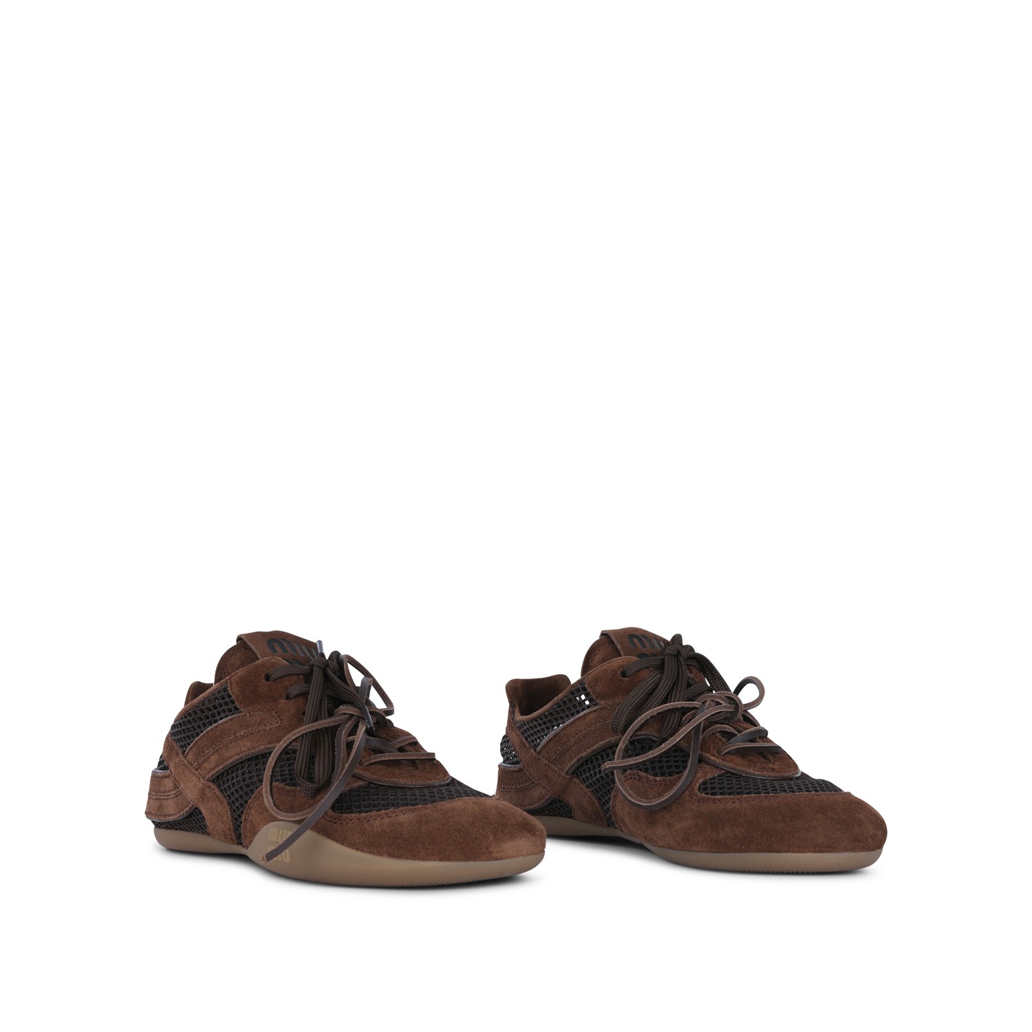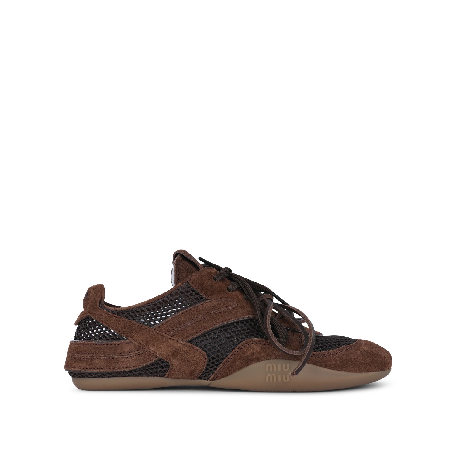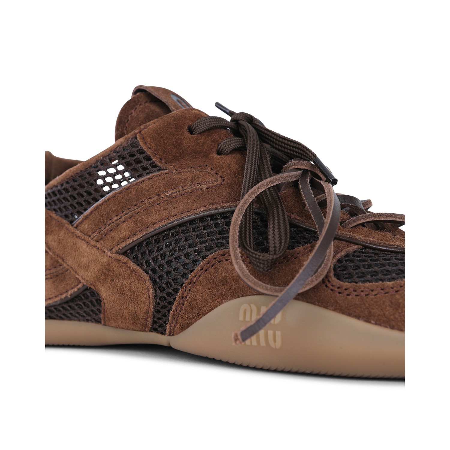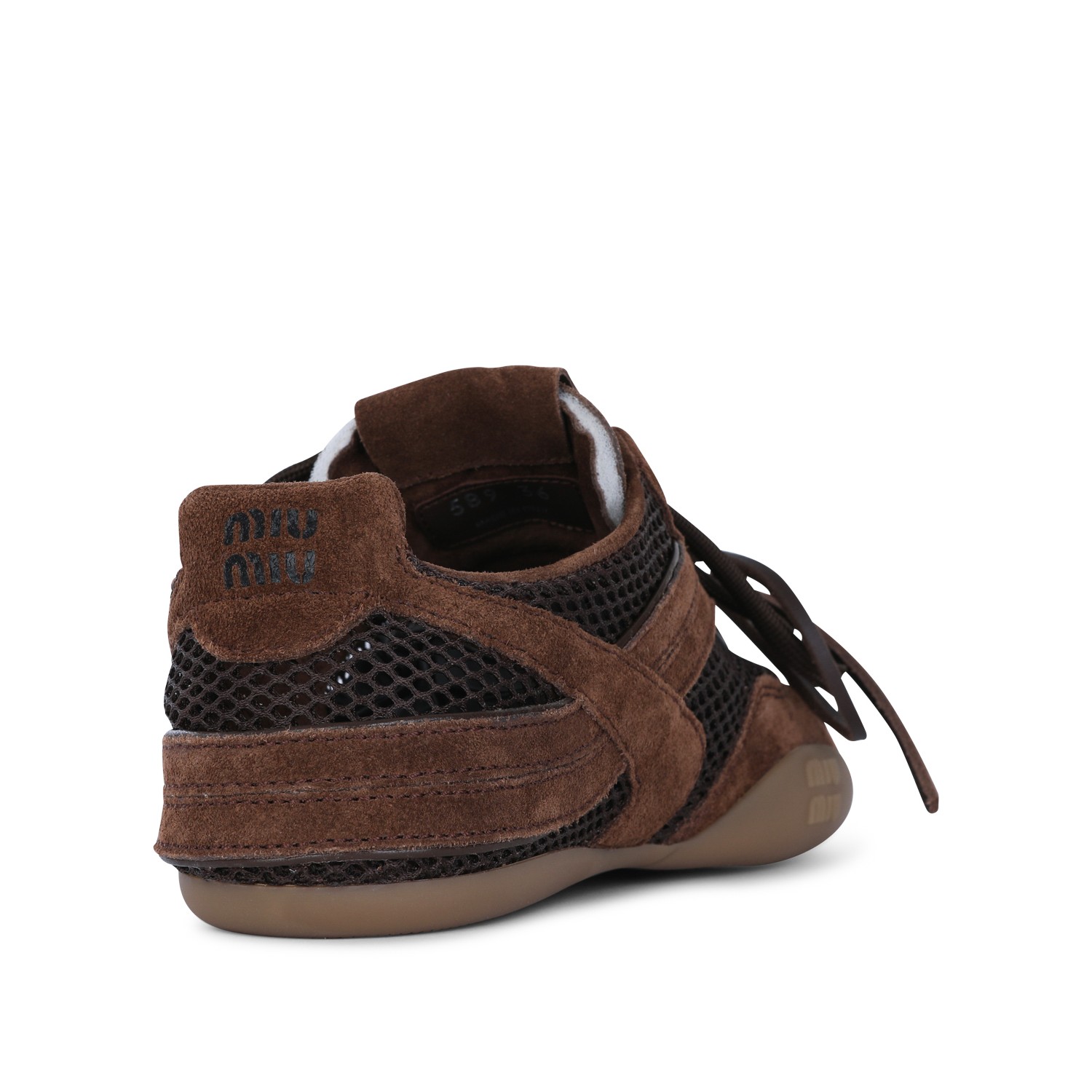 Brown leather sneakers from Miu Miu featuring round toe, laces fastning, mesh deatils, branded insole and rubber sole.