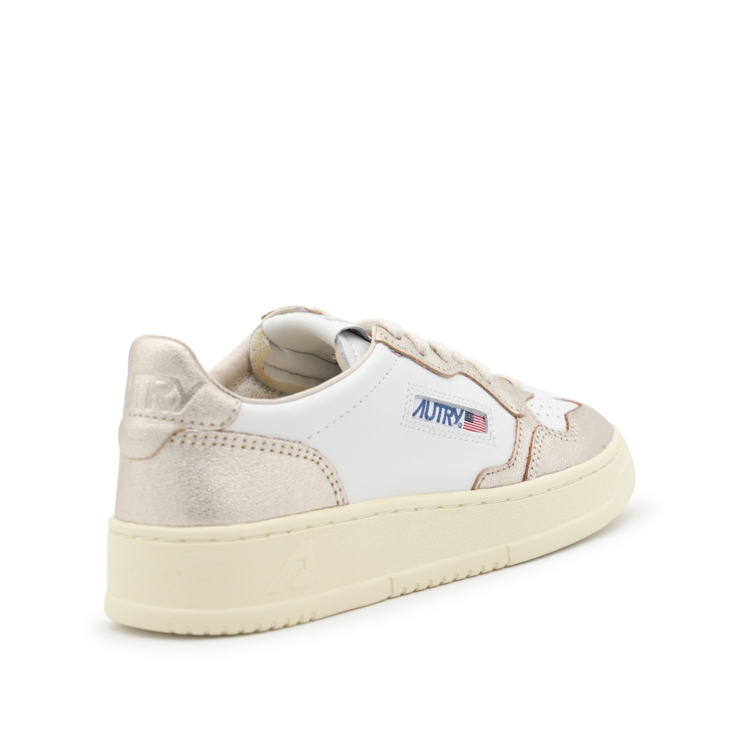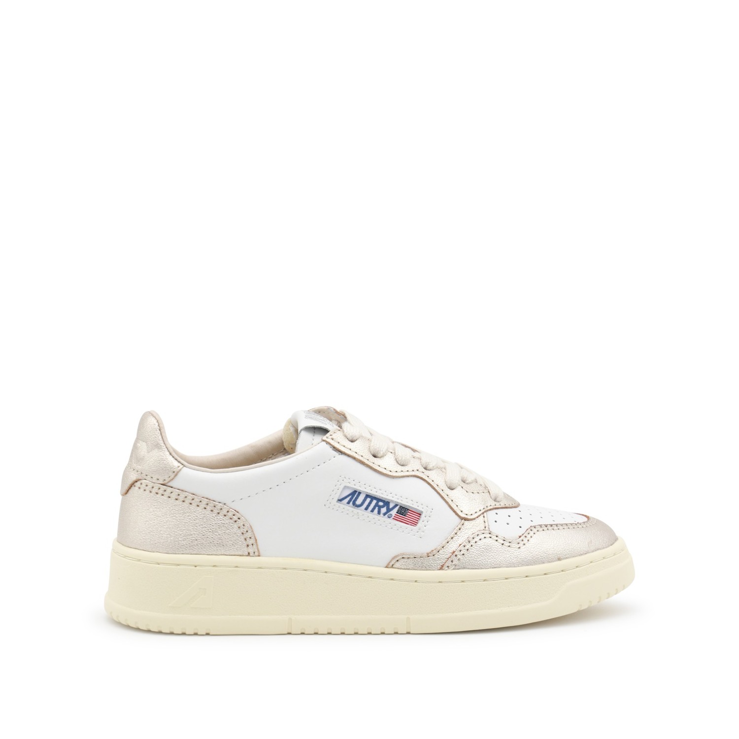 White and gold leather sneakers from Autry featuring round toe, front lace-up fastening, panelled design, logo print to the side, branded tongue and flat rubber sole.