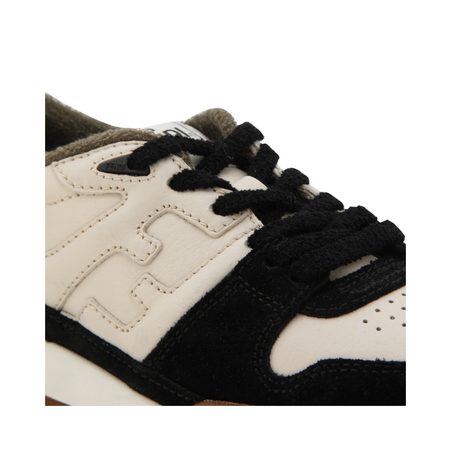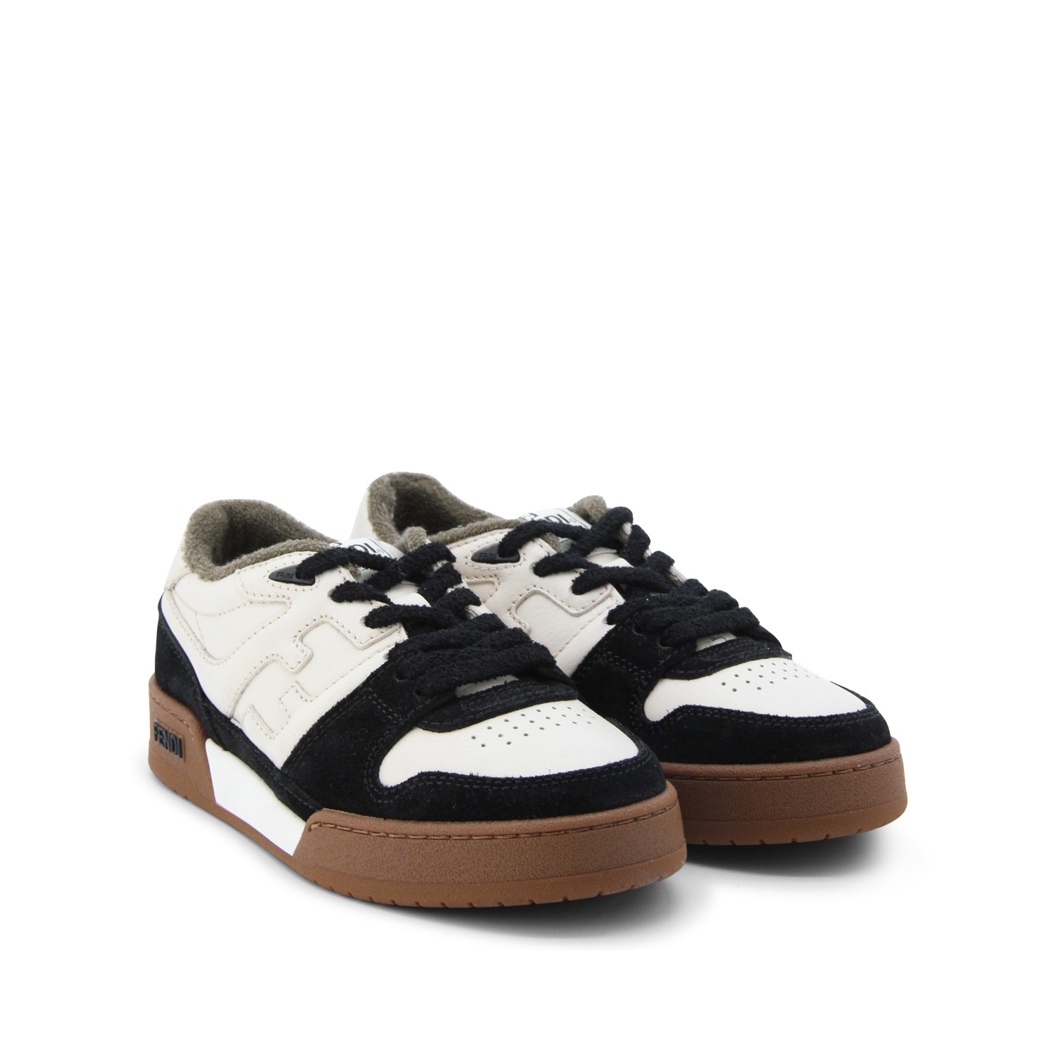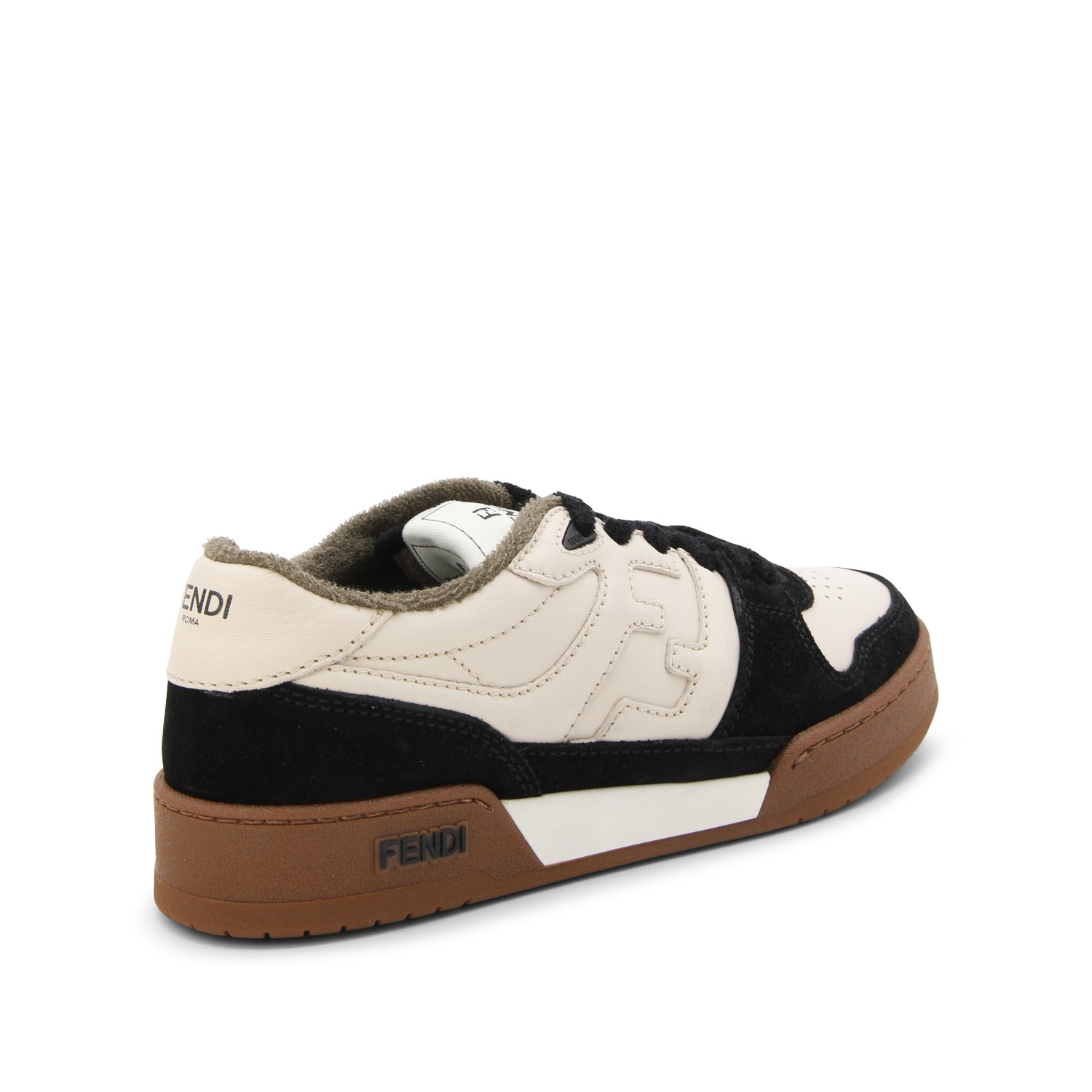 Black and milk sneakers from Fendi featuring round toe, lace up fastening, lateral logo, contrasting detail and rubber sole.